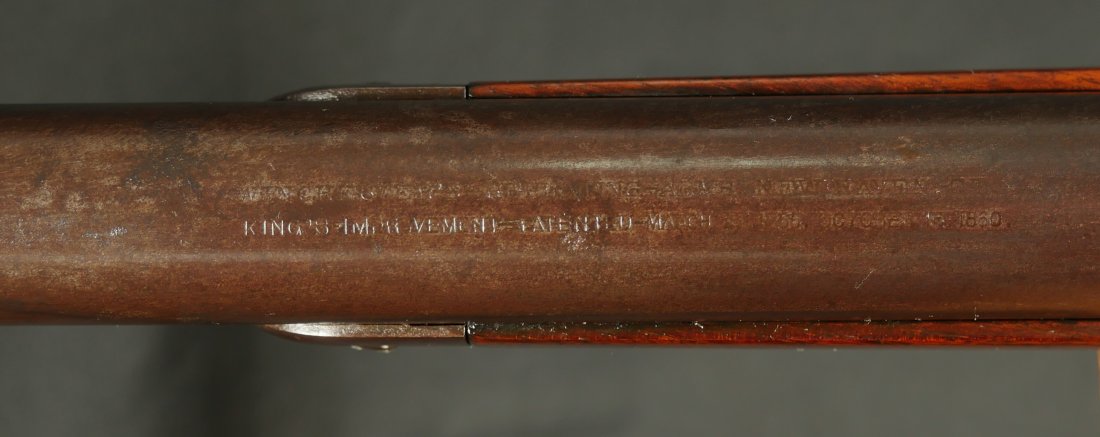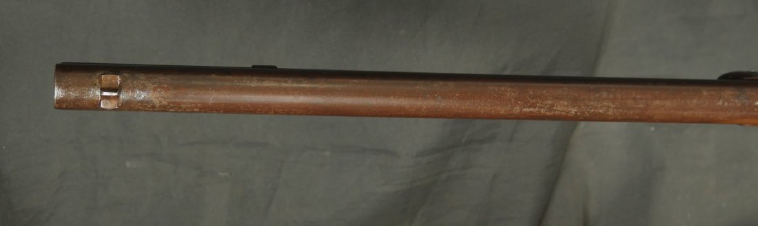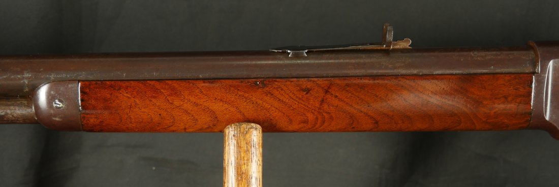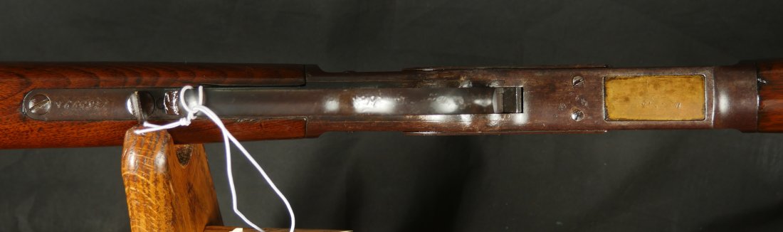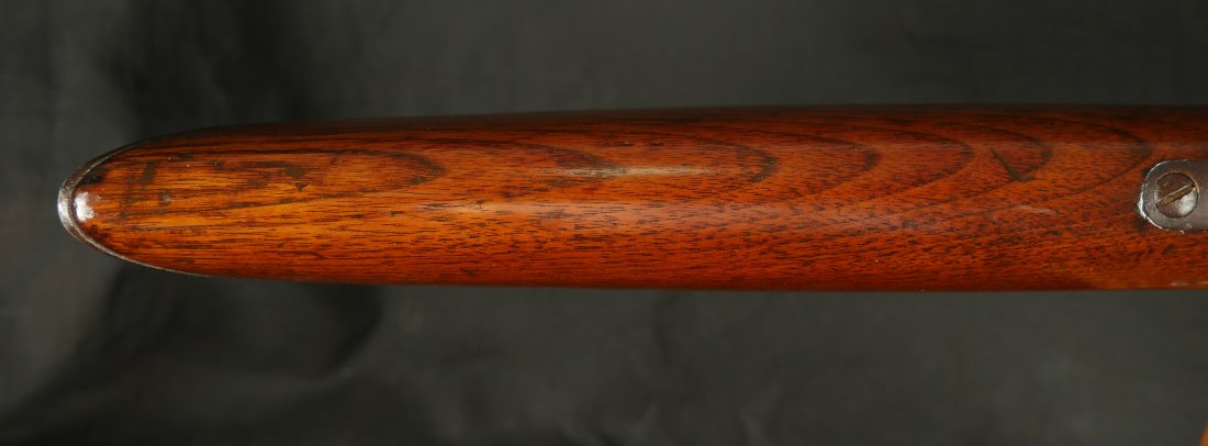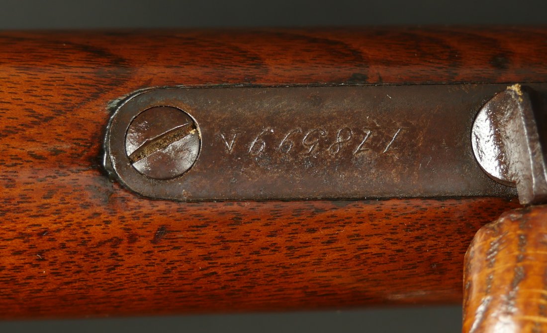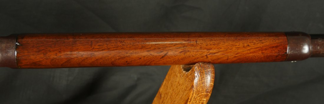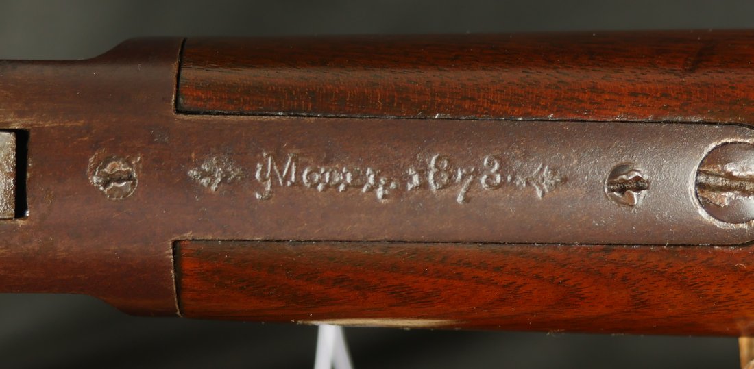 079-0126-9371, Winchester M-1873 Round Barrel Rifle in 44-40, #118xxx made in 1883. The gun shows about 50% medium blue fading to brown overall. Crisp markings, crisp action. The wood to metal fit is excellent with very light use marks to the wood. Small patches of thin residue on the exterior of the gun overall. A couple screws have light slot damage. The bore is strongly rifled with very fine areas of surface residue. Fine exterior, very good to fine bore. Fine overall.