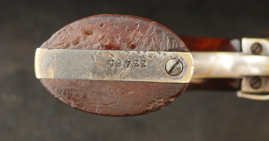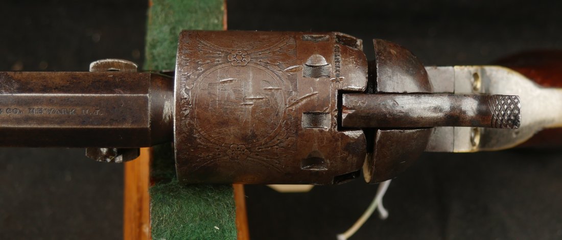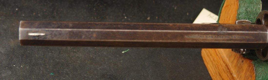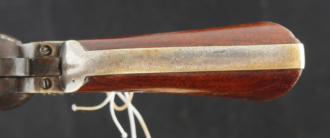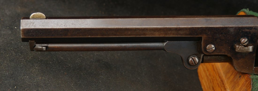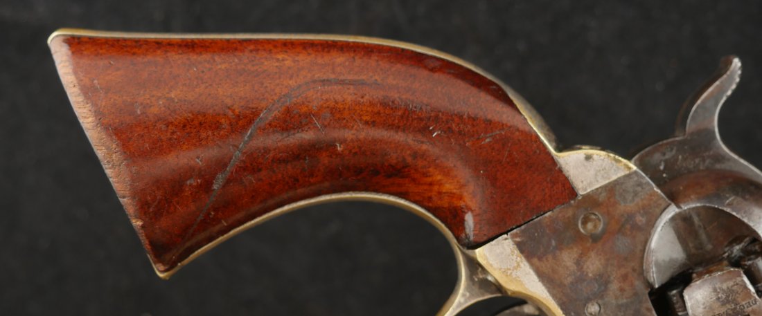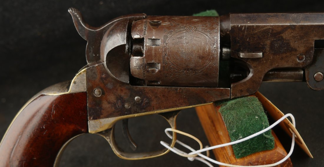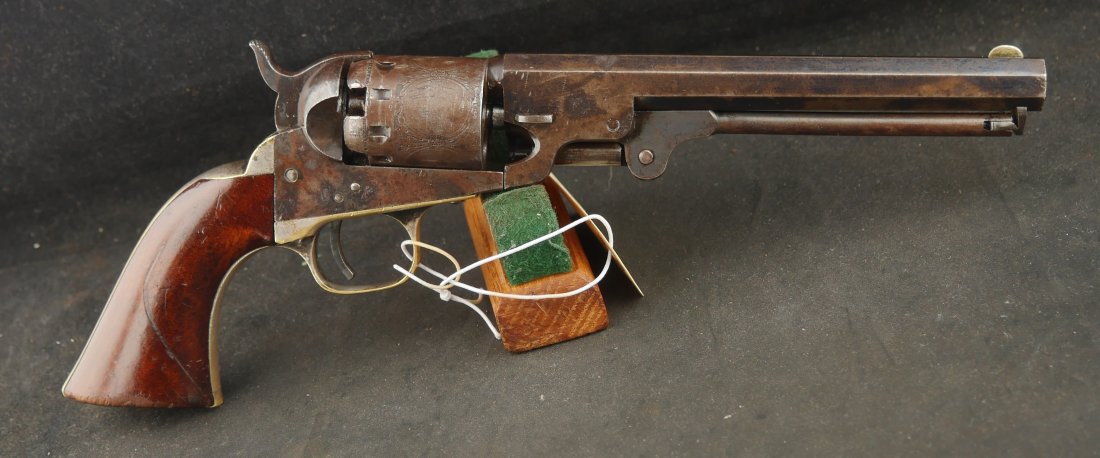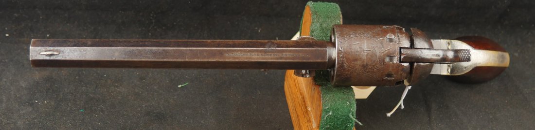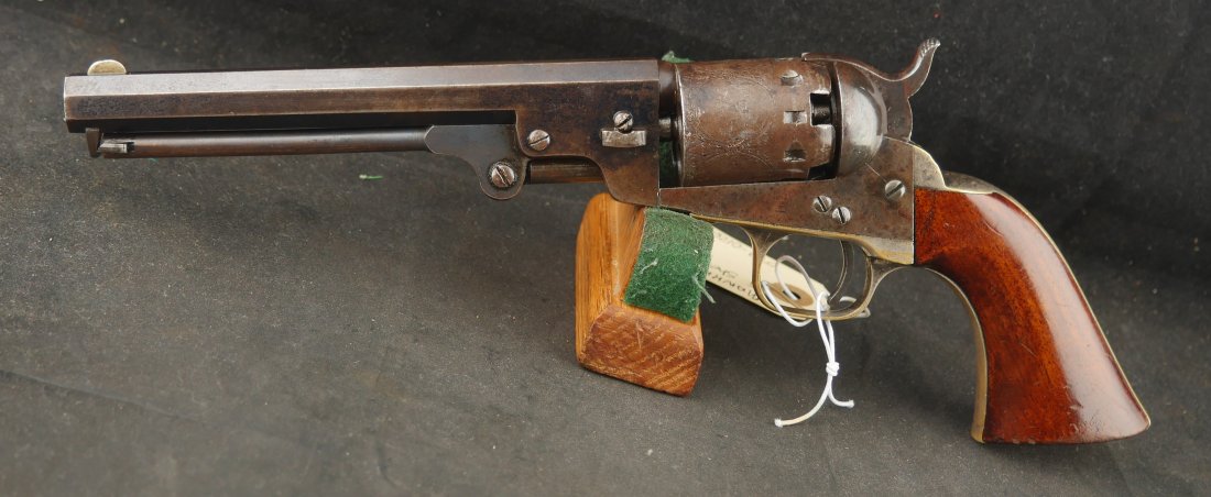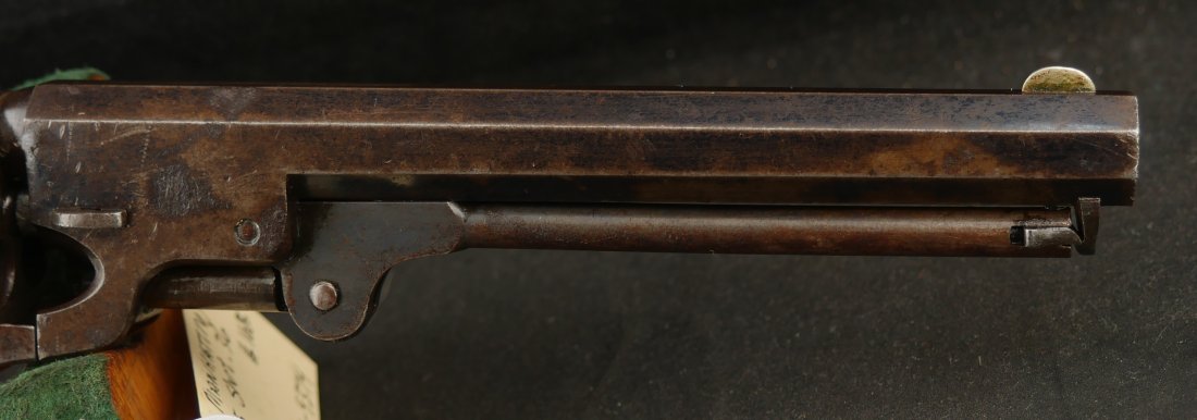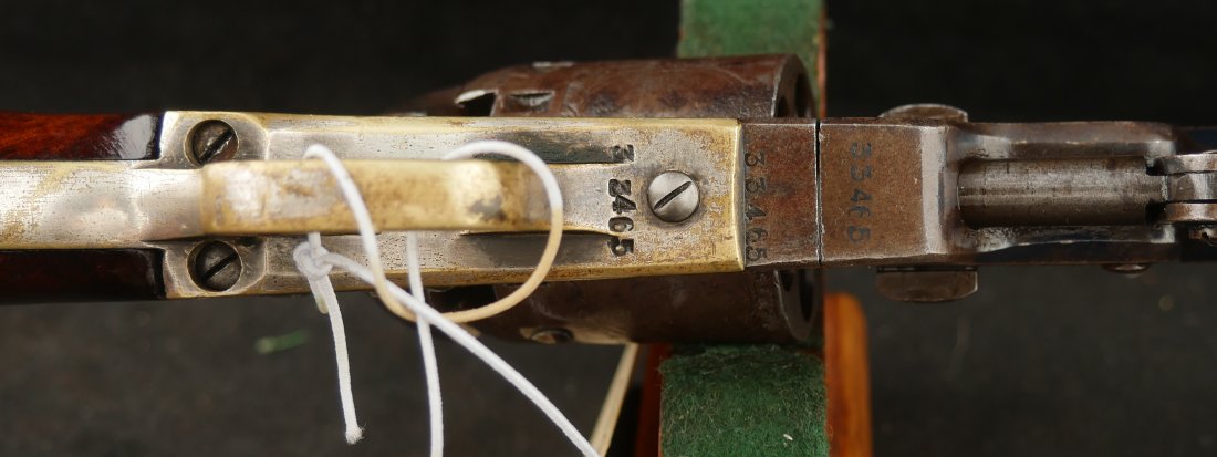 079-0126-9374, Manhattan Navy with long 6 1/2 inch barrel Type IV. #33xxx matching on the bottom of the gun. 70% deep blue on the barrel, the cylinder shows 90% strong scene. The brass retains 70% silver with 60% original varnish on the grips and showing light bottom edge loss. The frame shows 20% toned case color with hints of rainbow hues on the frame and lever. Scattered moderate bumps and dings to the gun, mostly on the cylinder. Crisp edged rifling with medium spots of pitting scattered about the bore. Fine overall. Crisp functional mechanics.