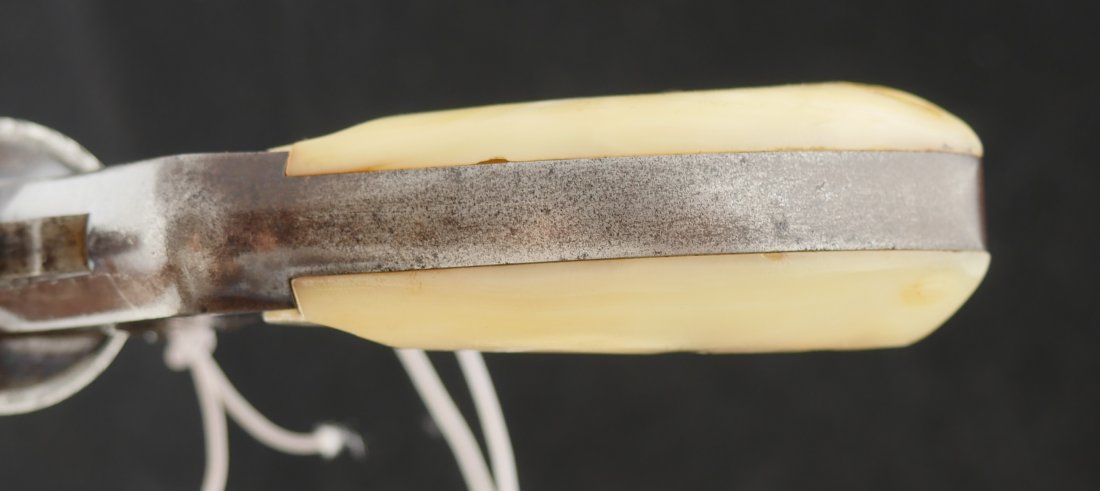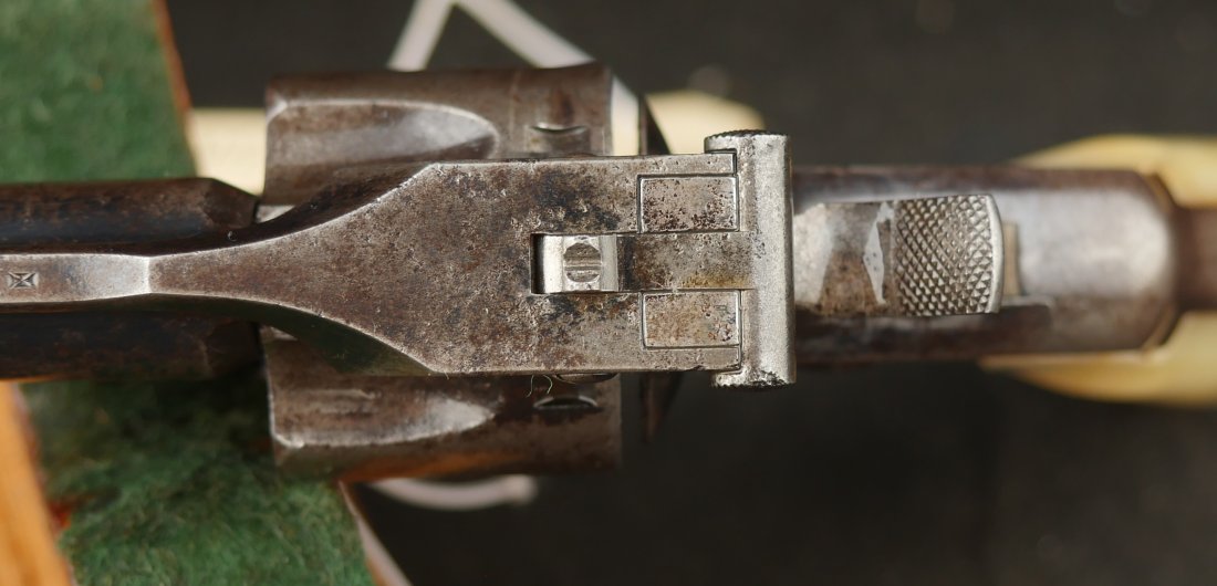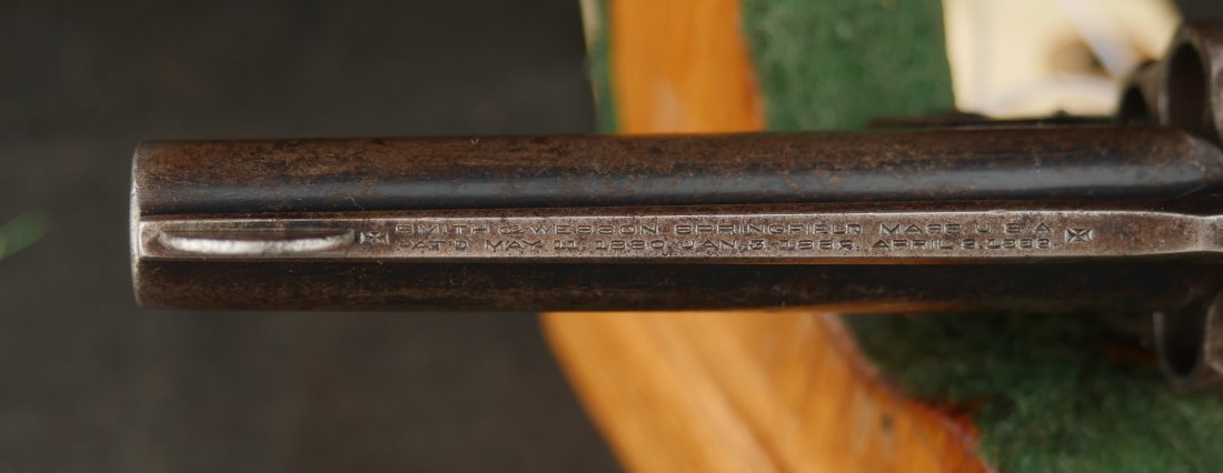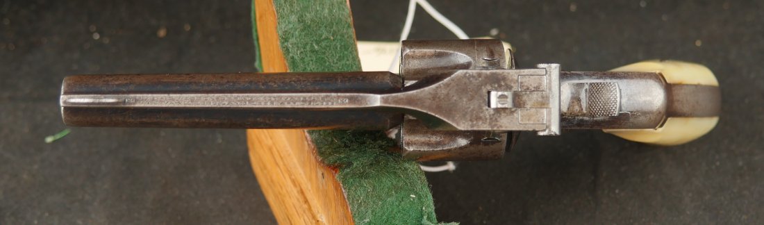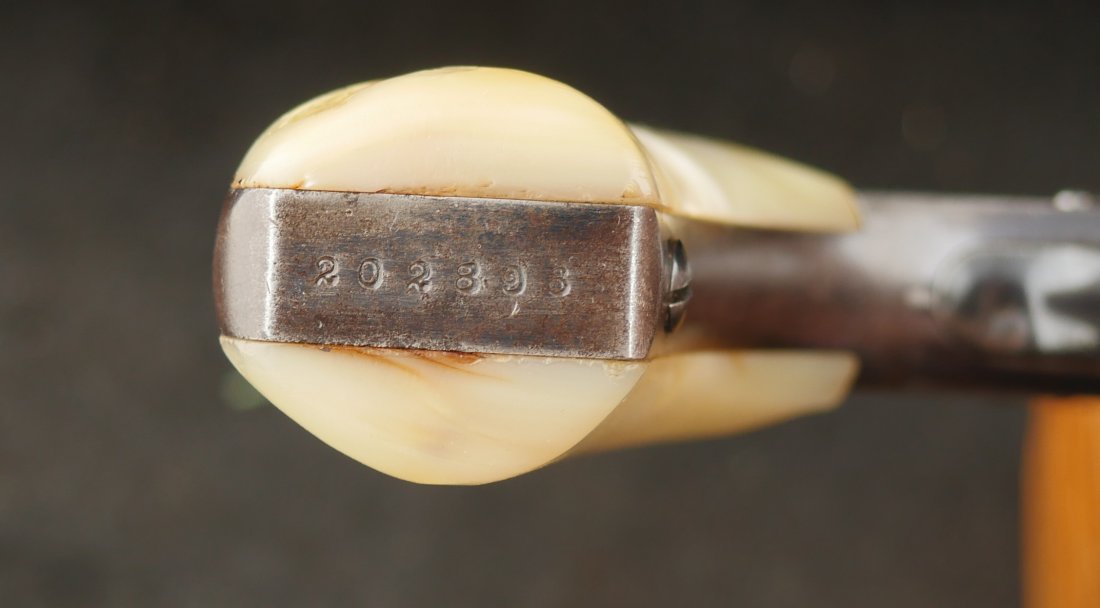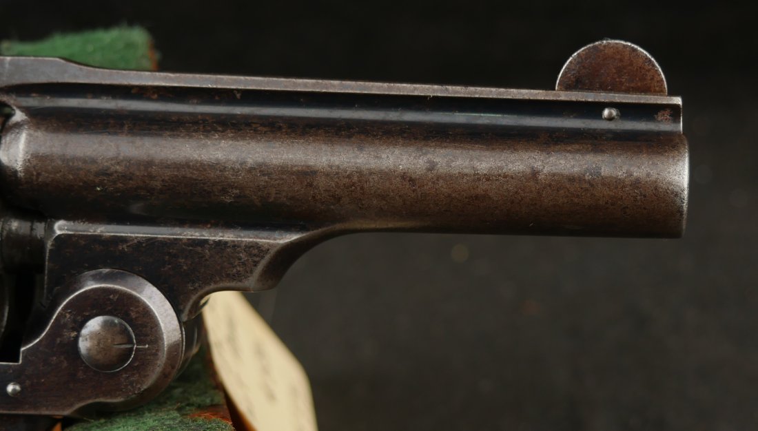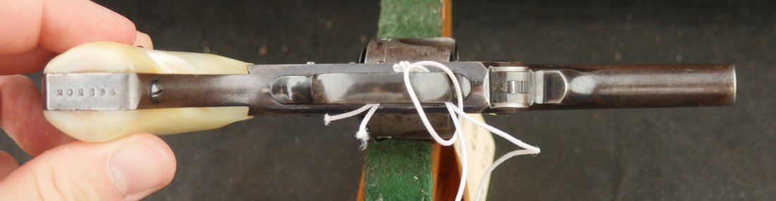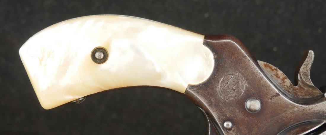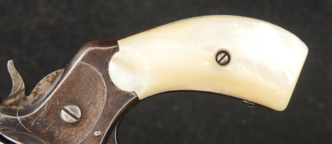 079-0126-9375, Smith and Wesson .32 CF, 5 shot with 50% blue with scattered rub spots overall. The original pearls are in find condition. The action functions in both DA and SA. The bore is bright with crisp rifling and scattered spots of surface residue.