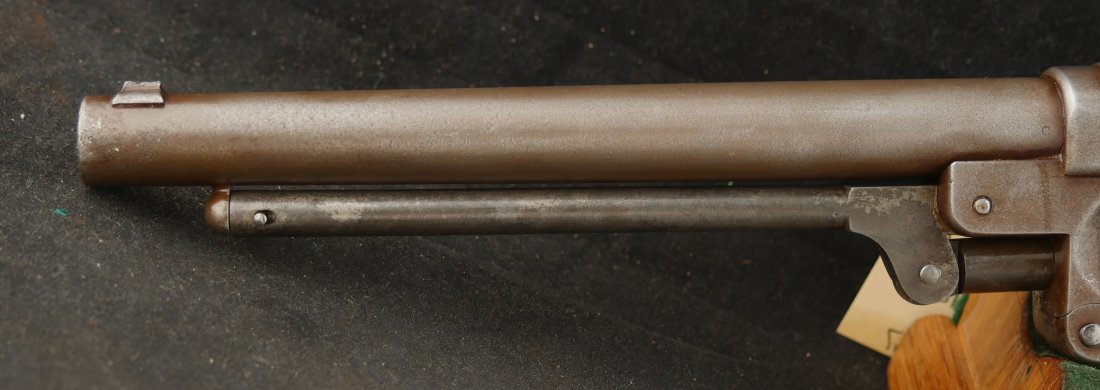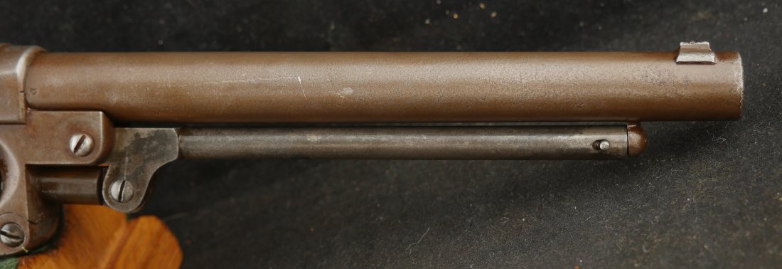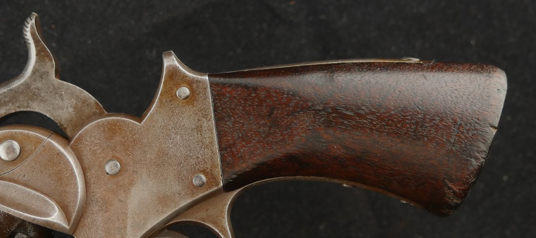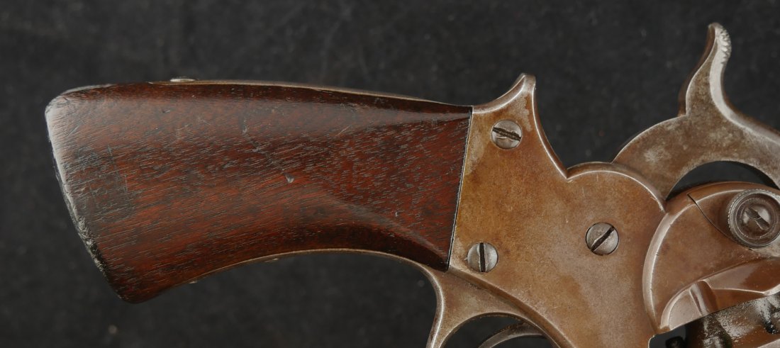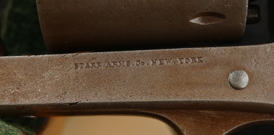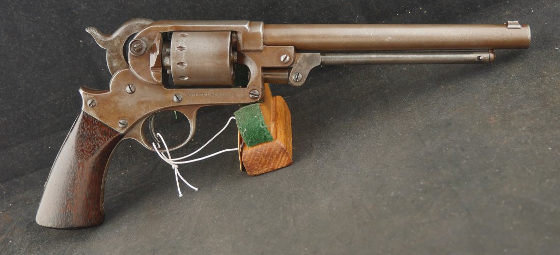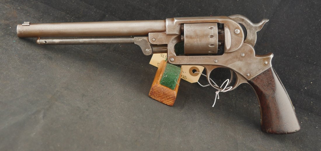 079-0126-9377, Starr SA .44 Army, 6 shot, #26xxx matching on three visible numbers. The exterior is smooth gray with clear markings and 2 visible cartouches with wear on bottom edge of one cartouche. The action is crisp and locks up tight. The bore show wear in rifling and fine surface residue and a couple of large patches of shallow pits. These were the third most used gun of the Civil War and with the solid top strap an accurate weapon. Very good exterior, good bore.