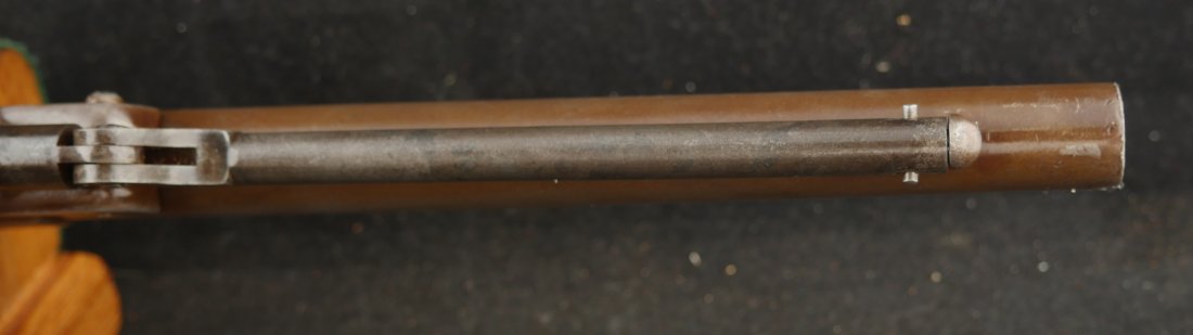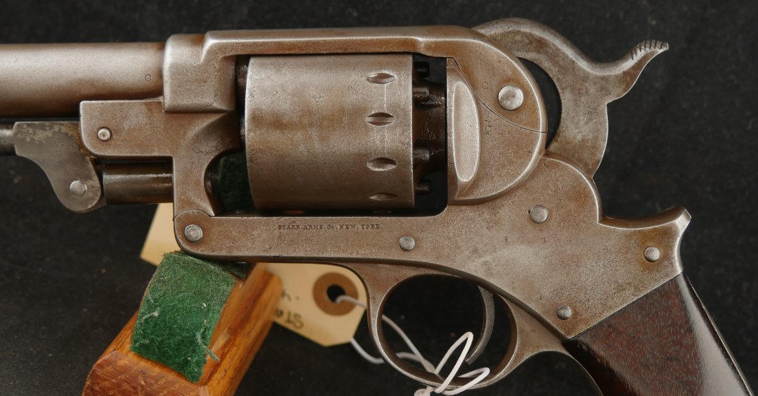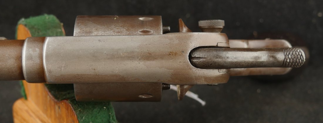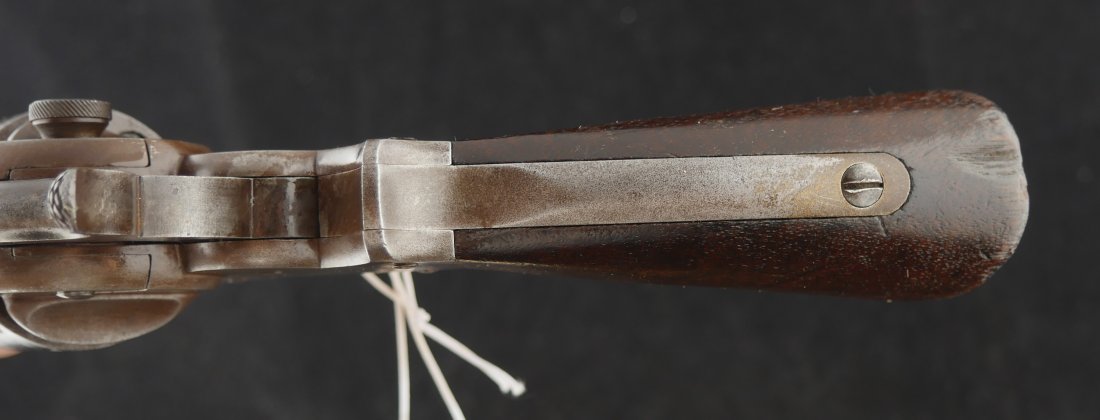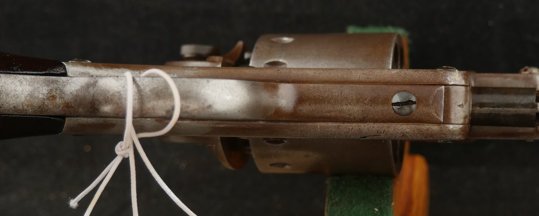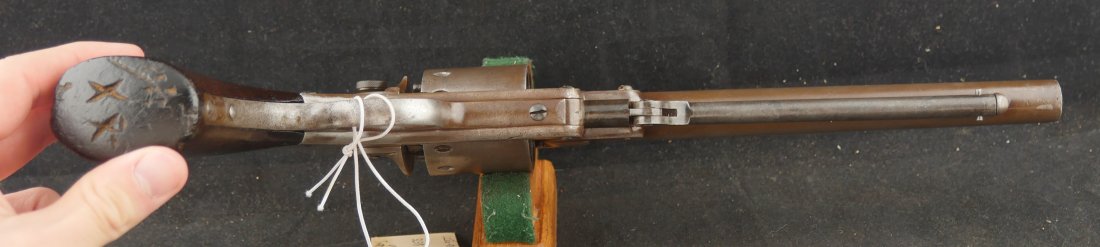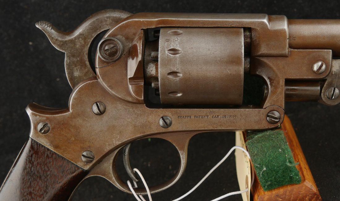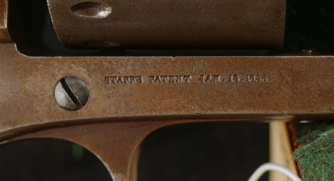 079-0126-9377, Starr SA .44 Army, 6 shot, #26xxx matching on three visible numbers. The exterior is smooth gray with clear markings and 2 visible cartouches with wear on bottom edge of one cartouche. The action is crisp and locks up tight. The bore show wear in rifling and fine surface residue and a couple of large patches of shallow pits. These were the third most used gun of the Civil War and with the solid top strap an accurate weapon. Very good exterior, good bore.