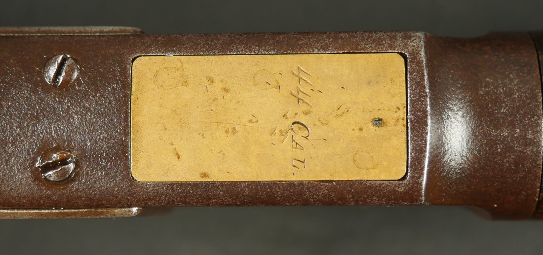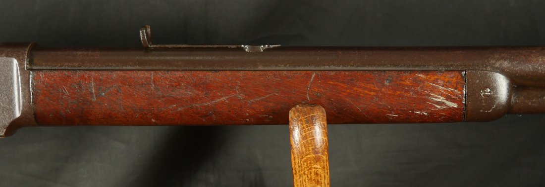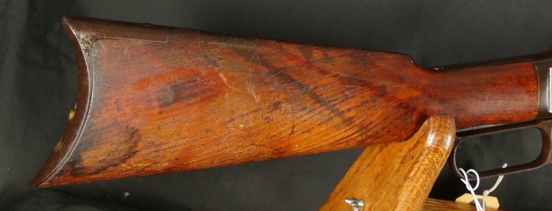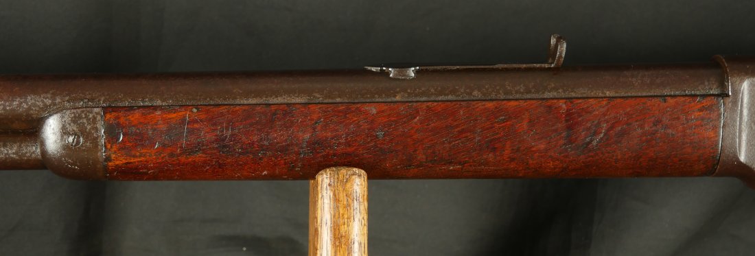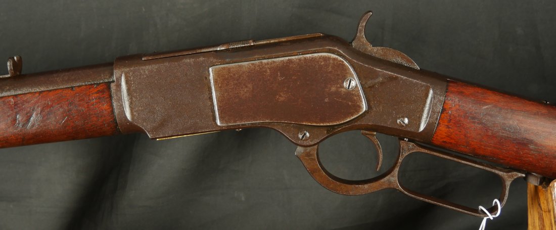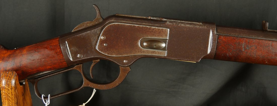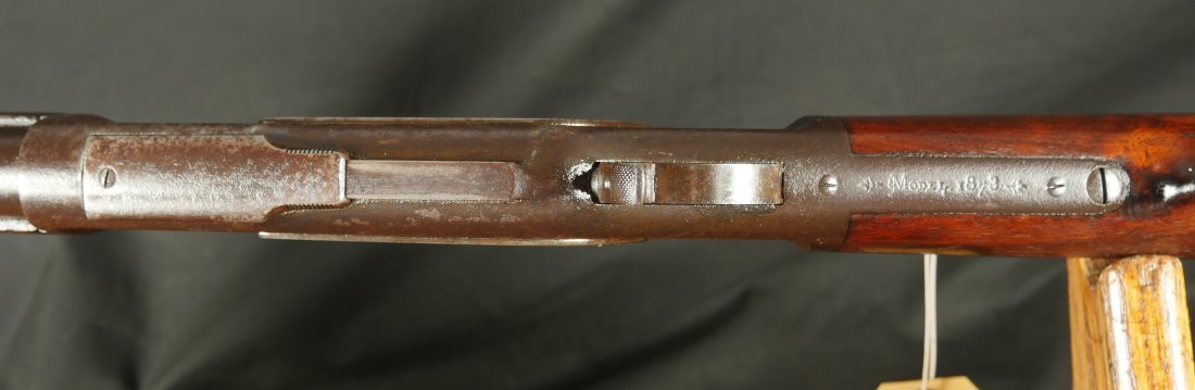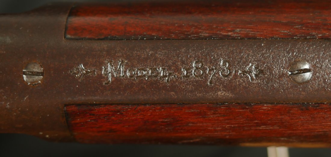 079-0126-9380, Winchester M-1873 3rd Round Barrel Rifle in 44-40, #179xxx made in 1885. With dark overall chocolate patina with spots of fine surface residue scattered about the metal parts. Fine wood to metal fit, clear markings, functional mechanics. The bore shows strong rifling with shallow scattered spots the entire length of the bore. The bore is shootable.