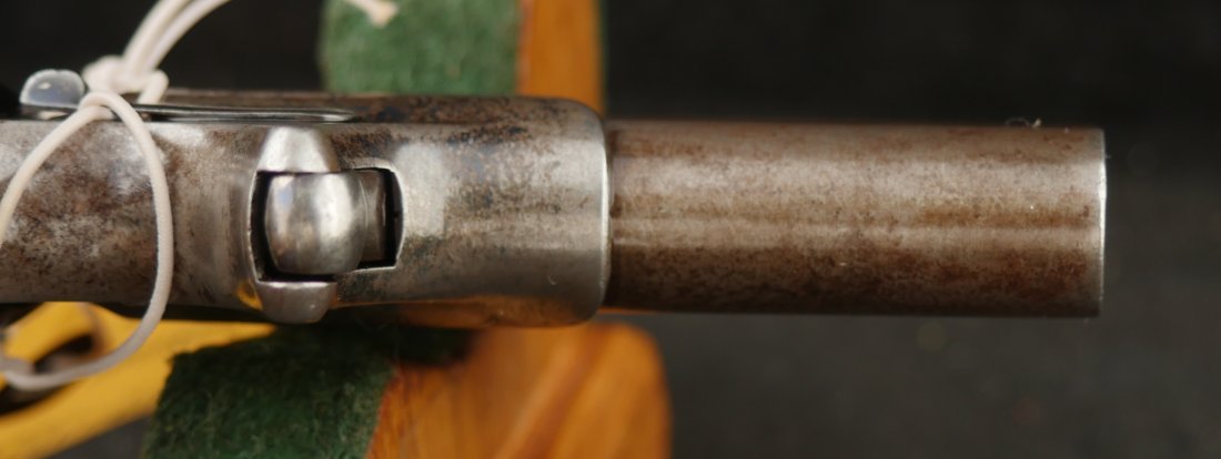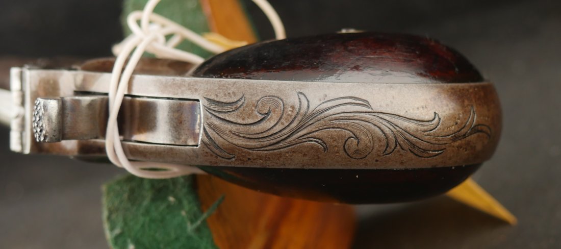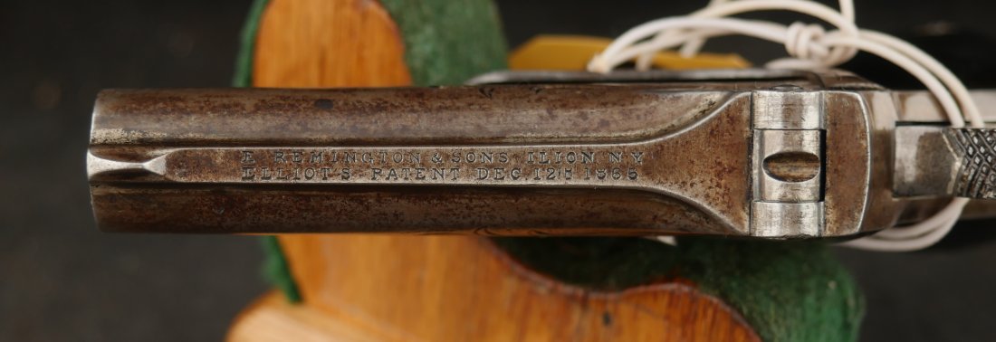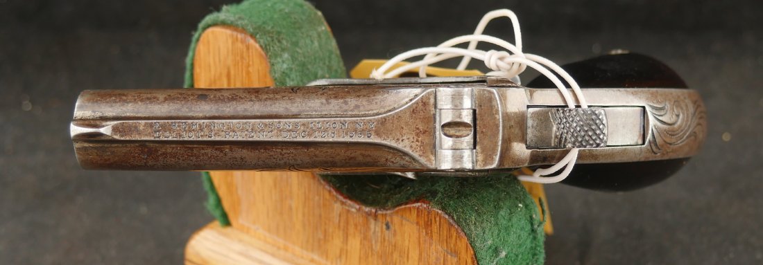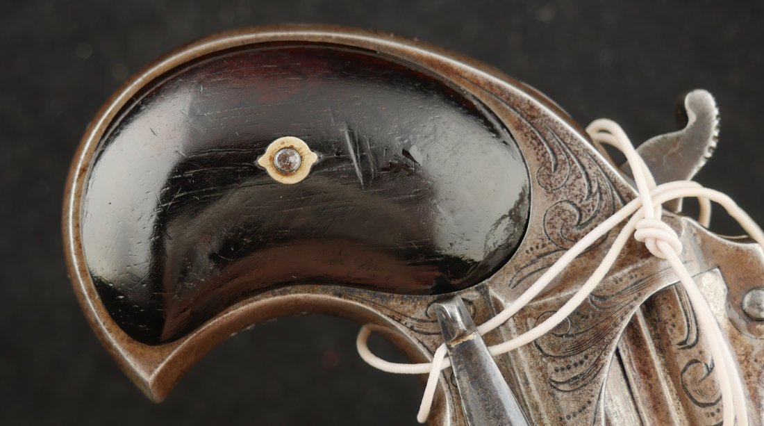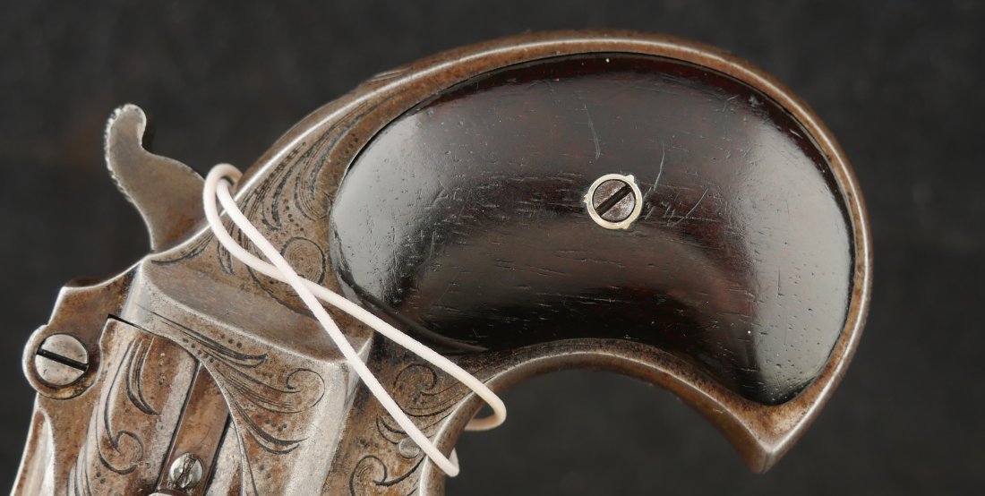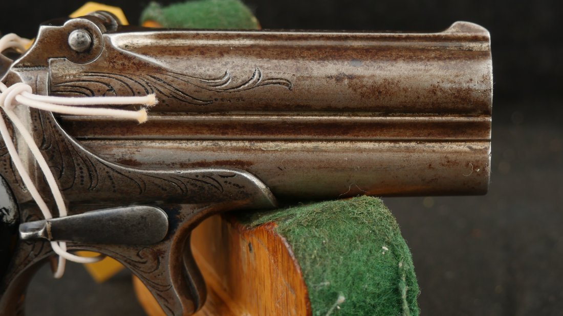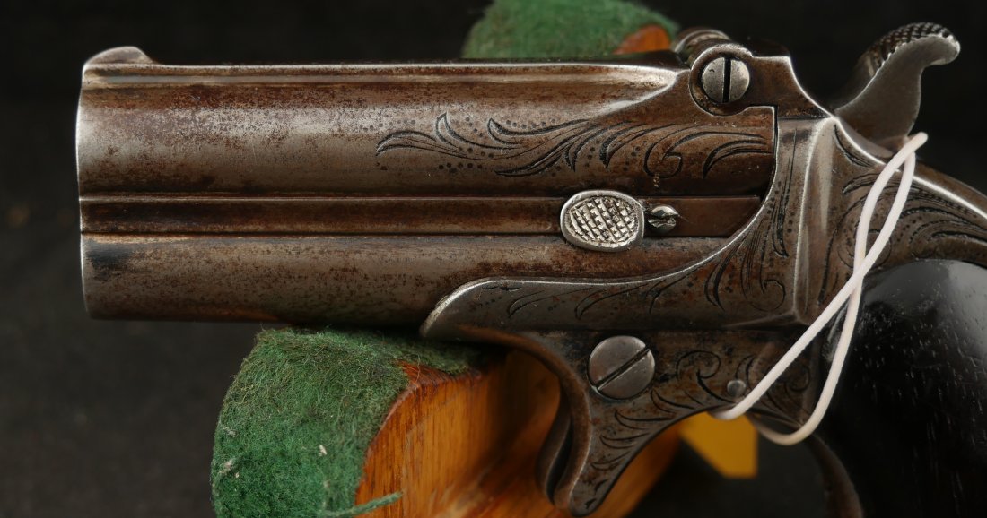 079-0126-9391, Factory Engraved Remington Double Deringer .41 RF, with early 2 line barrel address. Factory engraved with flashes of medium blue in protected places. The hinges have no cracks and the hinge is tight. Crisp tight action, this is early model, very hard to find with factory engraving and 2 line barrel address. Scattered spots of residue and a few fine spots. Very good to fine overall.