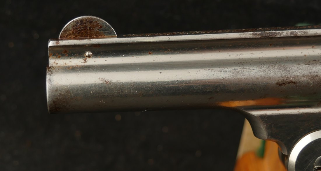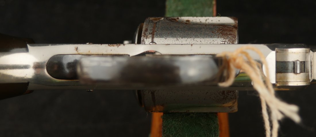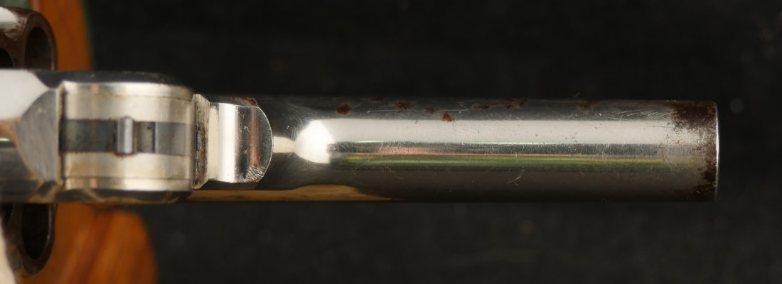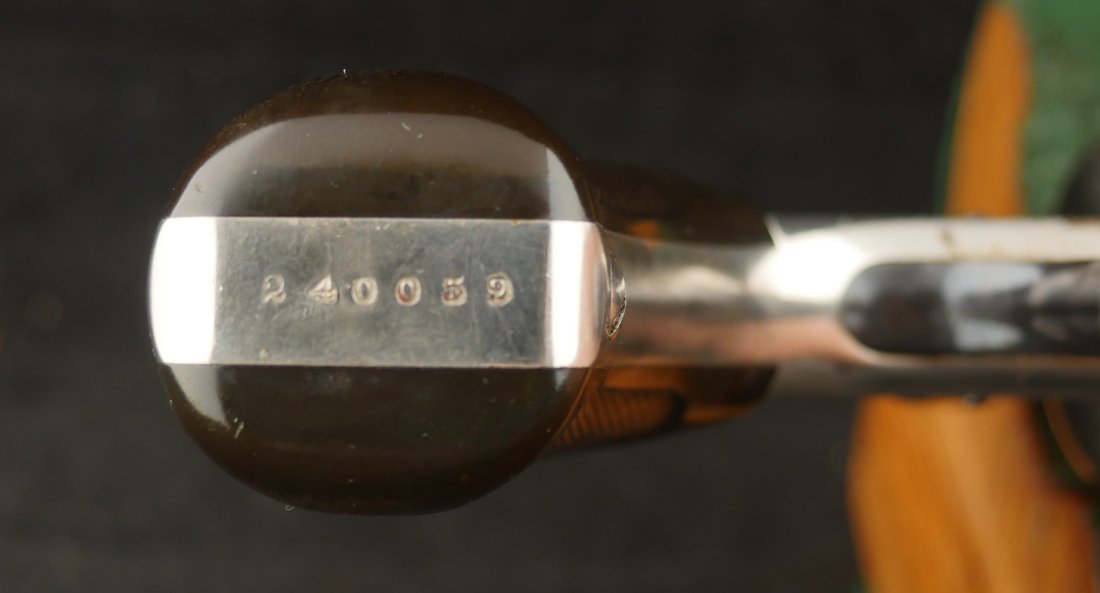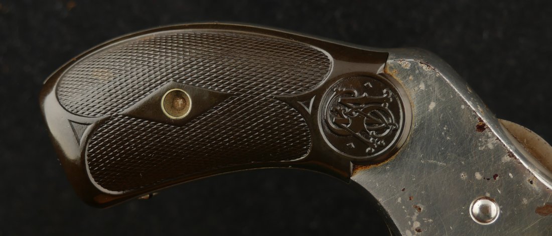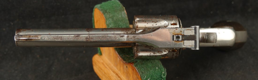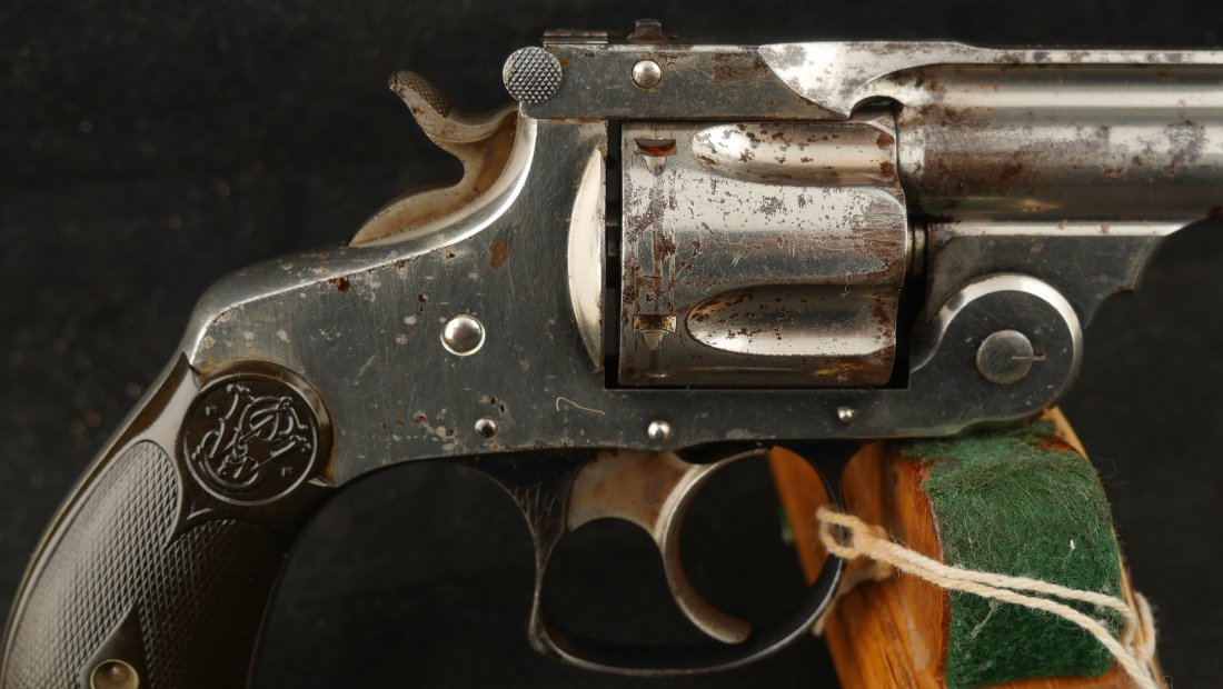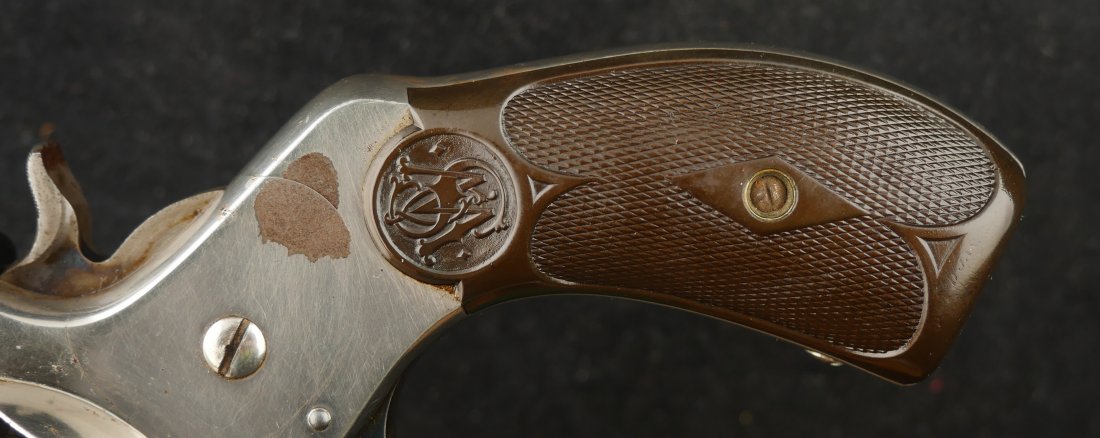 079-0126-9400, Smith & Wesson .38 Double Action 3rd Model Revolver, .38 S&W. 3.25″ ribbed barrel. SN: 240,xxx. Nickel finish blued barrel latch and triggerguard, color case hardened hammer and trigger, checkered S&W logo hard rubber grips. Double action top break revolver with five chambered fluted cylinder, fixed notch rear sight and pinned front sight blade.