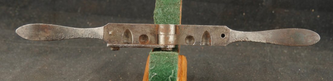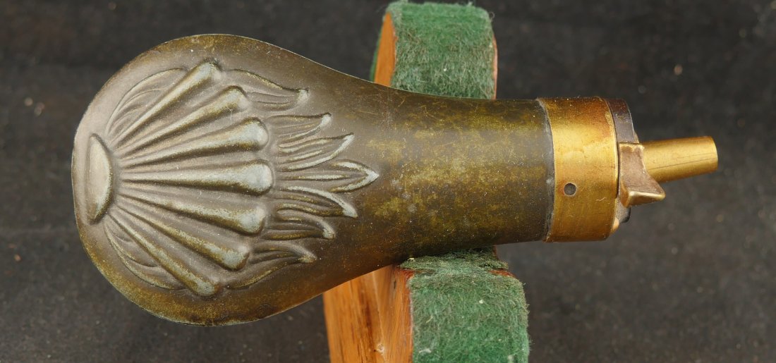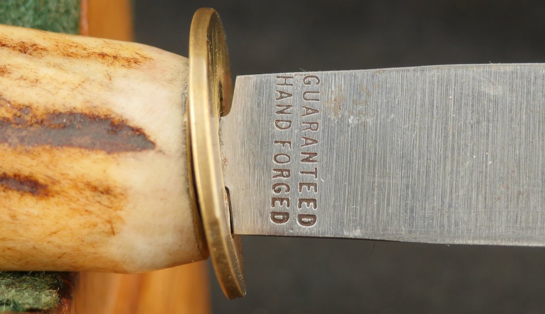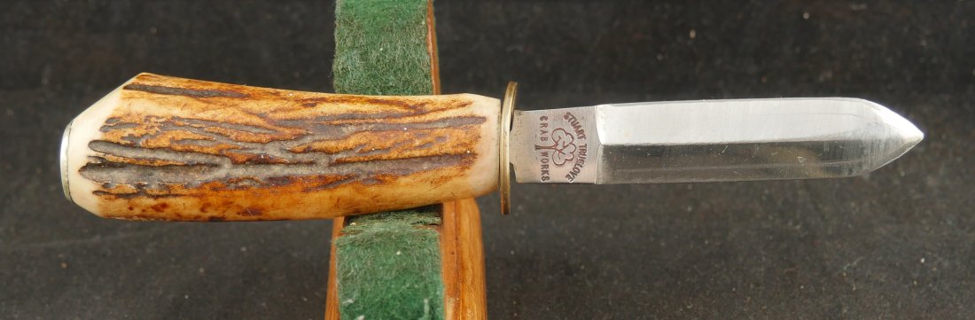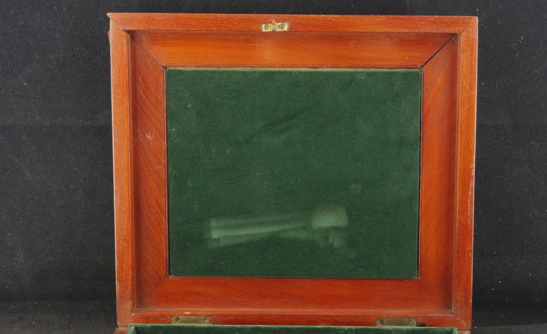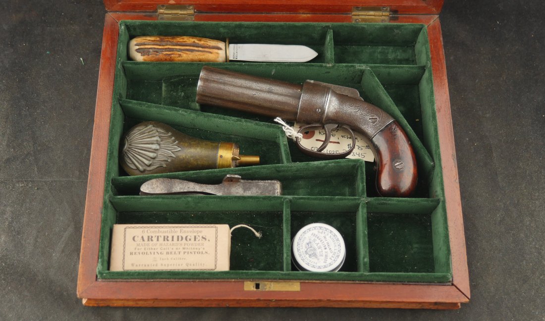 079-0126-P0345, Allen and Thurber .31 caliber, 6 shot pepperbox, functional with better than average mechanics. Clearly marked with scattered fine bumps and dings to the exterior of the barrel and frame. #2xx with side knife marked STUART TRUELOVE, CRAB WORKS with 3 inch blade showing double edge. It has a horn grip with German Silver bulb on the knife handle. It comes with an unmarked pistol flask and heavily pitted double mold, one conical, one ball. The case is a dealer case, probably made from a silver ware case. It has a repro skin for 36 caliber percussion rounds with repro cap tin. Good overall.