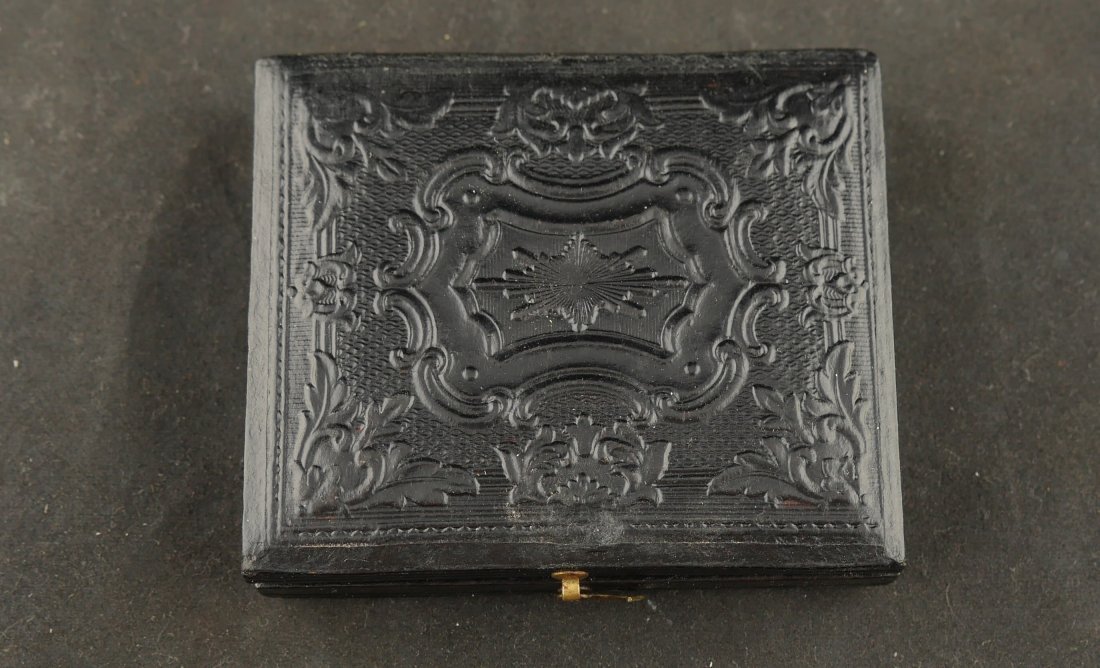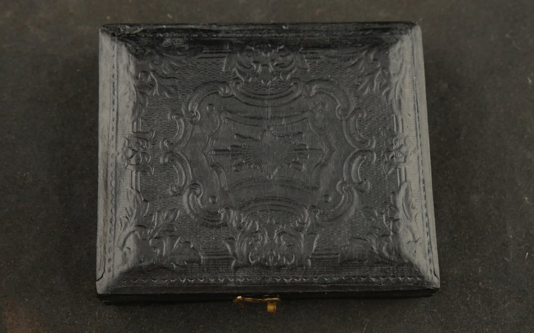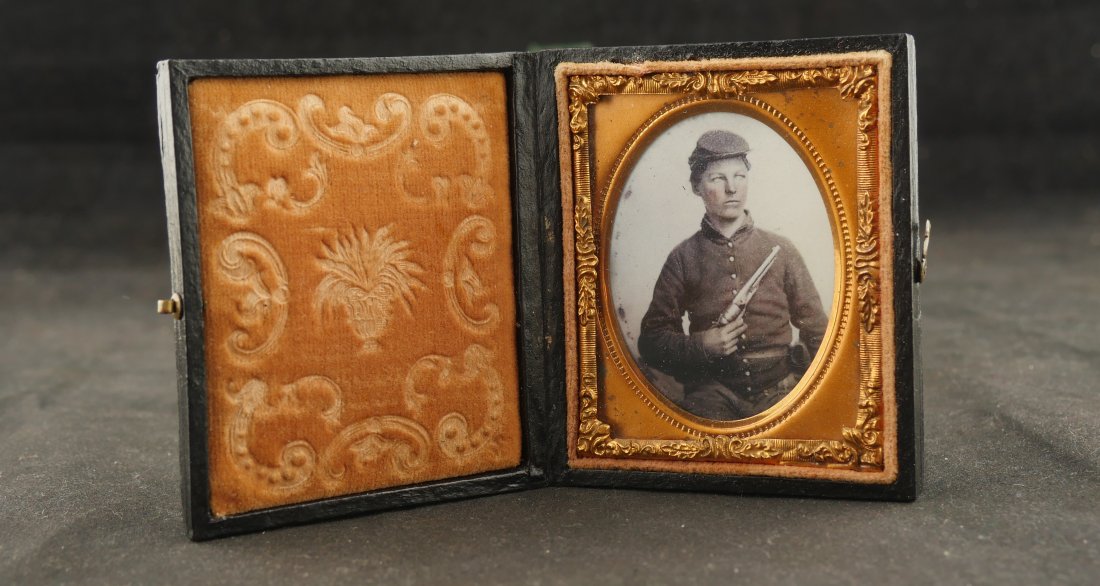 079-025-P0385, Tin type of a Union Soldier with a bummer cap and holding a Colt M-1860 Army. This is a small tin in excellent leather case with gold colored felt interior. Very clear image. Excellent overall.