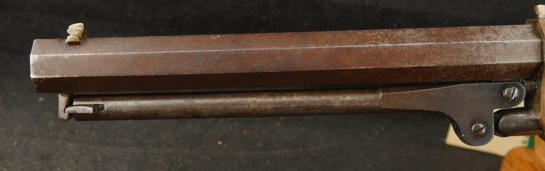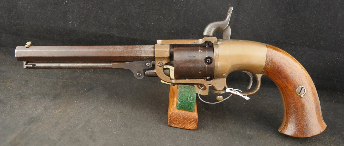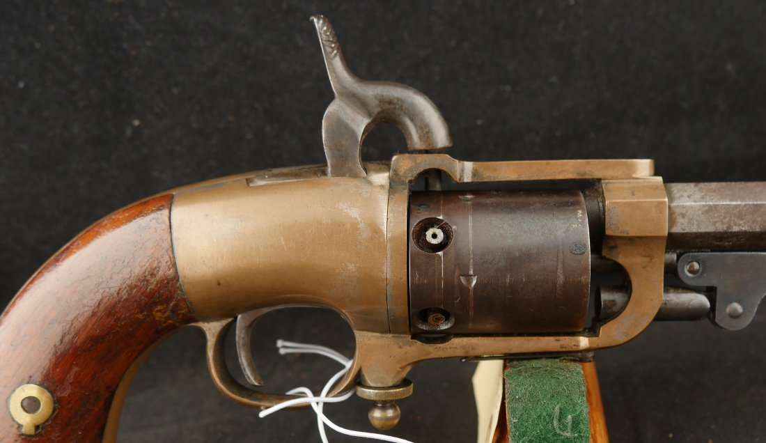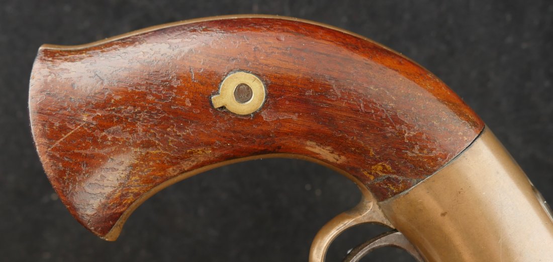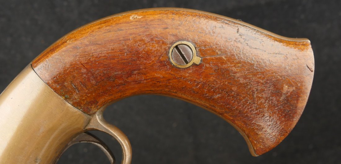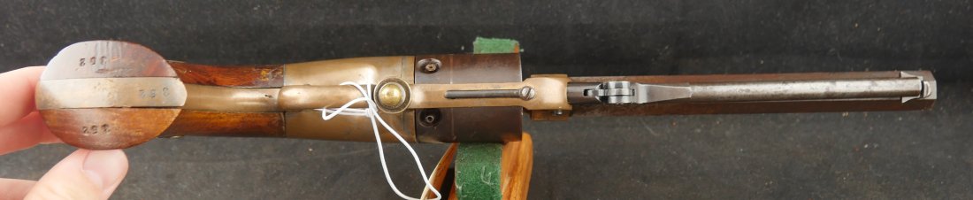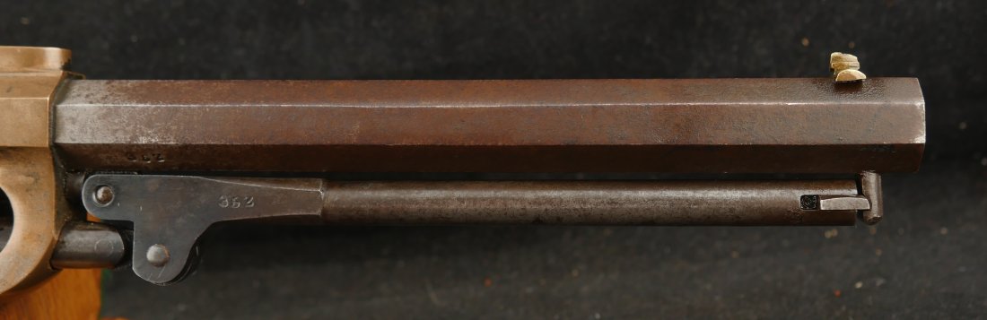 079-0326-9425, Butterfield Army .41 cal, 5 shot, only 640 made. Over 2100 were ordered under US military contract, but the order was cancelled, that is why the limited production. They were made in 1861-1862. They show brass frame, this one has strong flashes of silver on the frame. #3xx matching on all visible numbers. The wood grip show about 50% original varnish. The cylinder retains about 50% medium blue, the barrel and lever show mottled brown with spinkled spots of surface residue. The action is functional, but works best with a crisp hammer pull. The bore shows crisp rifling edges, but scattered fine surface residue the length of the bore. Very good to fine overall. I have only handled a half dozen of these in 25 years. You usually find these with cracked frames, broken and badly chipped grips, this is an exceptional one and the best I have ever handled. Hard to get.