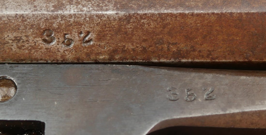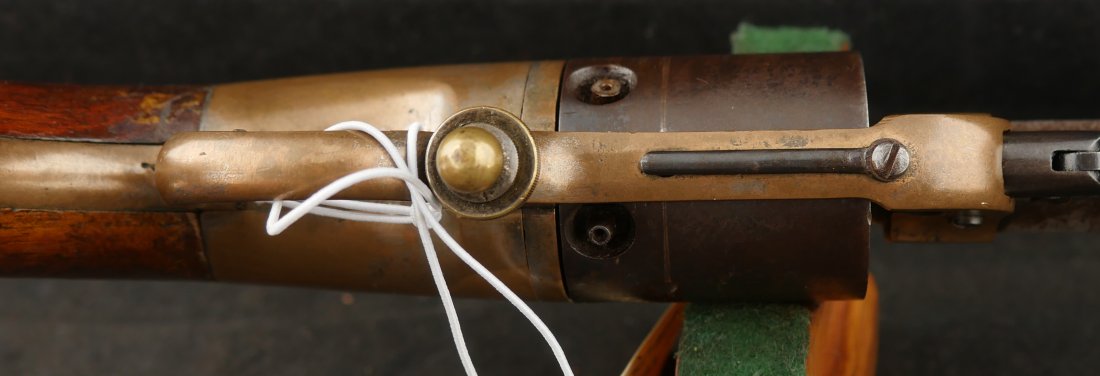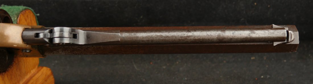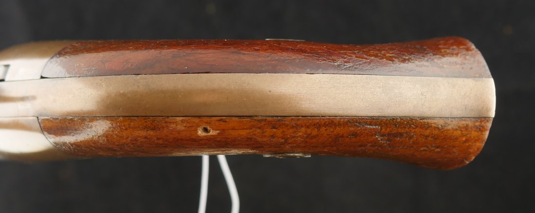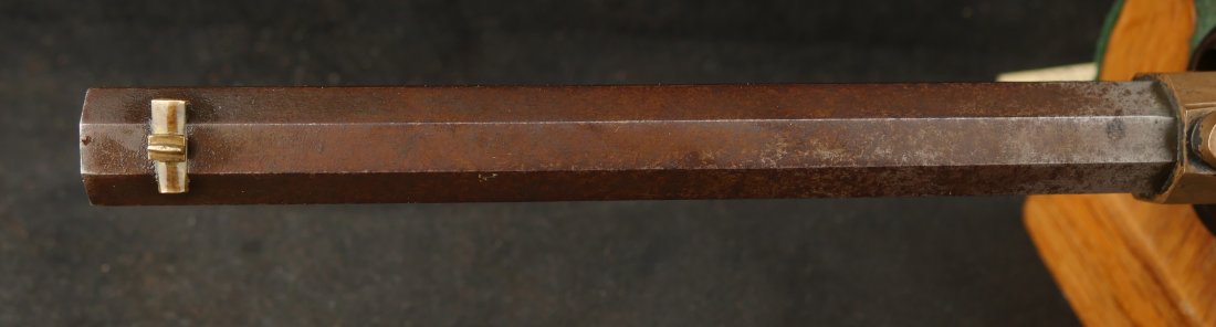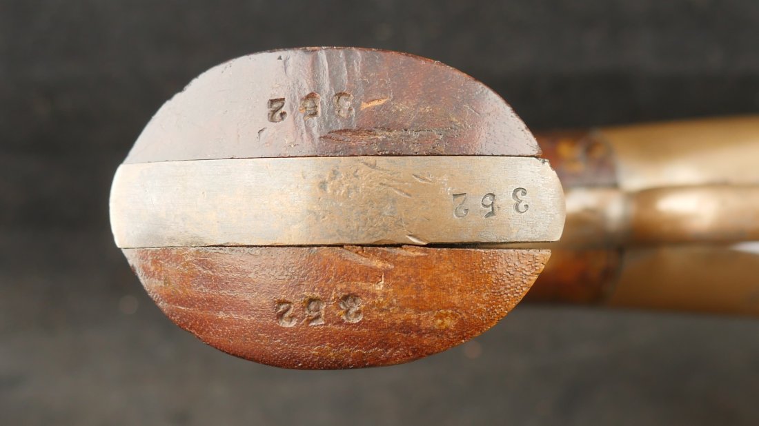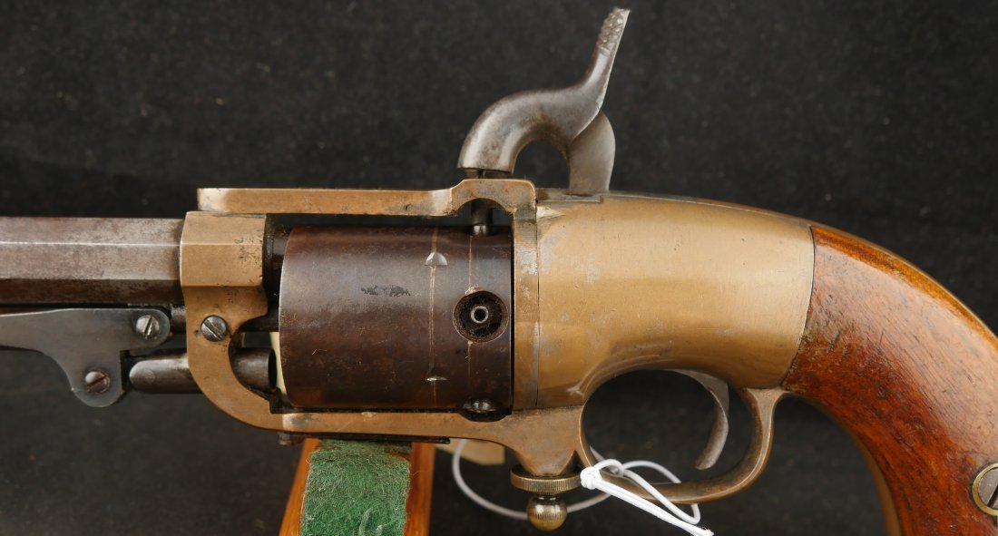 079-0326-9425, Butterfield Army .41 cal, 5 shot, only 640 made. Over 2100 were ordered under US military contract, but the order was cancelled, that is why the limited production. They were made in 1861-1862. They show brass frame, this one has strong flashes of silver on the frame. #3xx matching on all visible numbers. The wood grip show about 50% original varnish. The cylinder retains about 50% medium blue, the barrel and lever show mottled brown with spinkled spots of surface residue. The action is functional, but works best with a crisp hammer pull. The bore shows crisp rifling edges, but scattered fine surface residue the length of the bore. Very good to fine overall. I have only handled a half dozen of these in 25 years. You usually find these with cracked frames, broken and badly chipped grips, this is an exceptional one and the best I have ever handled. Hard to get.