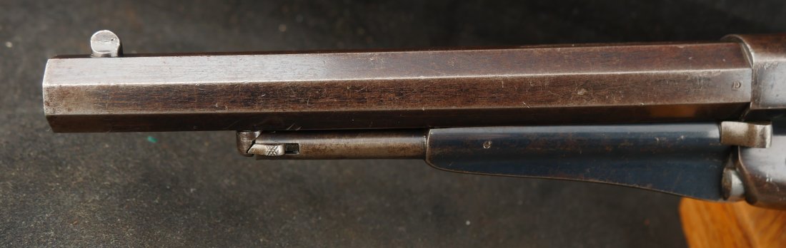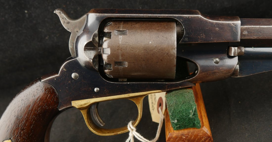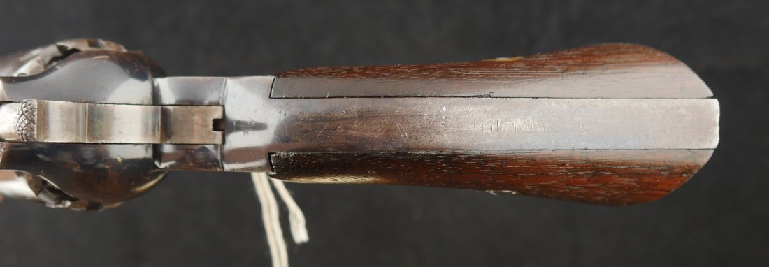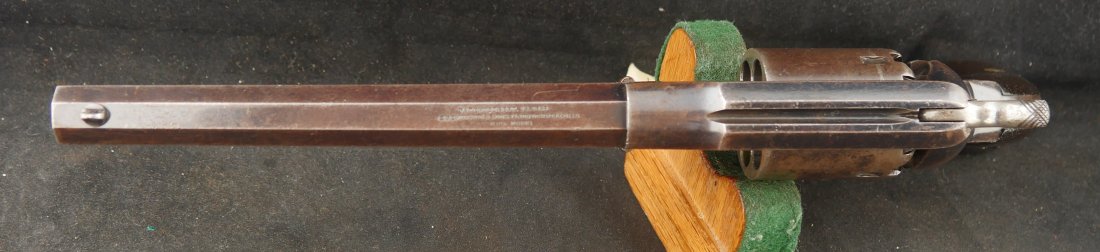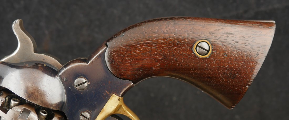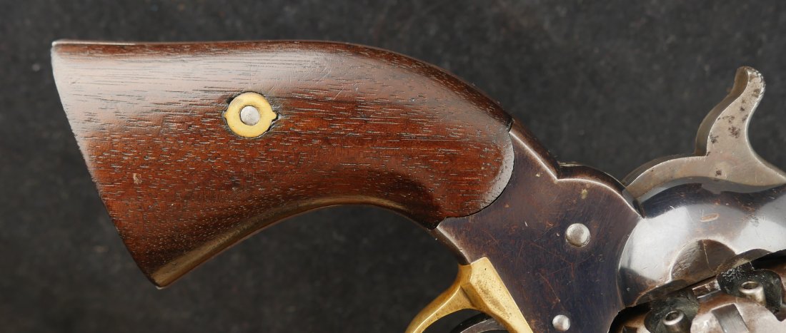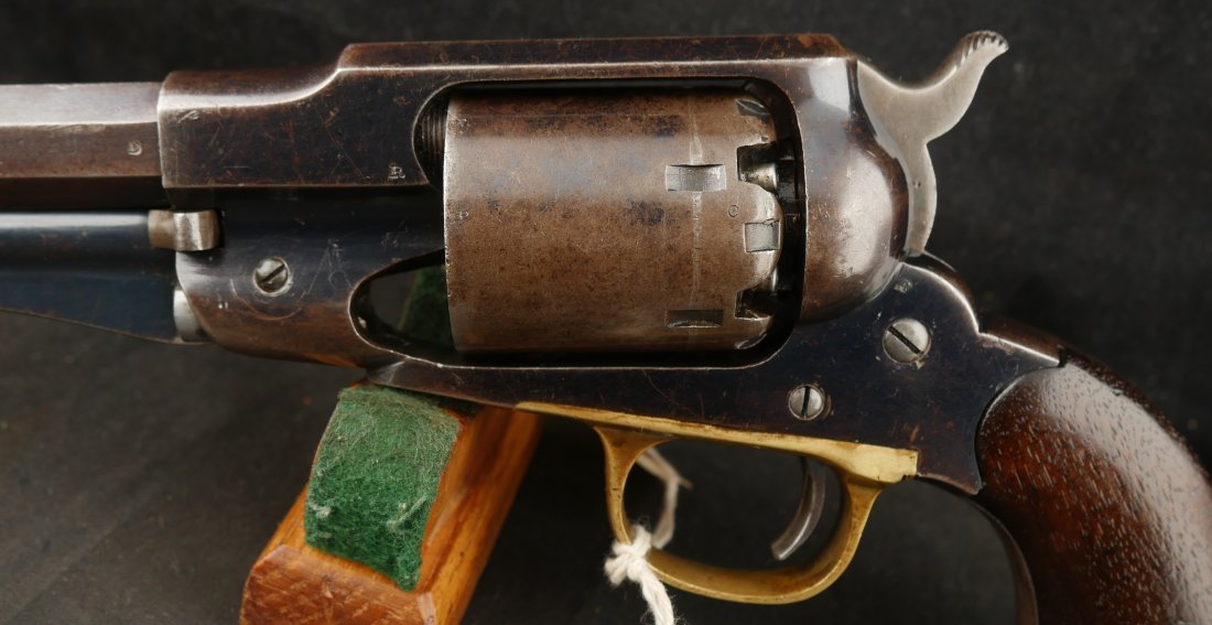 079-0326-9431, Reminton NM Army, .44, 6 shot. Overall 70% deep to medium blue on barrel, frame, cylinder and the lever. The grips show light use marks with what might be trace of a cartouche. The markings are crisp, the action is tight and functional. The bore is mirror bright and crisply rifled. The grips are slightly ill fit, but I think it is from the gun being dropped and backstrap slightly bent. Fine to excellent overall with excellent bore. #121xxx