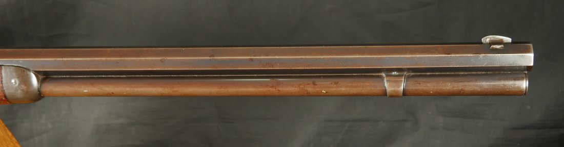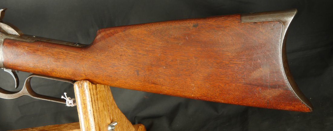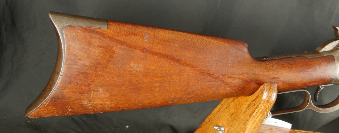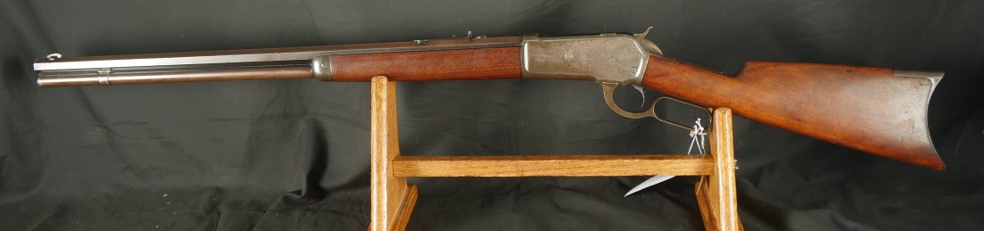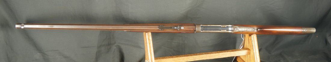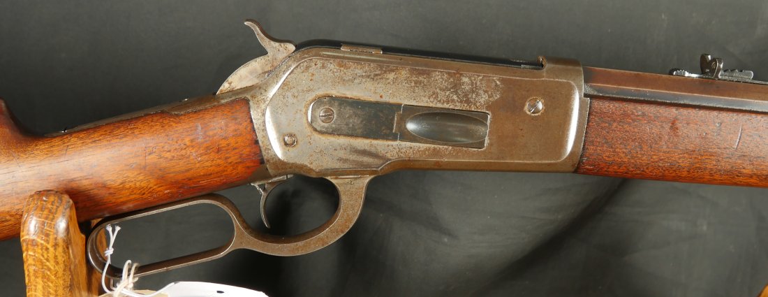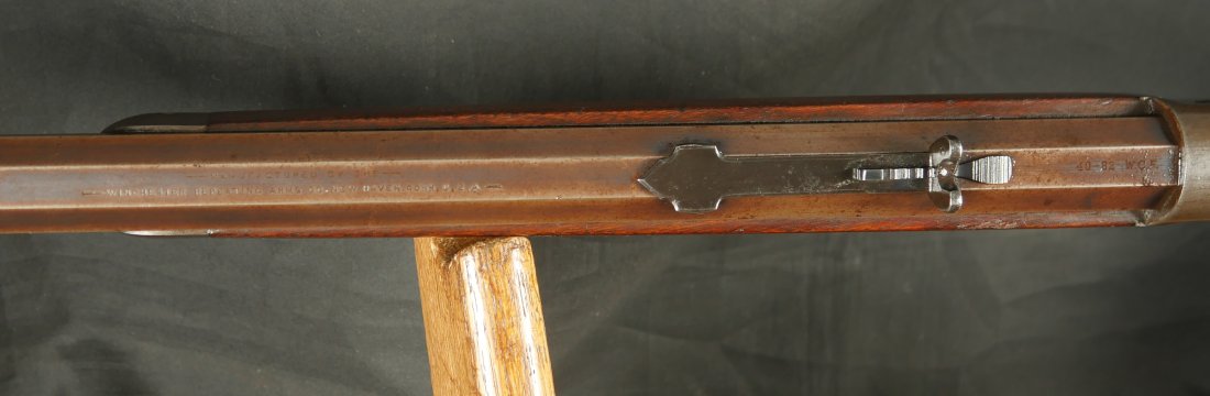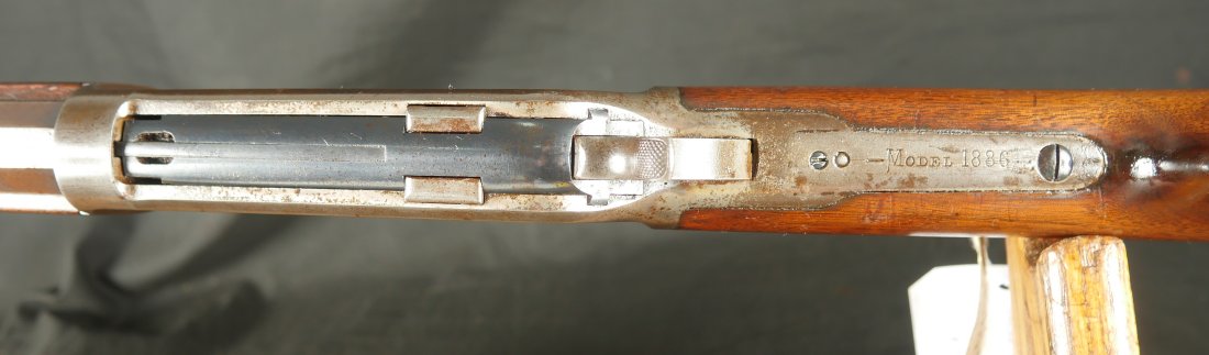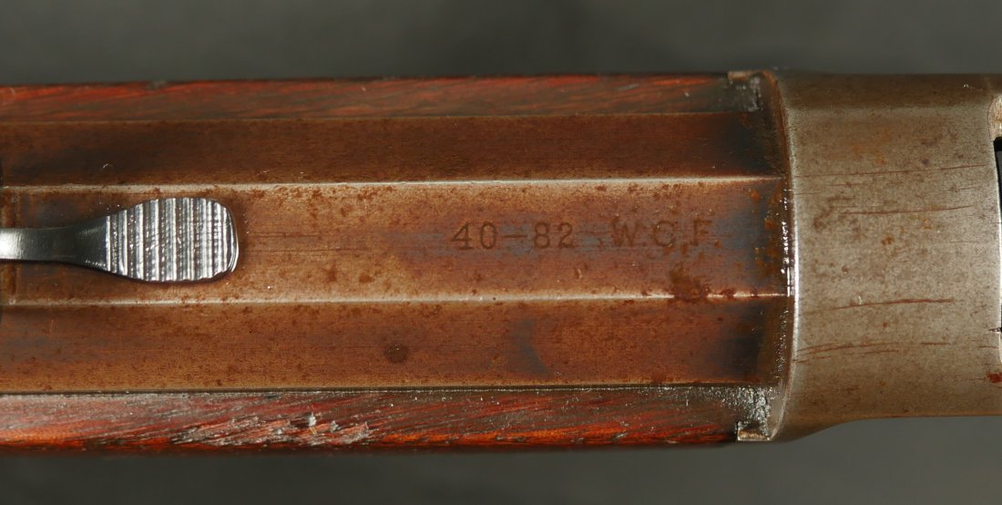 079-0326-9450, Winchester M-1886 Octagon Barrel Rifle in 40-82. 26 inch barrel with clear markings and shows about 40% deep to medium barrel blue. Fine wood to metal fit. The stocks show light use marks. #17xxx made in . The frame is case colored with strong flashes of rainbow hues. About 25% case color on the frame. The bore is strongly rifled with very fine spotting the entire length. Fine overall.