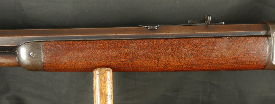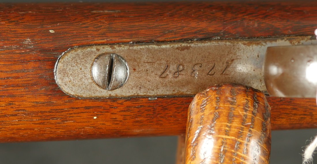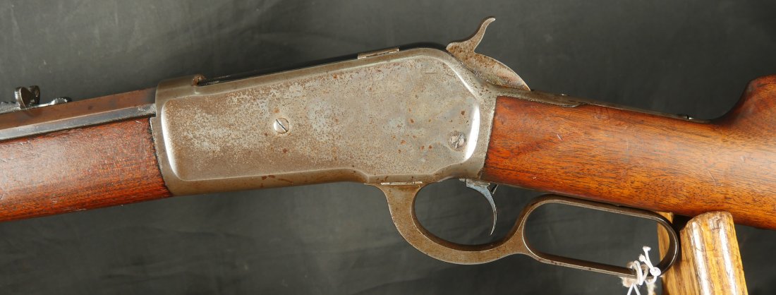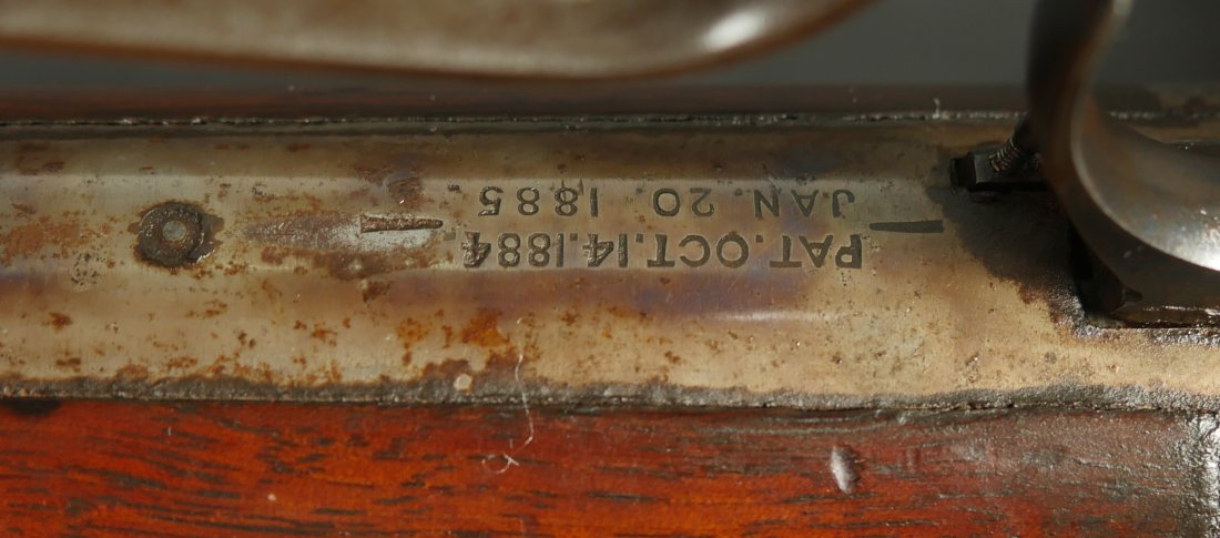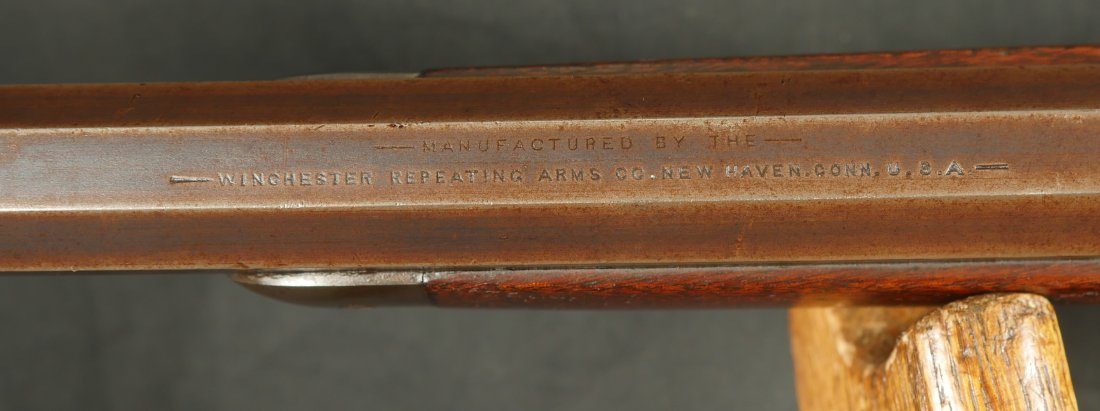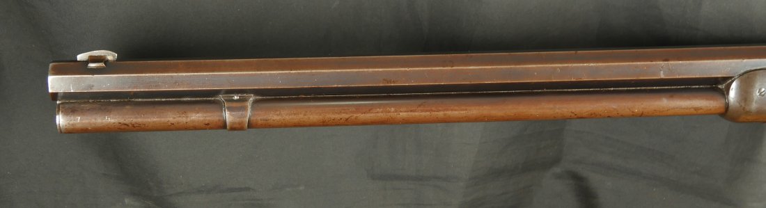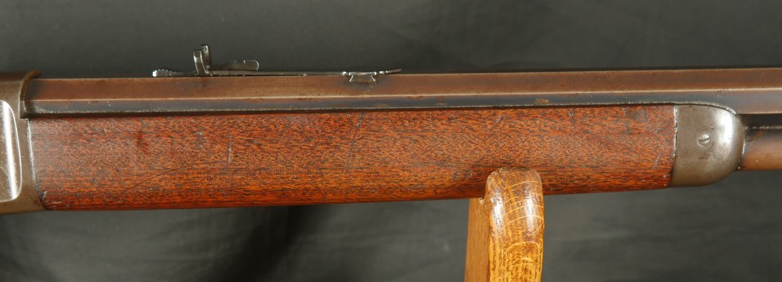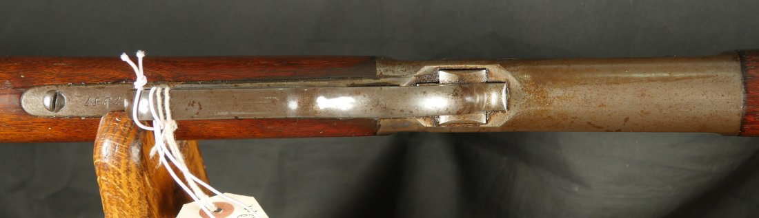 079-0326-9450, Winchester M-1886 Octagon Barrel Rifle in 40-82. 26 inch barrel with clear markings and shows about 40% deep to medium barrel blue. Fine wood to metal fit. The stocks show light use marks. #17xxx made in . The frame is case colored with strong flashes of rainbow hues. About 25% case color on the frame. The bore is strongly rifled with very fine spotting the entire length. Fine overall.