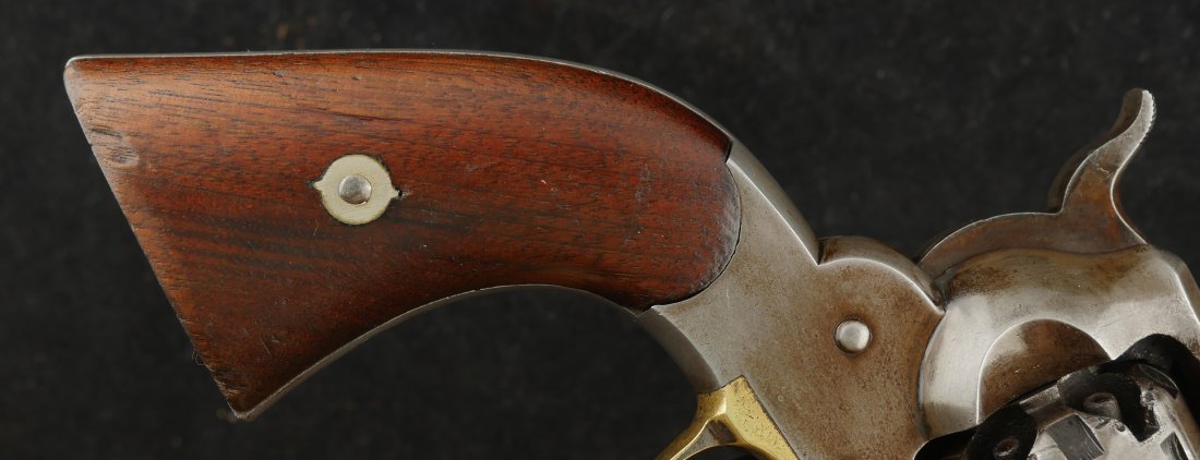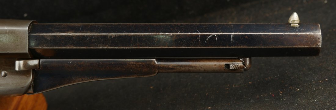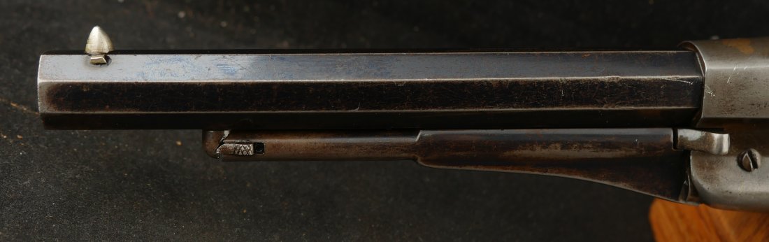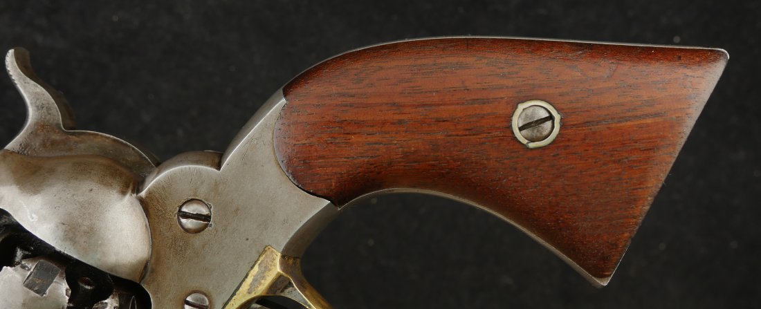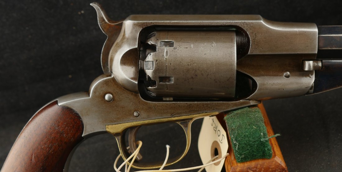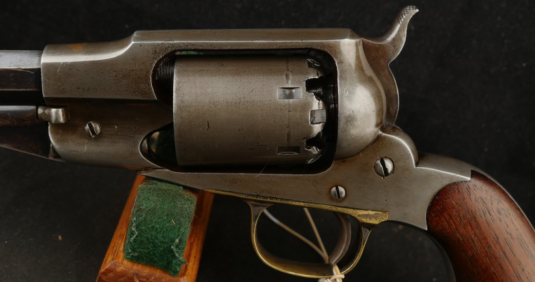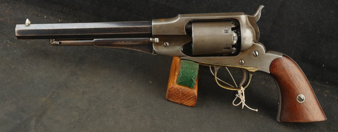 079-0326-9459, Remington Transitional New Model Navy Civilian Single Action Percussion Revolver – Remington Transitional New Model Navy Civilian Single Action Percussion Revolver, #23xxx, . 36 cal., 7-3/8” octagon barrel, blued finish, brass trigger guard, two-piece smooth walnut grips, silver cone front sight, and ”U”-shaped rear sight. Barrel is marked in two-lines ”PATENTED SEPT. 14, 1858/E. REMINGTON & SONS. ILION NEW YORK, U.S.A.” No ”New Model” markings and this revolver still features some of the earlier features found on the Model 1861 Navy revolver. Other markings include a small ”B” stamped on the left front side of the frame. Matching numbers on left side of the grip frame and underside of the barrel. Back of the cylinder is marked ”3170E”. Condition is fine, retaining approx. 45% blue, located primarily on the barrel and lever. Balance of the metal has an even gray appearance, with some areas of mild pin prick pitting. Barrel address is clear. Left grip rates as fine showing moderate signs of age and wear; right grip with a few more noticeable impressions and small chip from the lower edge. Action is crisp. Bore is very good with scattered spots of moderate erosion. Antique, est. value: $2000