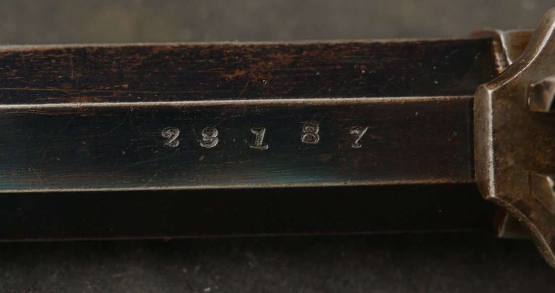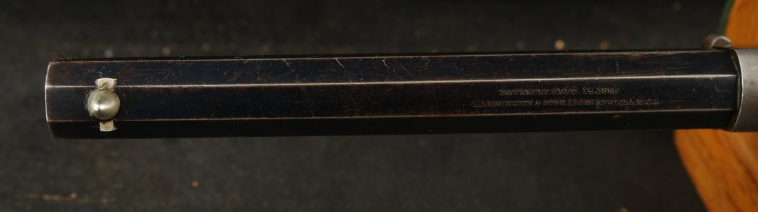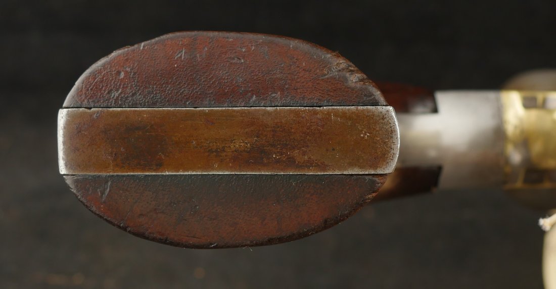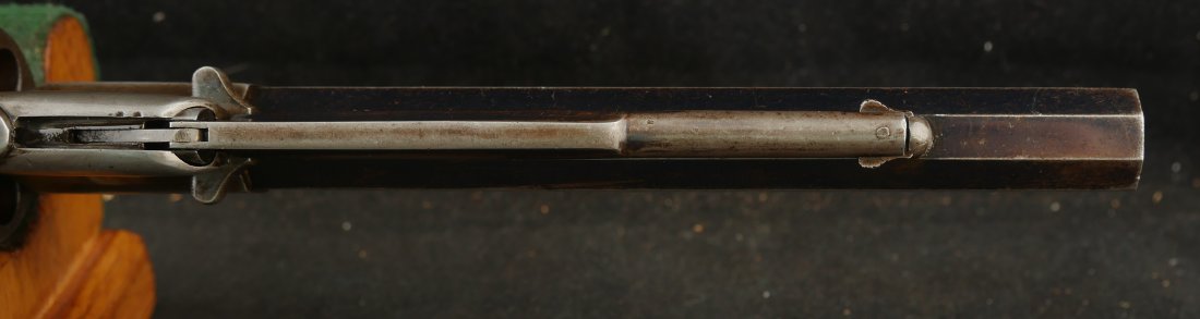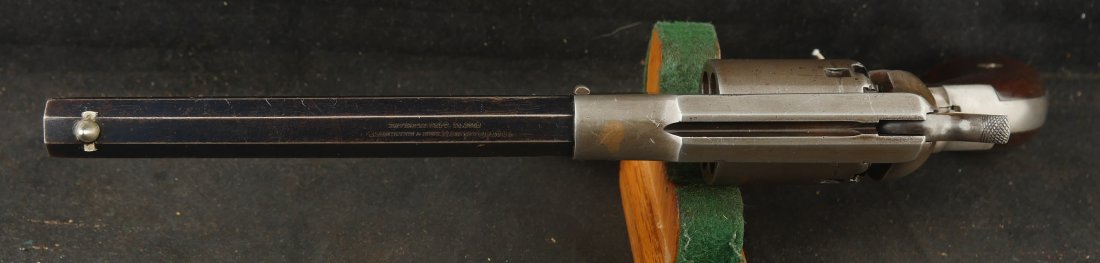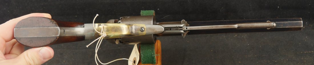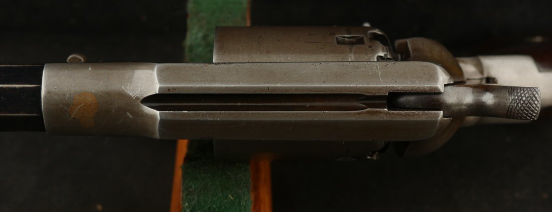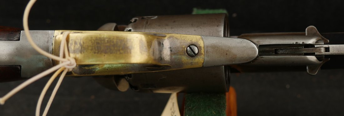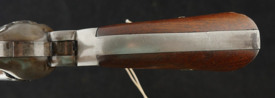 079-0326-9459, Remington Transitional New Model Navy Civilian Single Action Percussion Revolver – Remington Transitional New Model Navy Civilian Single Action Percussion Revolver, #23xxx, . 36 cal., 7-3/8” octagon barrel, blued finish, brass trigger guard, two-piece smooth walnut grips, silver cone front sight, and ”U”-shaped rear sight. Barrel is marked in two-lines ”PATENTED SEPT. 14, 1858/E. REMINGTON & SONS. ILION NEW YORK, U.S.A.” No ”New Model” markings and this revolver still features some of the earlier features found on the Model 1861 Navy revolver. Other markings include a small ”B” stamped on the left front side of the frame. Matching numbers on left side of the grip frame and underside of the barrel. Back of the cylinder is marked ”3170E”. Condition is fine, retaining approx. 45% blue, located primarily on the barrel and lever. Balance of the metal has an even gray appearance, with some areas of mild pin prick pitting. Barrel address is clear. Left grip rates as fine showing moderate signs of age and wear; right grip with a few more noticeable impressions and small chip from the lower edge. Action is crisp. Bore is very good with scattered spots of moderate erosion. Antique, est. value: $2000