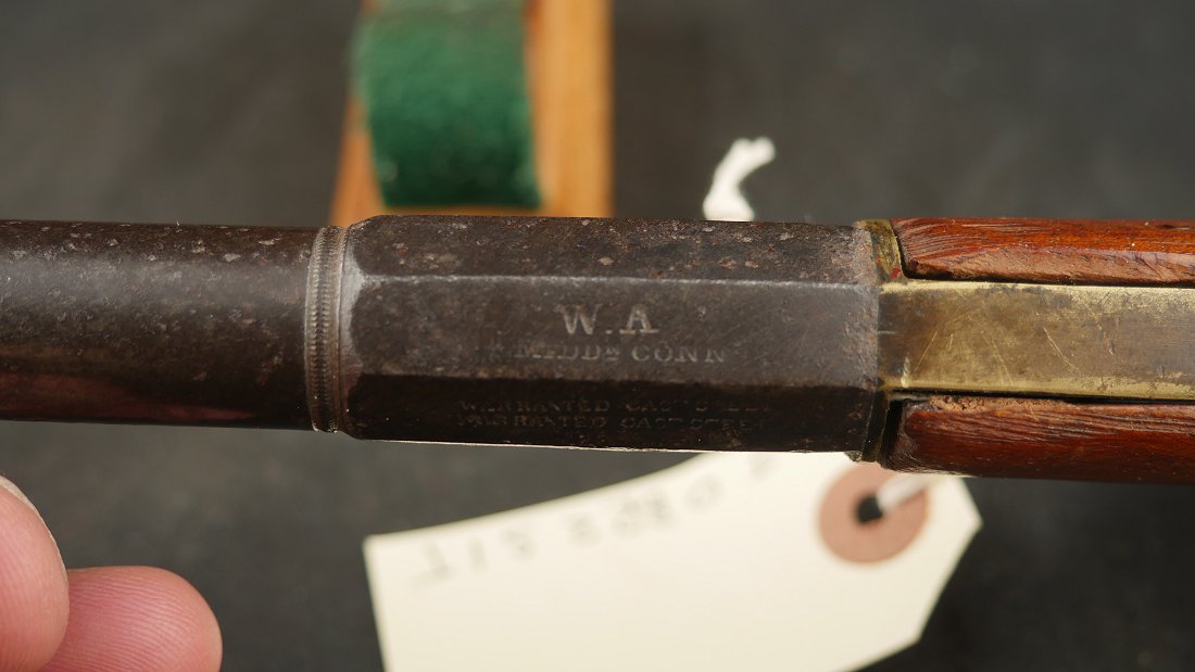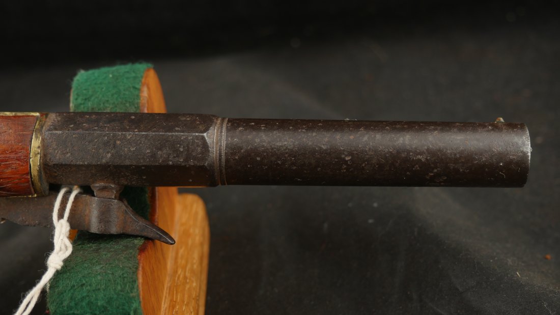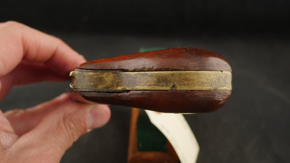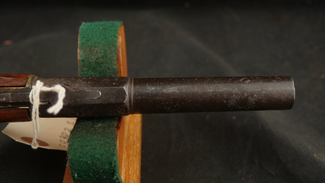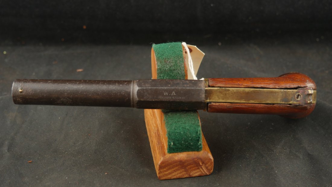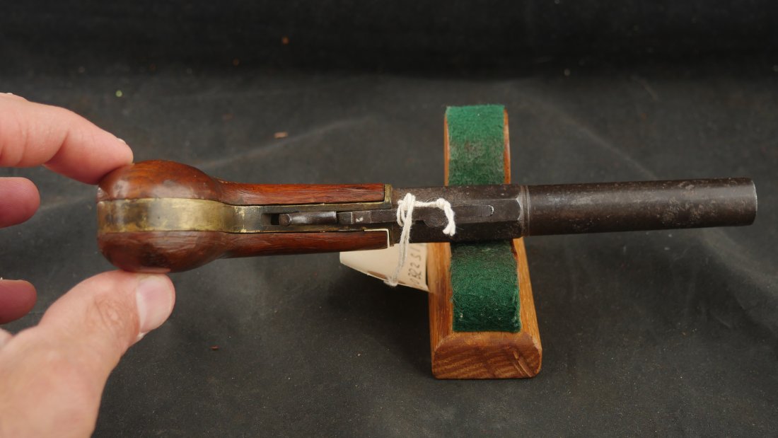079-0724-9077, Under Hammer Single Shot Boot Pistol with markings, WA, ? CONN. The metal is dark brown patina with patches of surface residue and build up pit spots. The gun is functional. The grips are somewhat ill fit. Good overall. It is about .36 cal with rifled bore pitting and heavy surface residue. Fair to good overall.