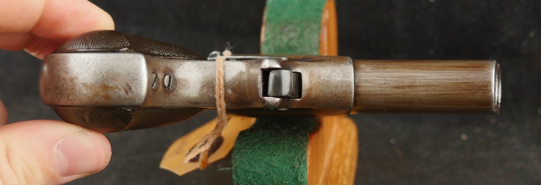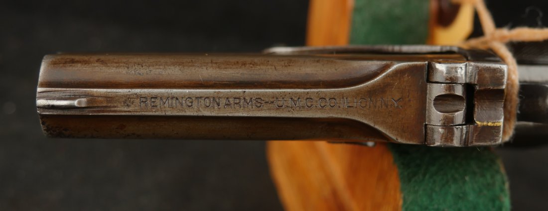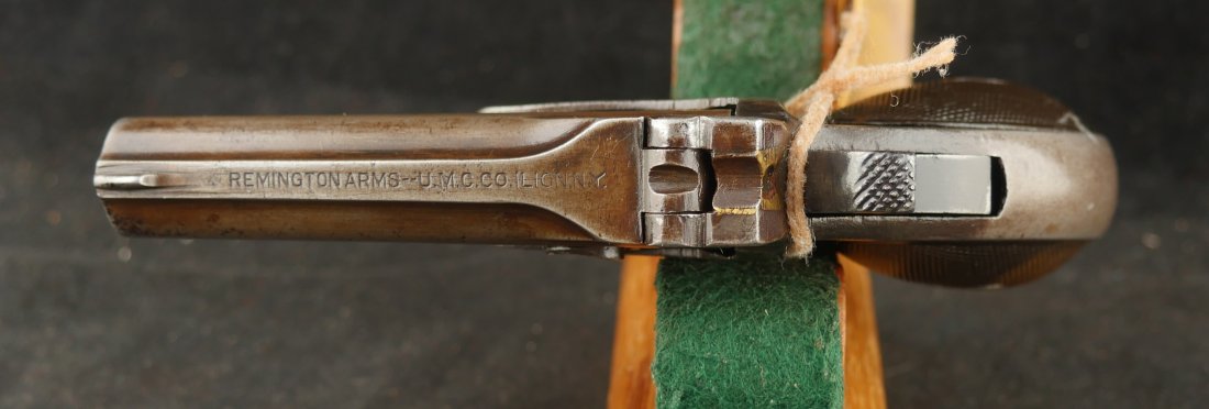 079-0824-9060, Remington DD .41 RF, 2 shot derringer with clear barrel address that reads, REMINGTON ARMS, UMC CO., ILION, NY. The hinge has been repaired. The action is functional and shows wear on the exterior of the gun. The bores are heavily coated with surface residue. CC&R or FFL Required to ship.