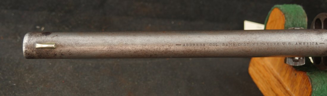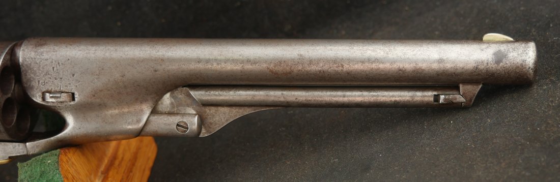 079-0825-0275, Colt M-1860 Army .44, 6 shot percussion. #126xxx matching on the bottom of the gun and the cylinder. The gun was made in 1863. Smooth gray patina, the cylinder retains 70% scene with clear inspector markings on the cylinder, backstrap and the cylinder. The grips show light wear with clear cartouche that is worn on the bottom. The action is tight and crisp with strong rifling showing scattered spots of surface residue. Rich patina on the brass. The gun is much better than average with less than average handling marks. Very good overall.