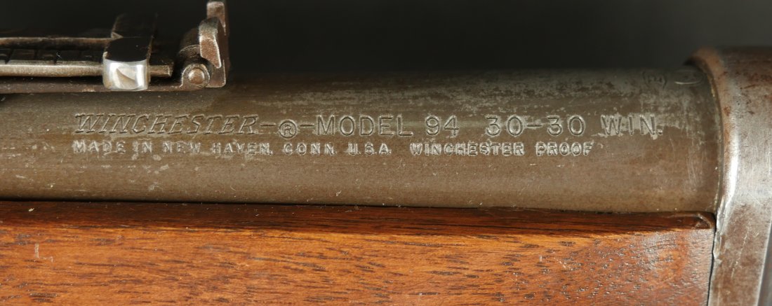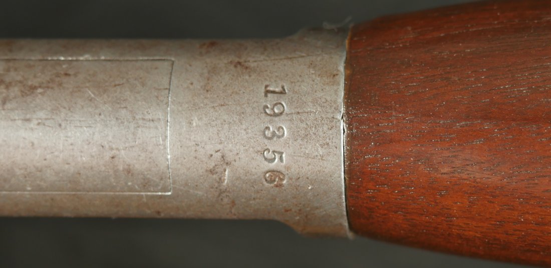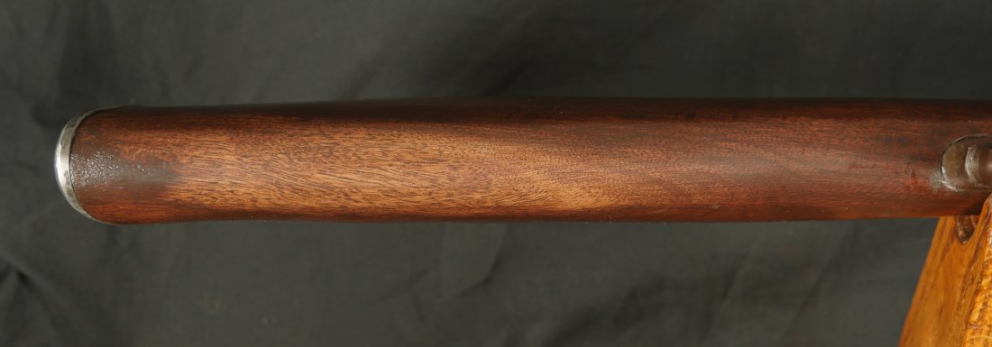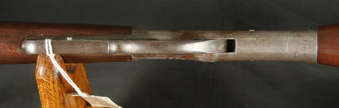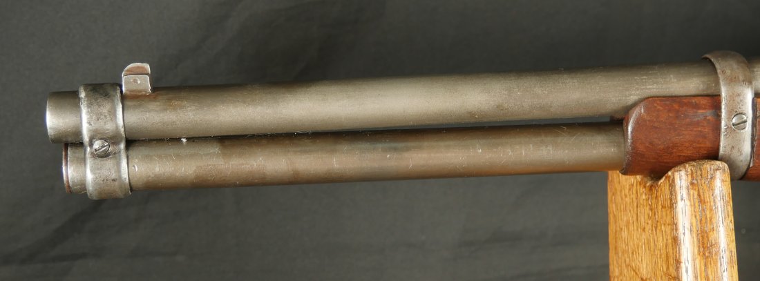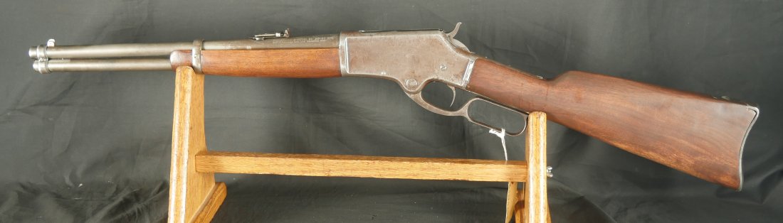 079-0825-9280, Marlin Medium frame M-1881 #19xxx modified to a carbine. It has a 16 inch barrel, which is legal, the barrel is a Winchester Barrel, marked for 30-30 cal, which is what this fires. The muzzle is crowned so appears to be an original carbine barrel. Markings are where you would expect them to be on a 16 inch barrel. The work was done a long time ago, the gun has wear and patina and all of it matches. The butt stock and forearm have been replaced. It has a Winchester style rear ladder sight. A neat old gun and available at a price that should garner considerable interest. The bore is bright with scattered wear and a few shallow pits. Very good as altered.