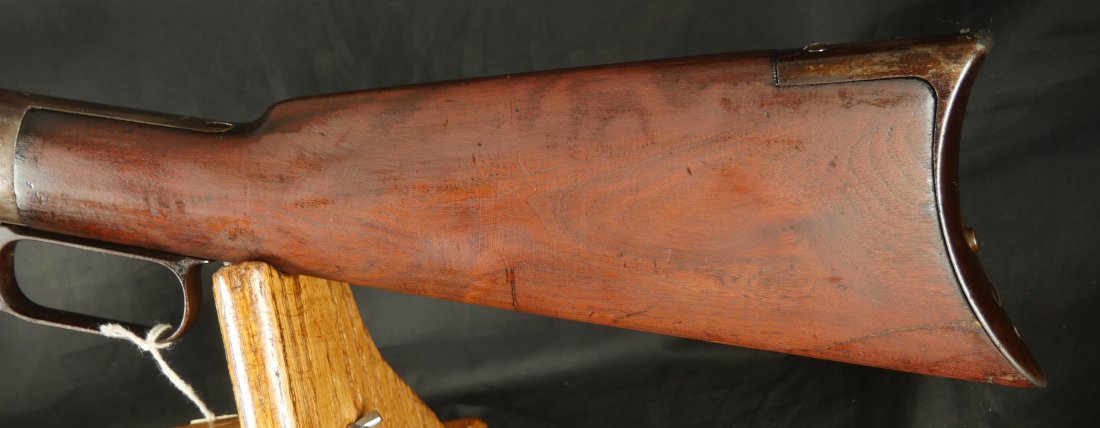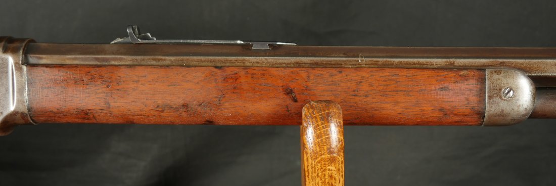 079-0825-D0264, Winchester M-1873 Octagon Barrel Rifle .38 WCF, #256xxx, 3rd model, made in 1888. Mottled brown with scattered bumps, dings and light scratches. The stocks were very lightly cleaned at some point and slightly ill fit at the tangs. The bore is rifled with very fine spots the length of the bore. Very good overall.