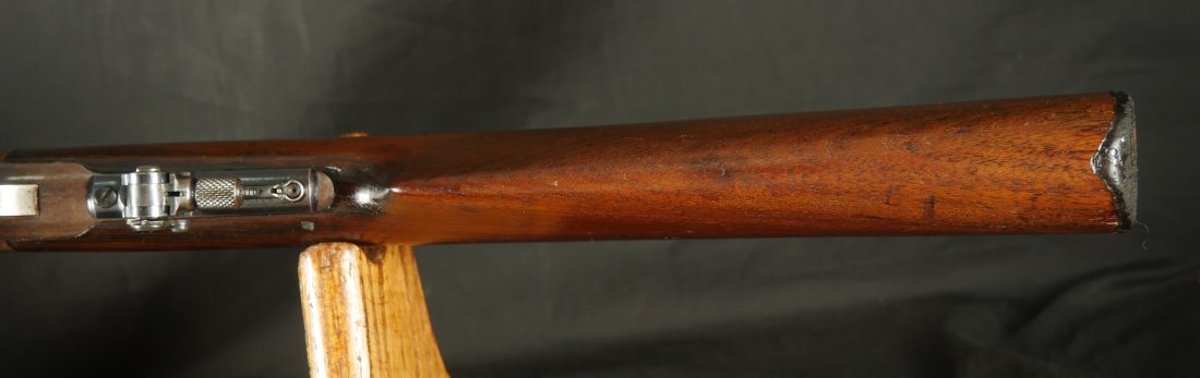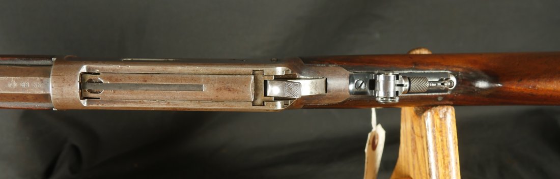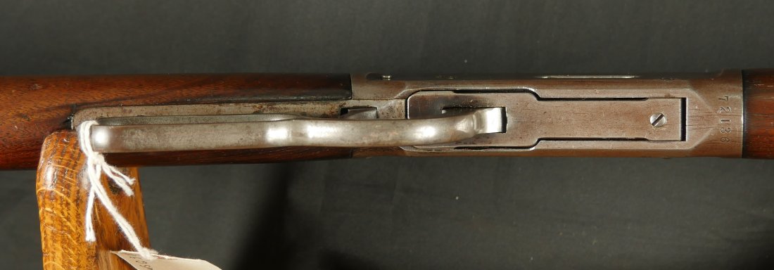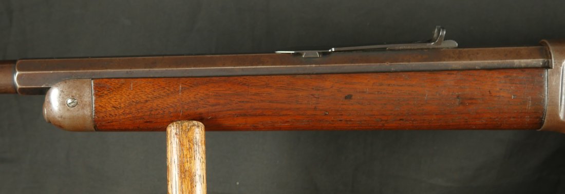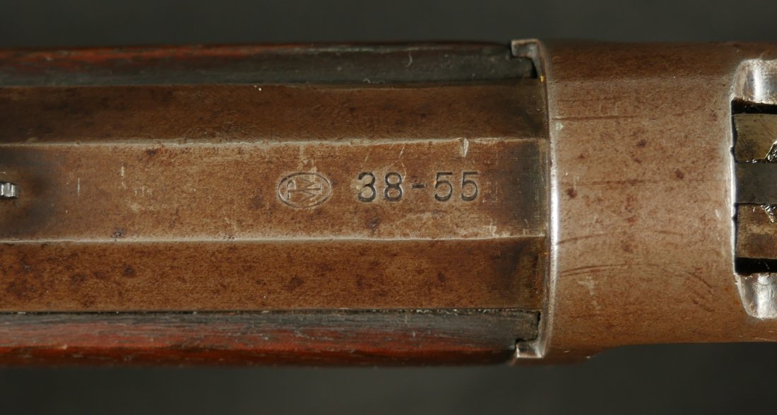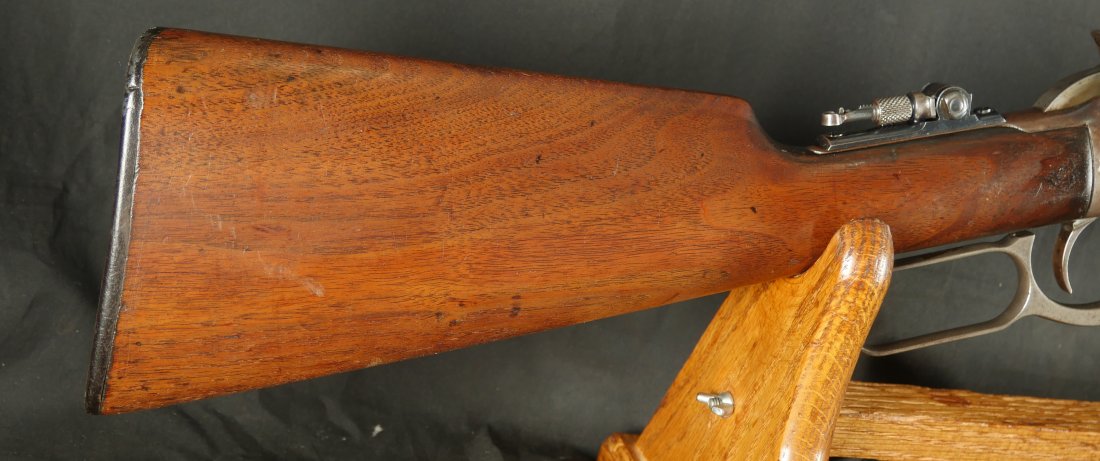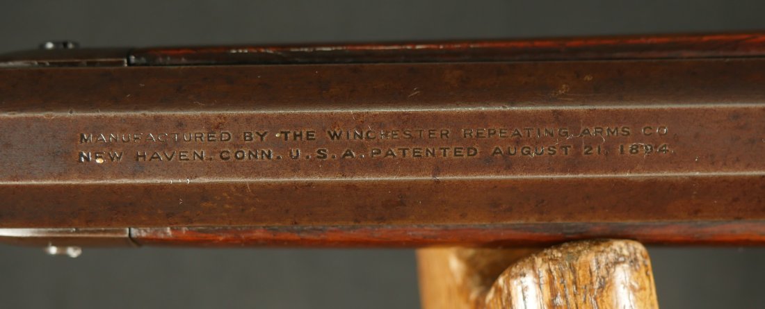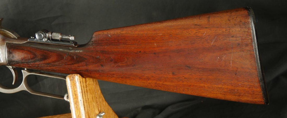 079-0825-D0287, Winchester Special Order M-1894 part octagon, part round barrel rifle with button magazine. It also has a tang sight, shotgun butt plate. In .38-55, #72xxx made in 1898. It has 30% blue on the barrel and frame. The surface shows scattered spots of exterior surface residue. Light bumps, dings and use marks to the metal parts. Also light marks on the stocks. The bore is strongly rifled with residue in the groves. Fine exterior and very good bore. No big pits or spots in the bore.