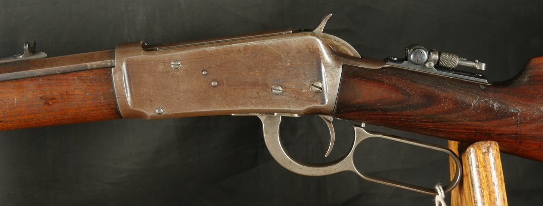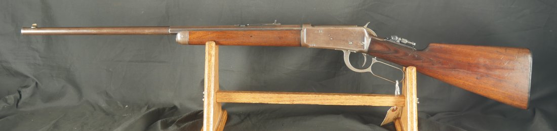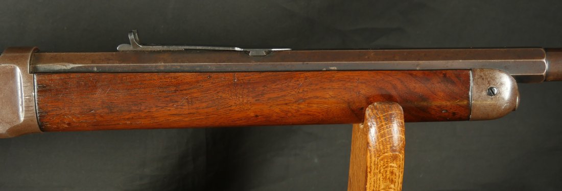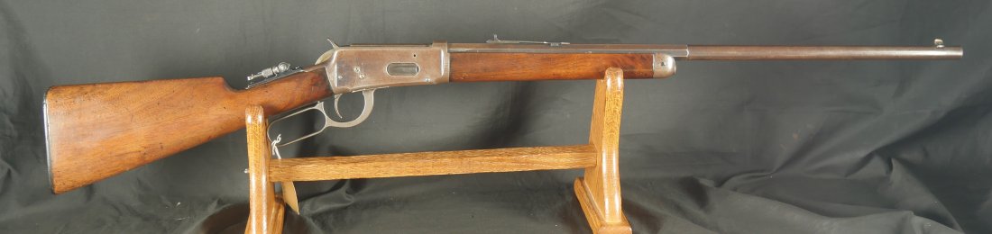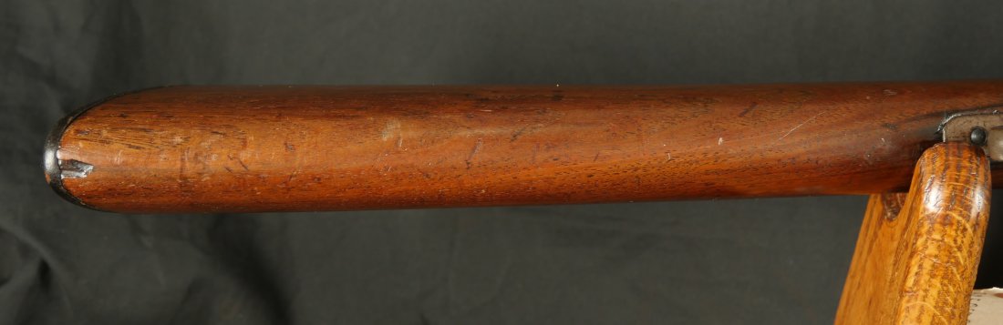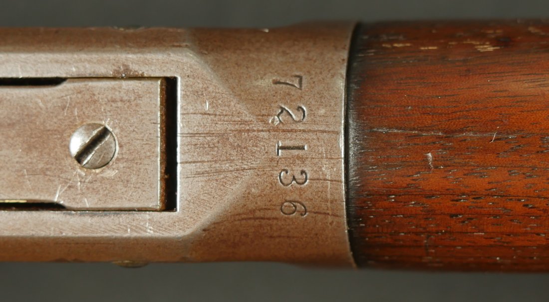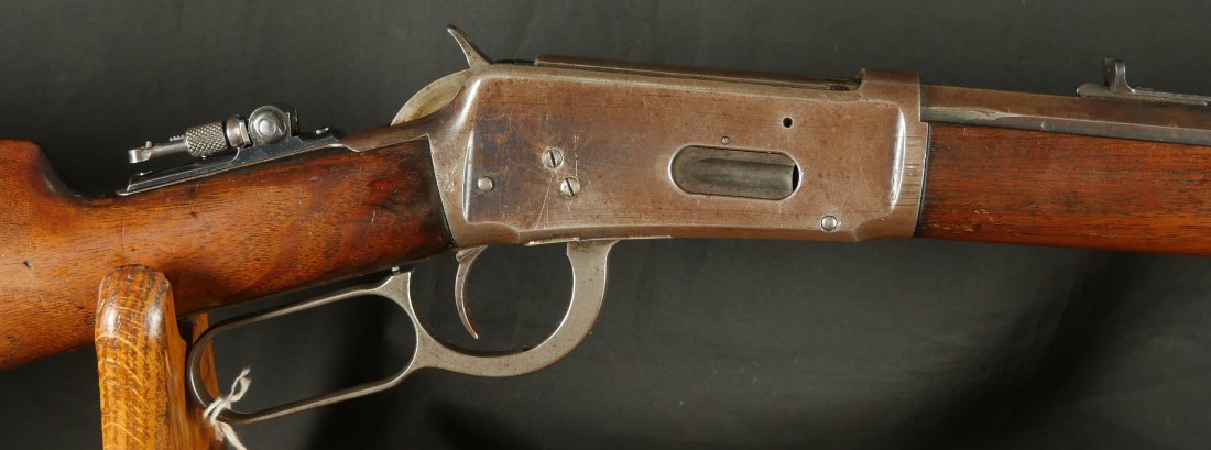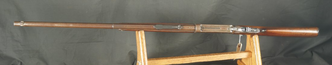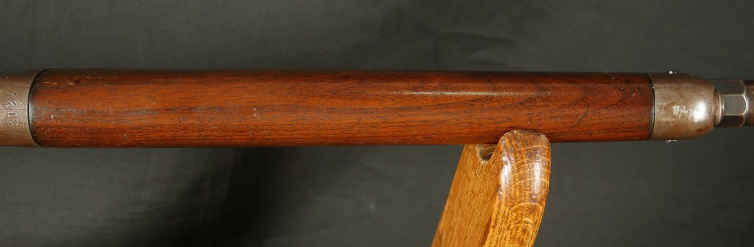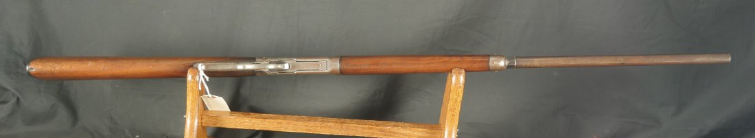 079-0825-D0287, Winchester Special Order M-1894 part octagon, part round barrel rifle with button magazine. It also has a tang sight, shotgun butt plate. In .38-55, #72xxx made in 1898. It has 30% blue on the barrel and frame. The surface shows scattered spots of exterior surface residue. Light bumps, dings and use marks to the metal parts. Also light marks on the stocks. The bore is strongly rifled with residue in the groves. Fine exterior and very good bore. No big pits or spots in the bore.