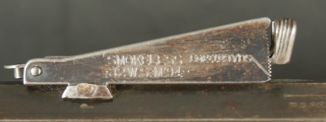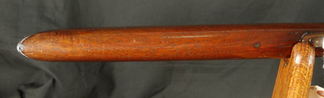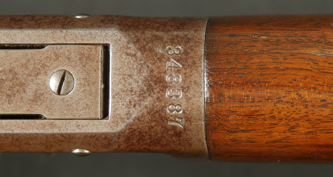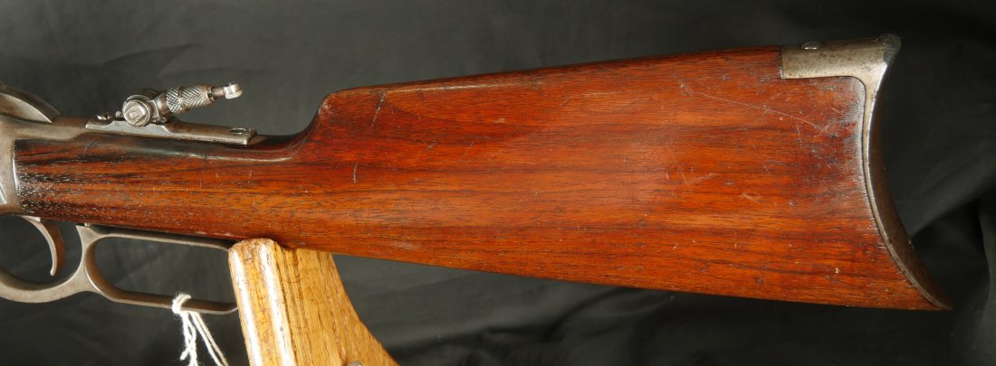 079-0825-D0289, Winchester M-1894 Special Order Rifle with part octagon and part round barrel. It has a tang sight, button magazine with rifle butt plate. #348xxx made in 1906. Fine wood to metal fit. The barrel retains about 50% blue mixing to dark brown patina. The frame shows about 40% blue with traces of rainbow hues on the lever. Overall light handling marks with scattered bumps, dings and scratches. The bore is strongly rifled but was recently fired, it has surface residue the entire length. We will soak it, it appears it will clean to fine, I see no pits.