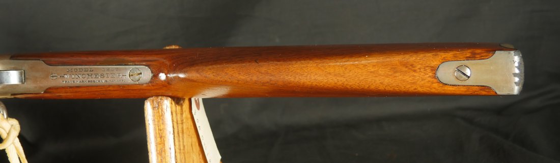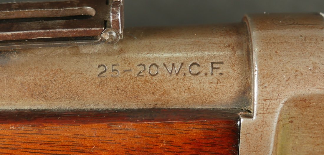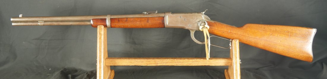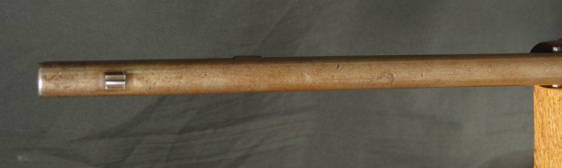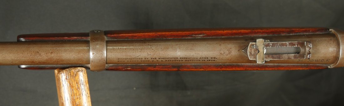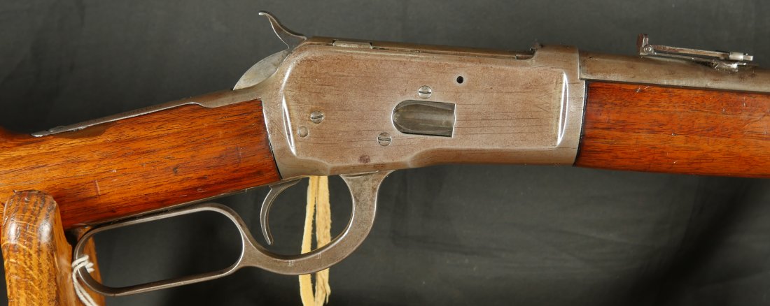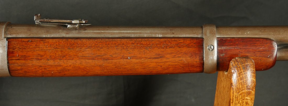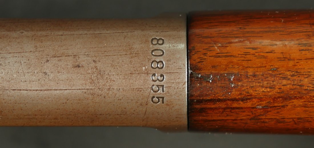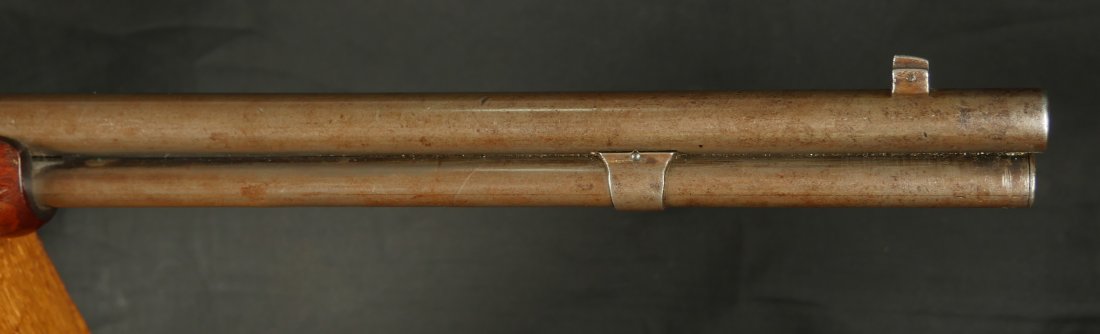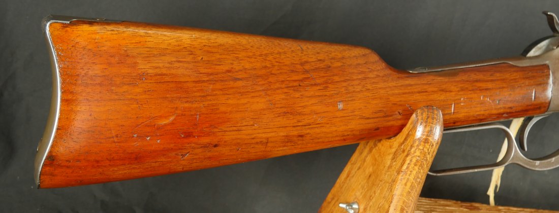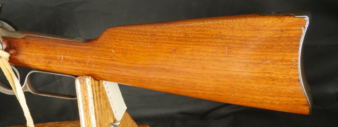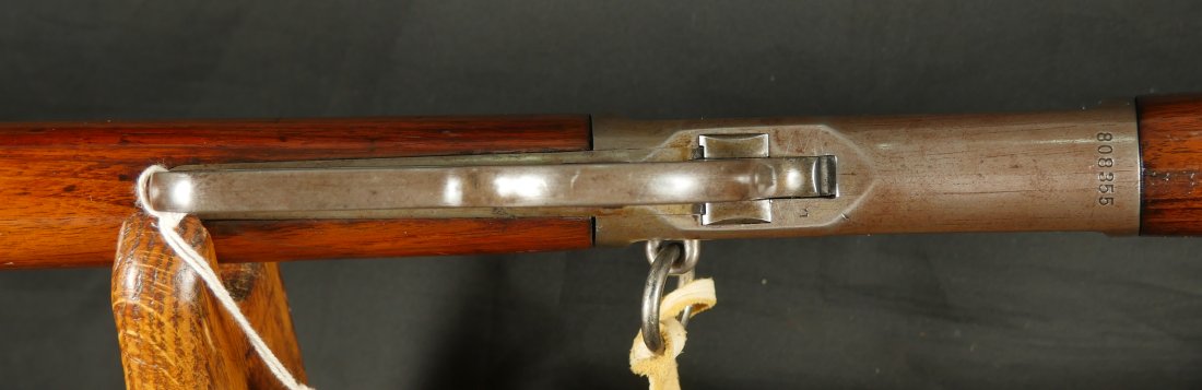 079-0825-D0302, Winchester M-1892 SRC, .38 WCF with blue mixing to gray/brown patina. # 613xxx made in 1911. Stronger flashes of blue in protected place on the barrel. Crisply rifled bore with scattered shallow spotting. The action functions, the metal surfaces show very light handling marks. The butt stock shows almost no handling marks and possibly a replacement. Very good exterior, fine bore.
