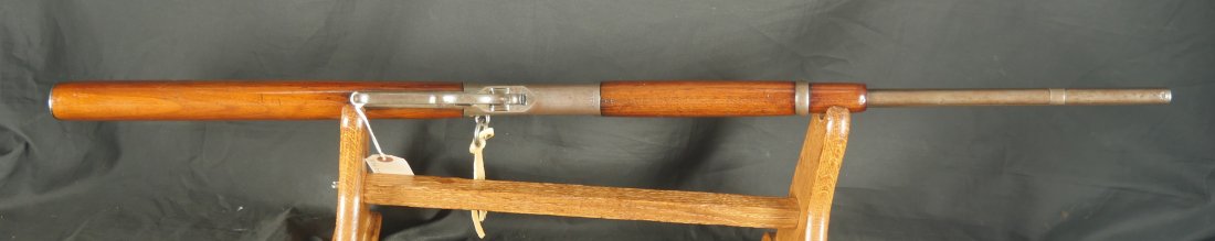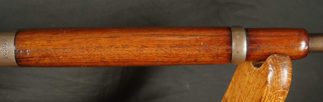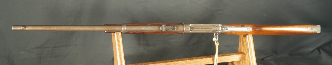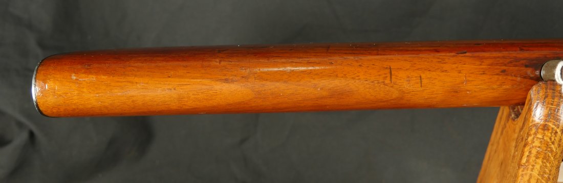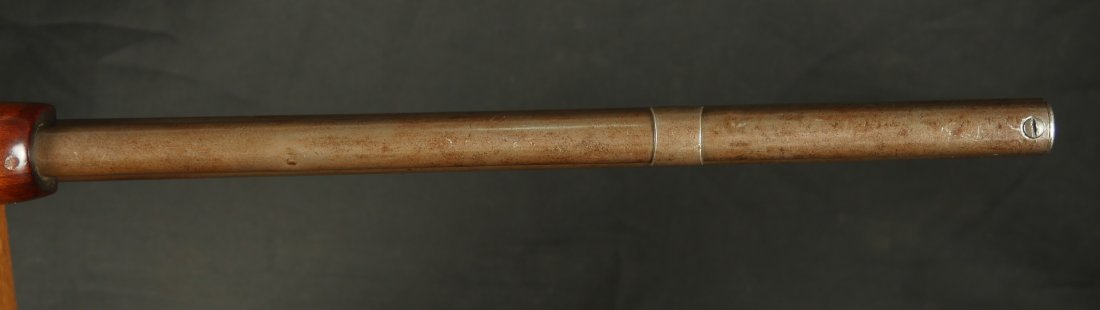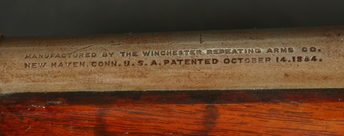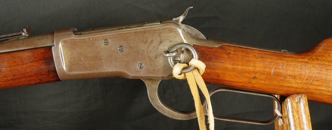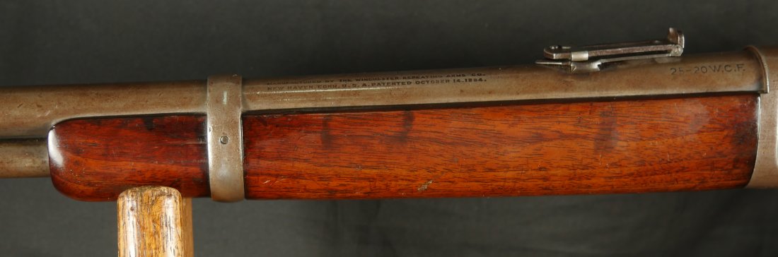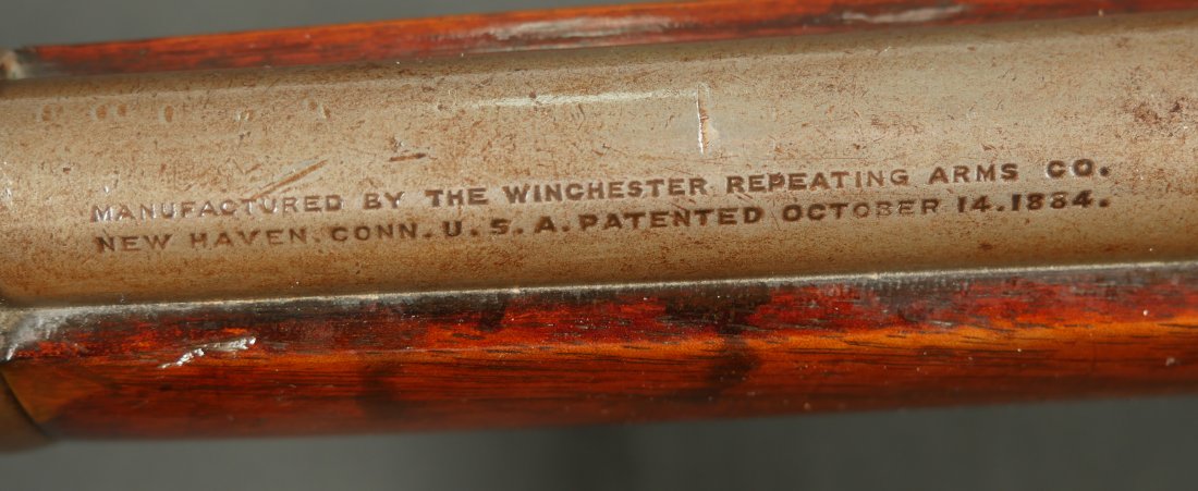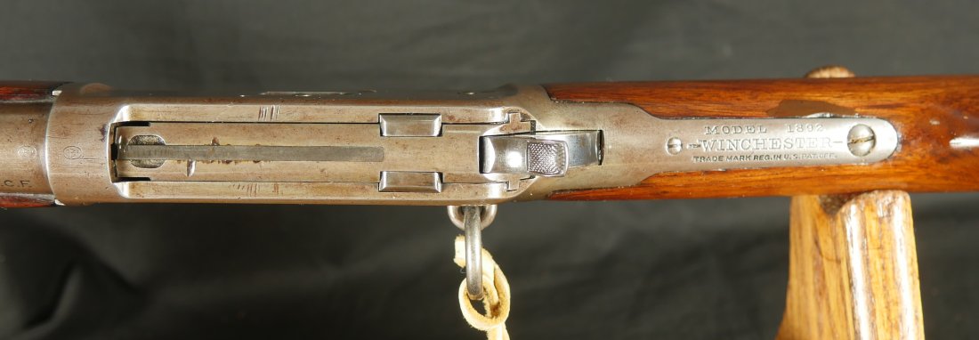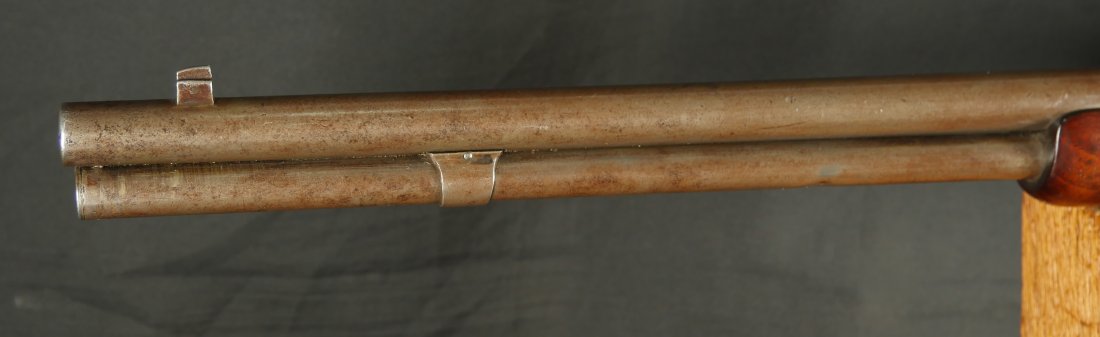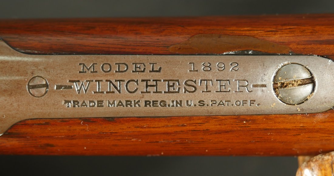 079-0825-D0302, Winchester M-1892 SRC, .38 WCF with blue mixing to gray/brown patina. # 613xxx made in 1911. Stronger flashes of blue in protected place on the barrel. Crisply rifled bore with scattered shallow spotting. The action functions, the metal surfaces show very light handling marks. The butt stock shows almost no handling marks and possibly a replacement. Very good exterior, fine bore.