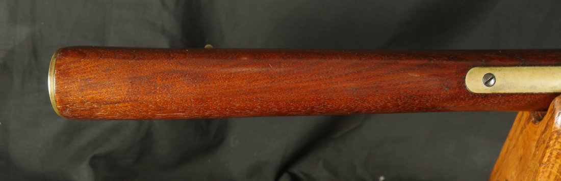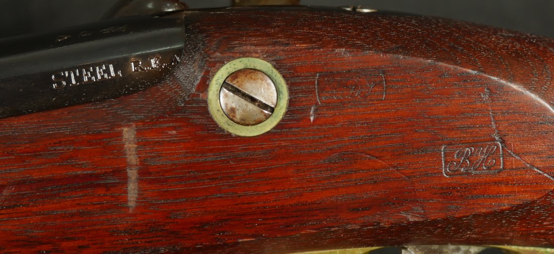 079-1025-7528, Remington M-1863, Zouave .58 cal percussion in unissued condition. 95% deep barrel blue, 90% rich vivid case color on the lock and hammer. The stocks show a few tiny handling marks with 2 vivid cartouches and crisp wood edges, there is one scratch on the stock near cartouches. The bore is minty bright. The patchbox has a complement of original tools. Excellent plus overall, the best one of these we have handled in years.