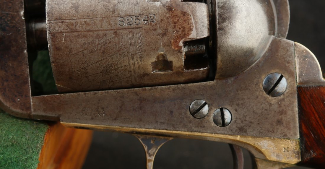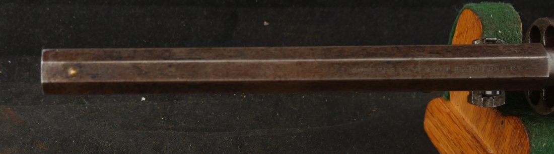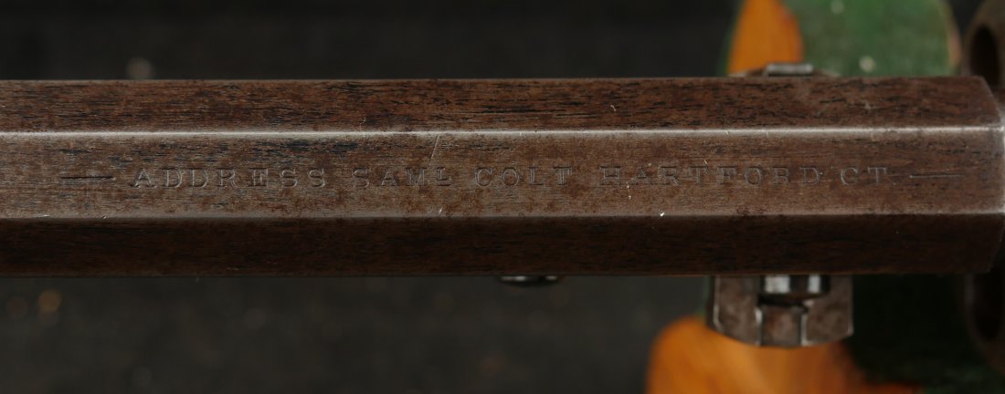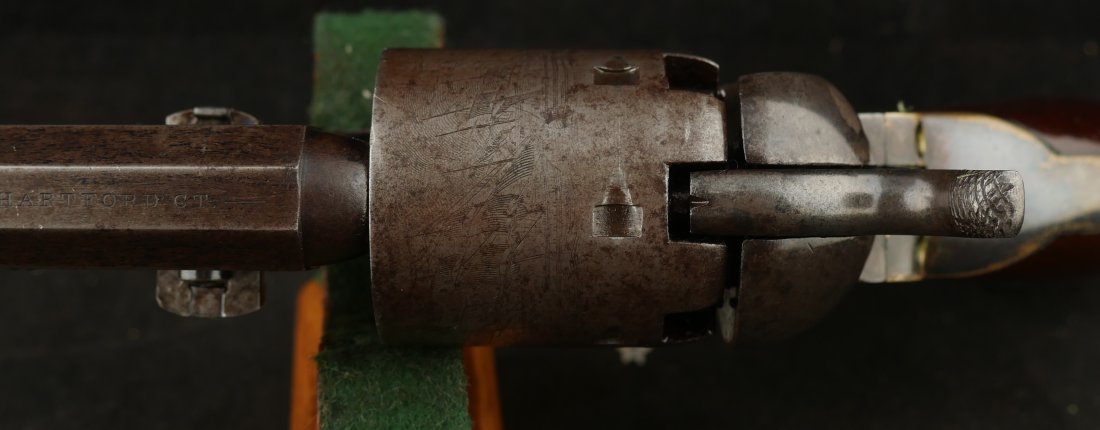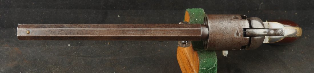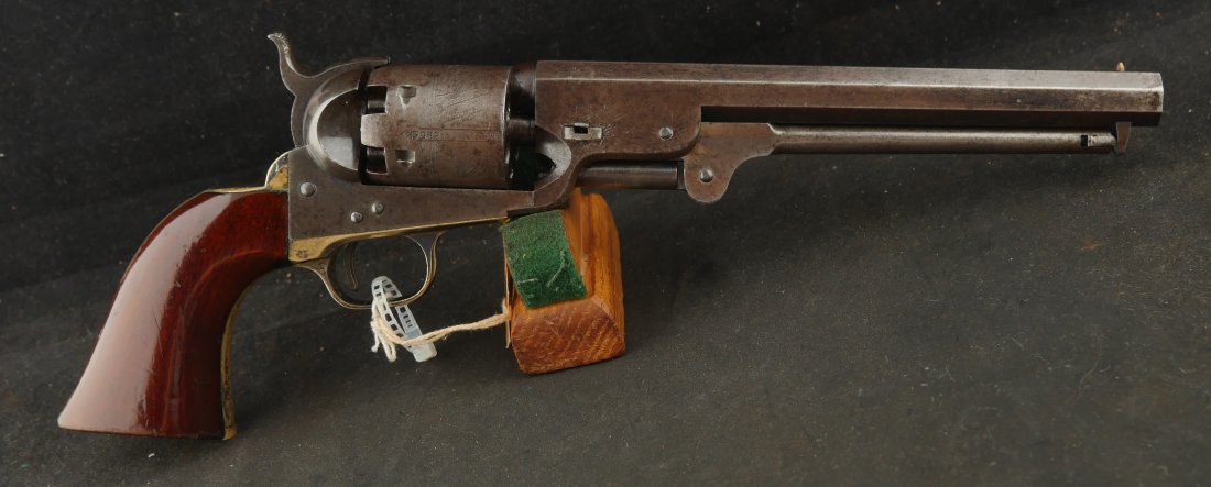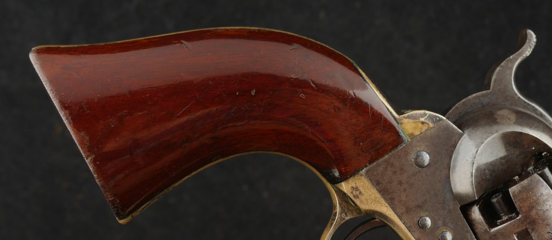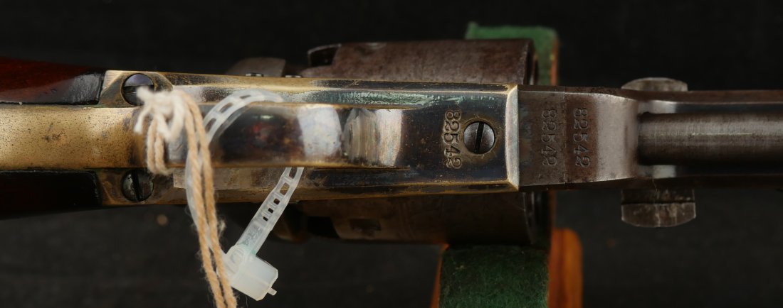 079-1025-7534, Hartford Colt M-1851 Navy, #82xxx, matching, I could not pop the wedge and it was made in 1857. Many of these early Hartford’s were shipped south in preparation of the Civil War. A very fine example with 90% strong scene, 80% original grip varnish with a few minor nicks to grips. The Brass retains 50% tarnished silver with 20% toned rainbow hues on the frame, lever and hammer. The barrel has strong flashes of blue in protected places, 20% overall. The bore is bright, crisply rifled with scattered fine spots. Fine overall.