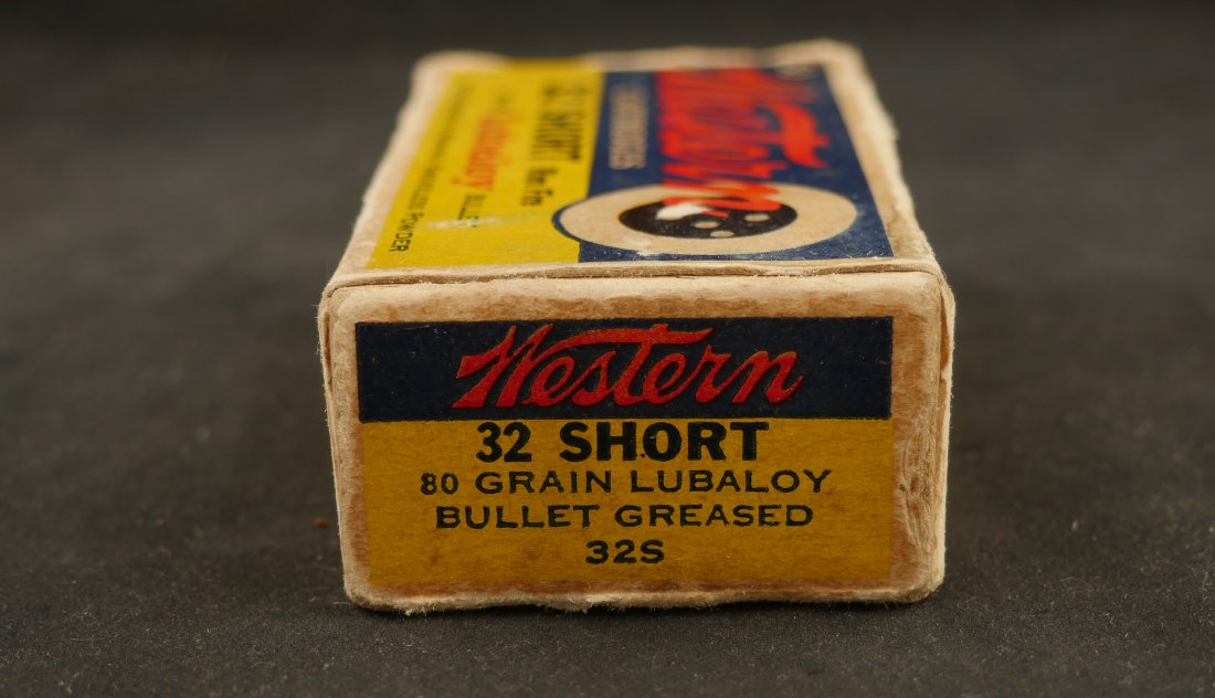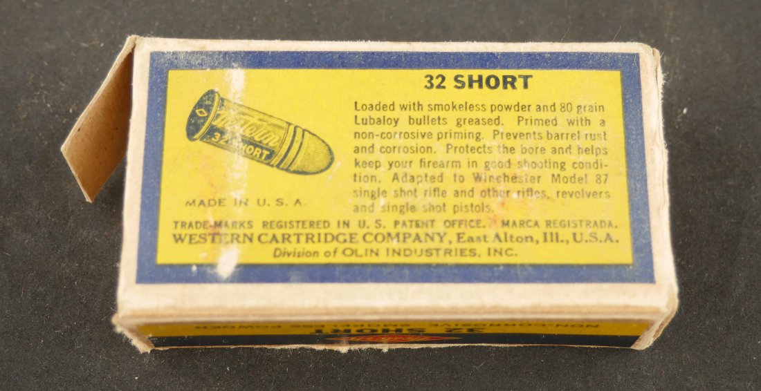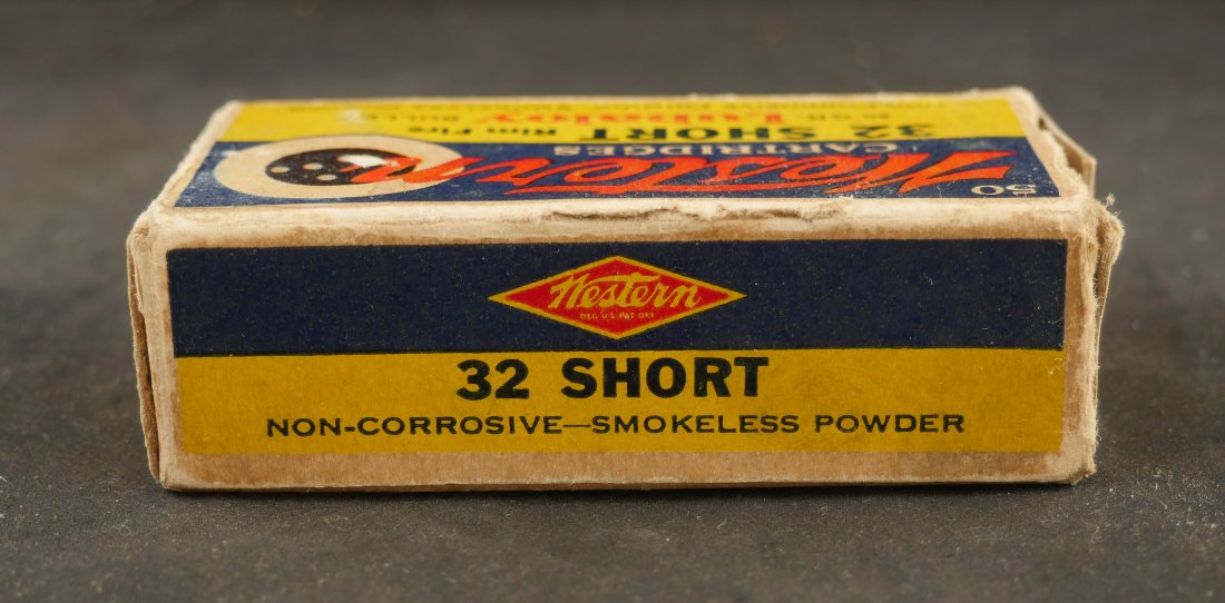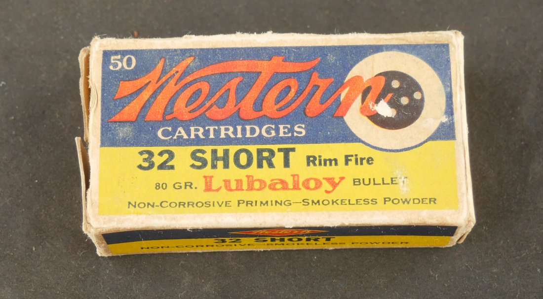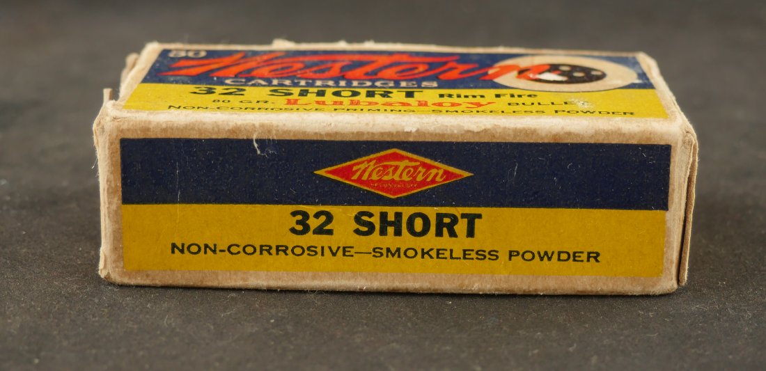 079-1025-CART1, RARE Box of cartridges by Western in .32 short Rim Fire cartridges. The end panel is missing. It feels full. Must ship by UPS ground and only within the continental US.