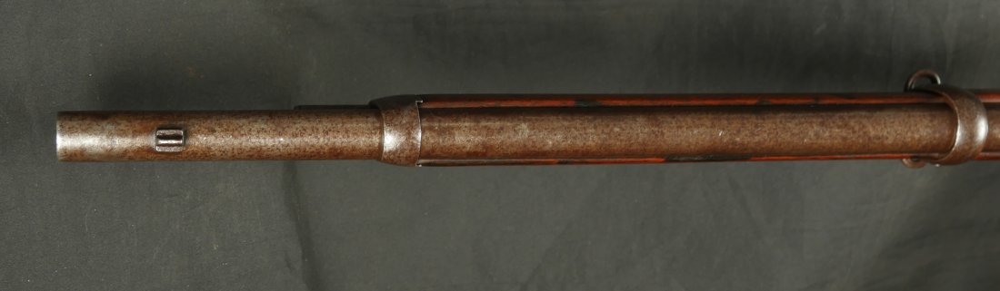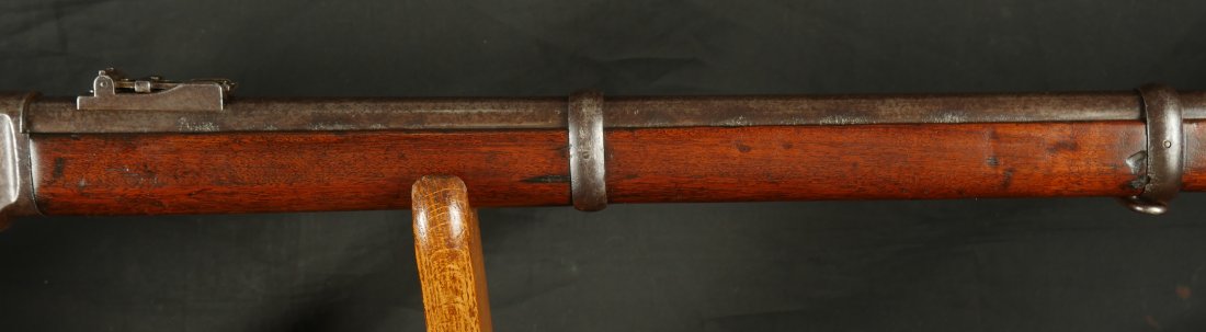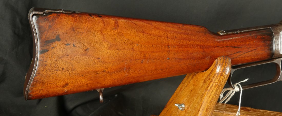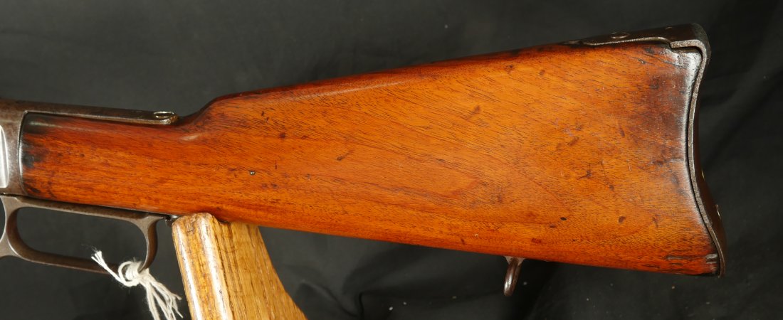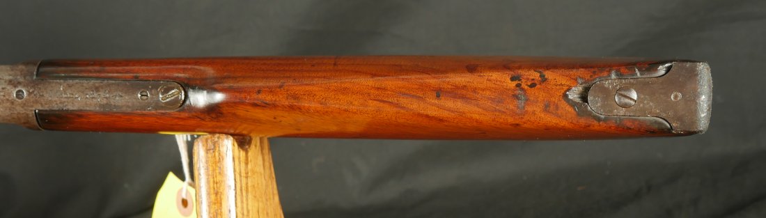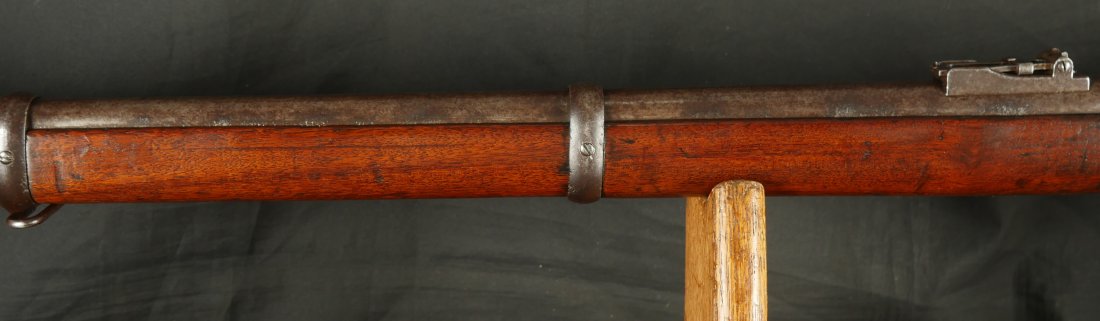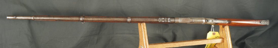 079-1025-D0273, Winchester Model 1873 3rd Model Musket in 44-40, #369xxx made in 1891. Overall the metal is mottled gray with spots of staining. It has clear markings with correct sights. Bright crisply rifled bore with scattered light dust spots and a very slight bulge about an inch from the muzzle. If you are shining your light down the muzzle it is not visible but if you shine the light from the breech you can see a slight ring. It is even difficult to feel on the outisde of the barrel. The metal shows moderate bumps and dings. The stocks shows slight under-sizing near the upper tang. Very good overall, fine bore.