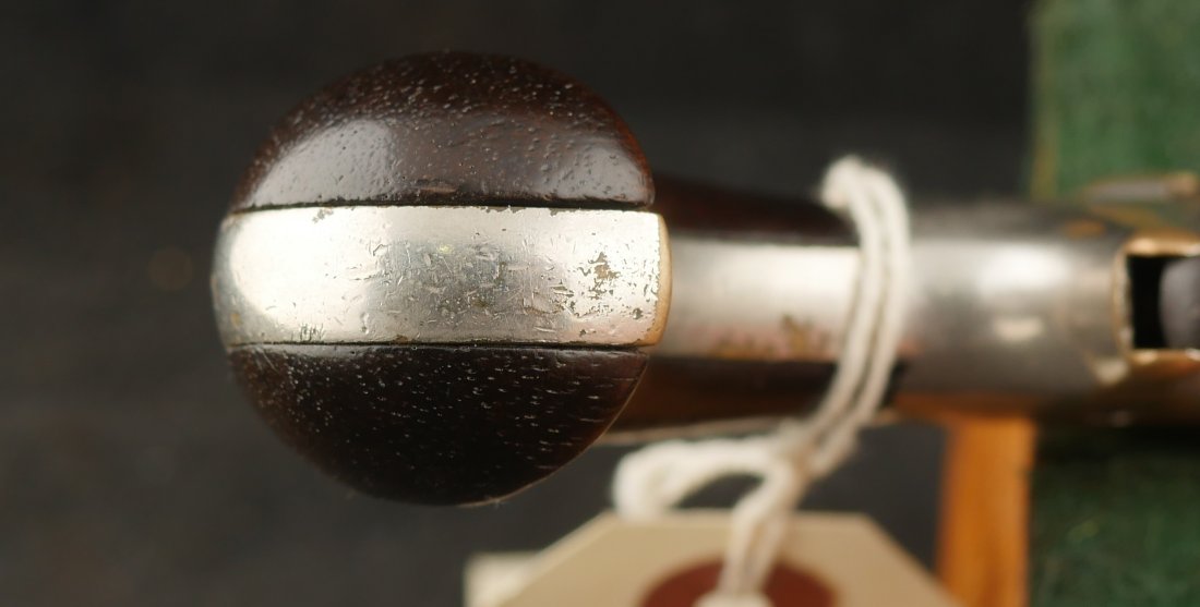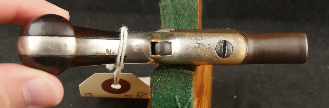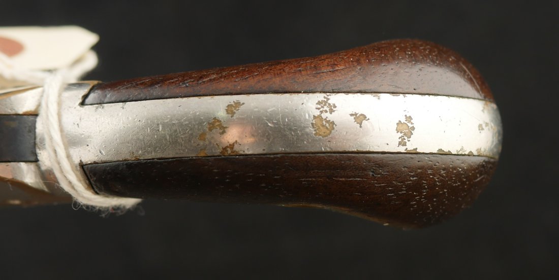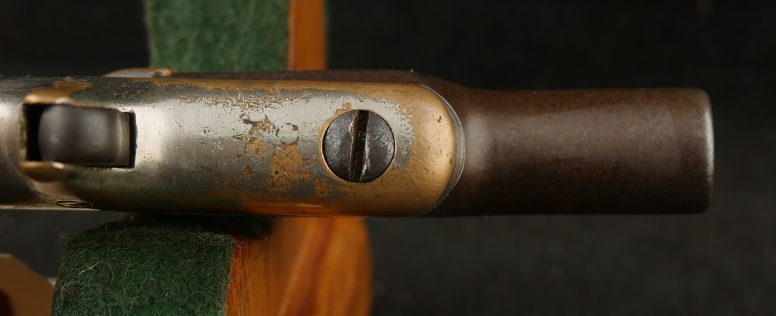 079-1025-P0316, Colt #3 Thuer Single Shot Deringer, .41 RF with 60% silver on the frame, dark brown patina on the barrel. The grip shows light use marks and overall light wear. The markings are clear, with fully rifled bore coated in surface rust. This is the standard model in overall Very Good to Fine condition.