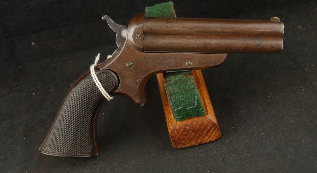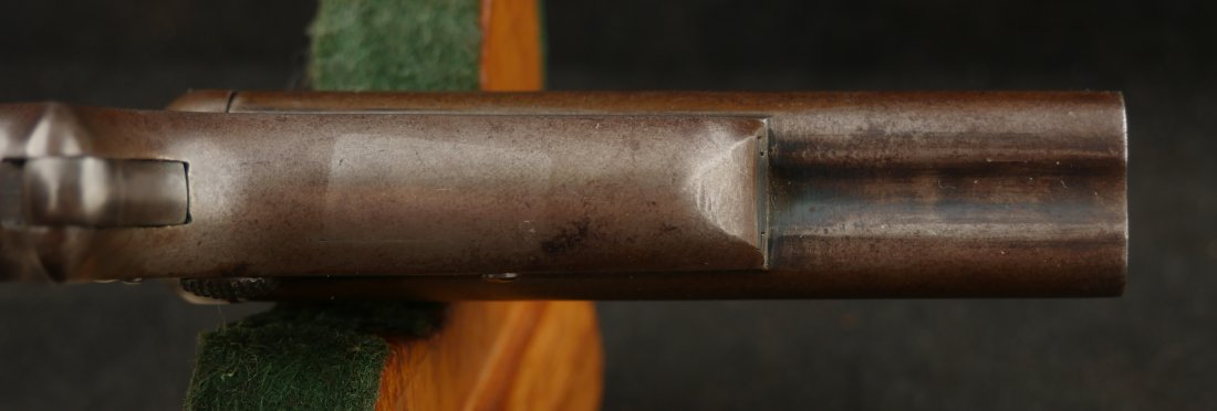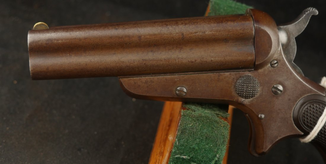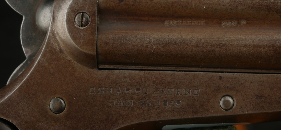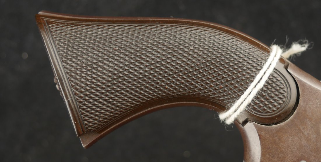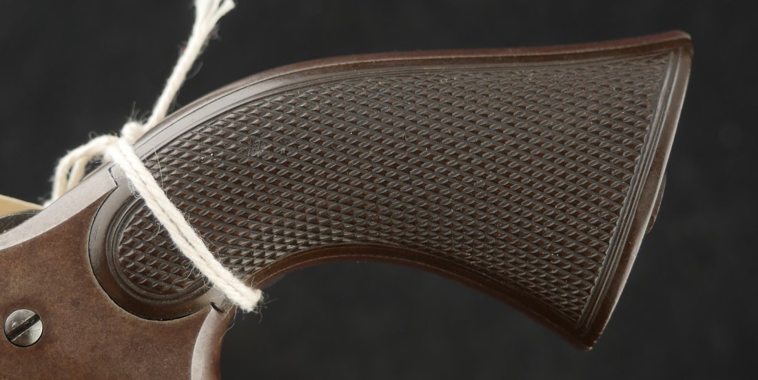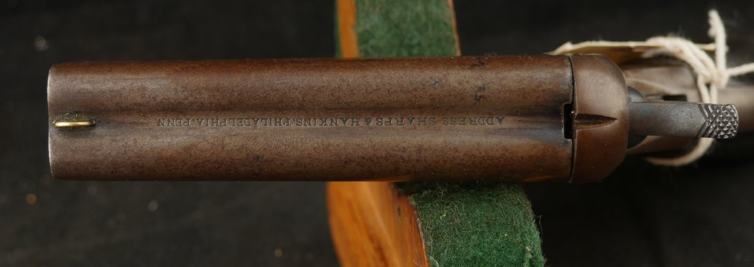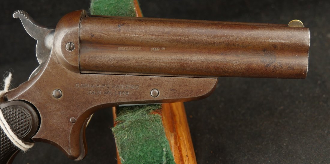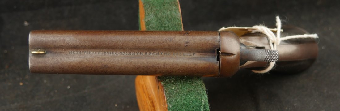 079-1025-P0325, Sharps and Hankins .32 RF, 4 shot with iron frame. Smooth mottled brown patina with traces of blue in protected places. Crisp frame markings with crisp checking on the gutta percha grips. There is a small chip on the front of the grip. The action is crisp and the ejector functions along with the cylinder pin rotating. Very good overall, a very handsome gun.
