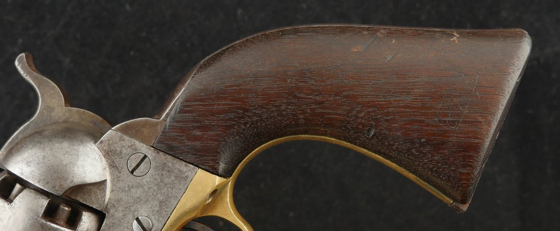 079-1025-P0329, Colt M-1860 Army .44 percussion, 6 shot, #106xxx matching on visible numbers with mottled gray stained exterior.80% strong scene with clear markings and made in 1863. 2 strong grip cartouches with crisp tight action. A few scattered patches of fine pinprick pitting on the frame and the barrel. The cylinder shows a patches of fine its. Very good overall. The bore is strongly rifled with a fine coating of surface rust. A few tiny spots of fine pinpricks scattered about the bore.