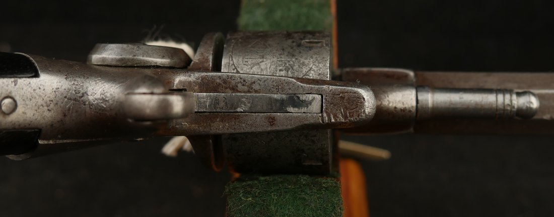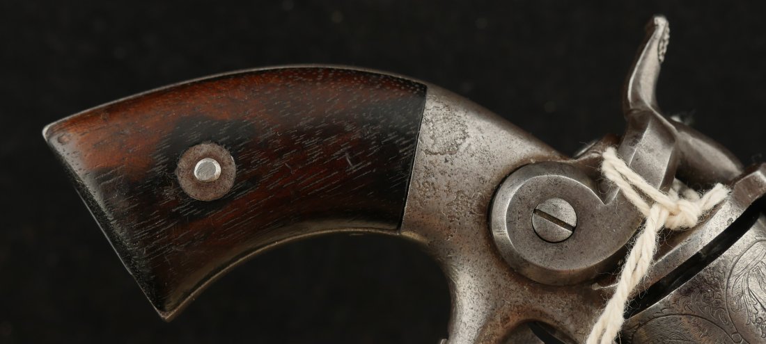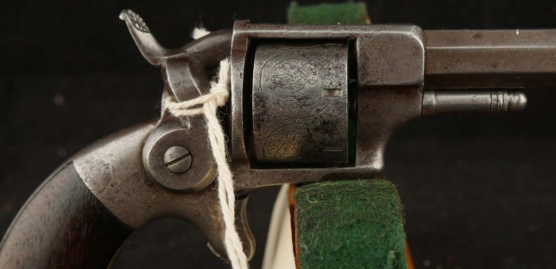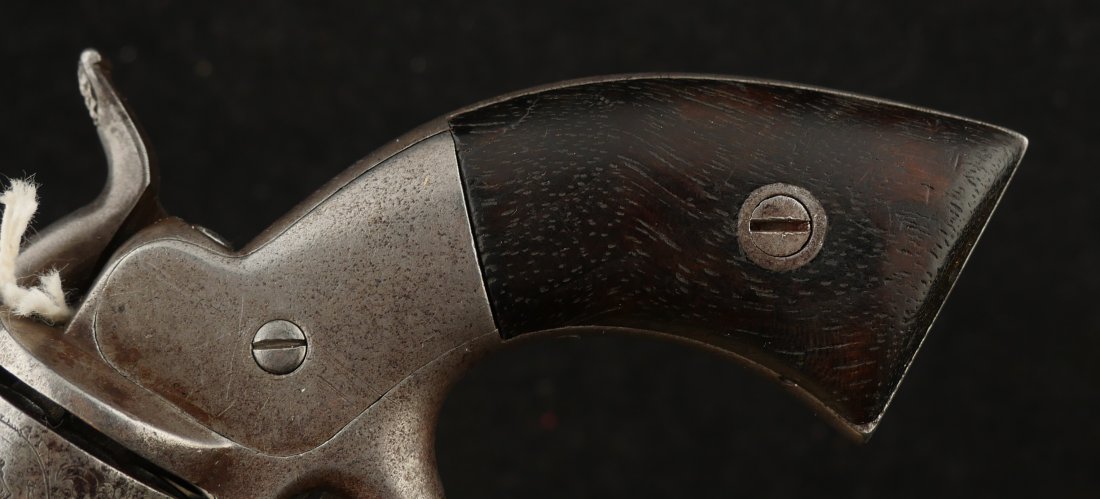 079-1025-P0348, Allen and Wheelock .22, 7 shot with 80% cylinder scene and visible, but light markings on the barrel. The iron frame, barrel and backstrap. The action is functional with light wear to the grips.