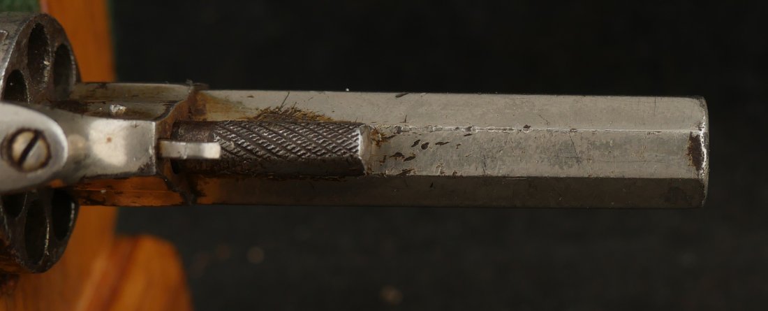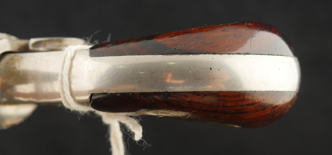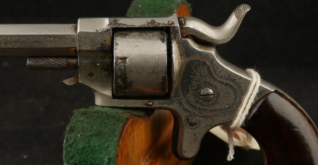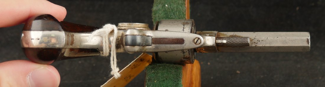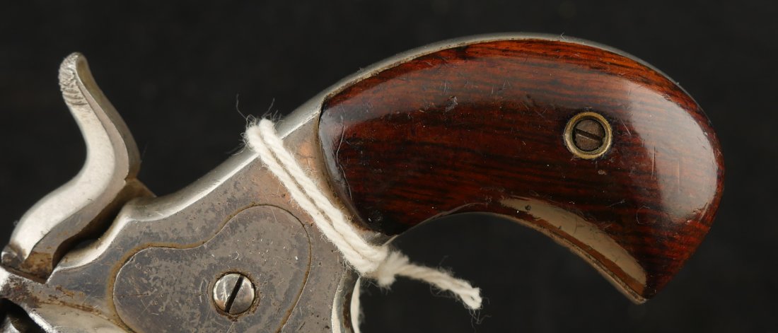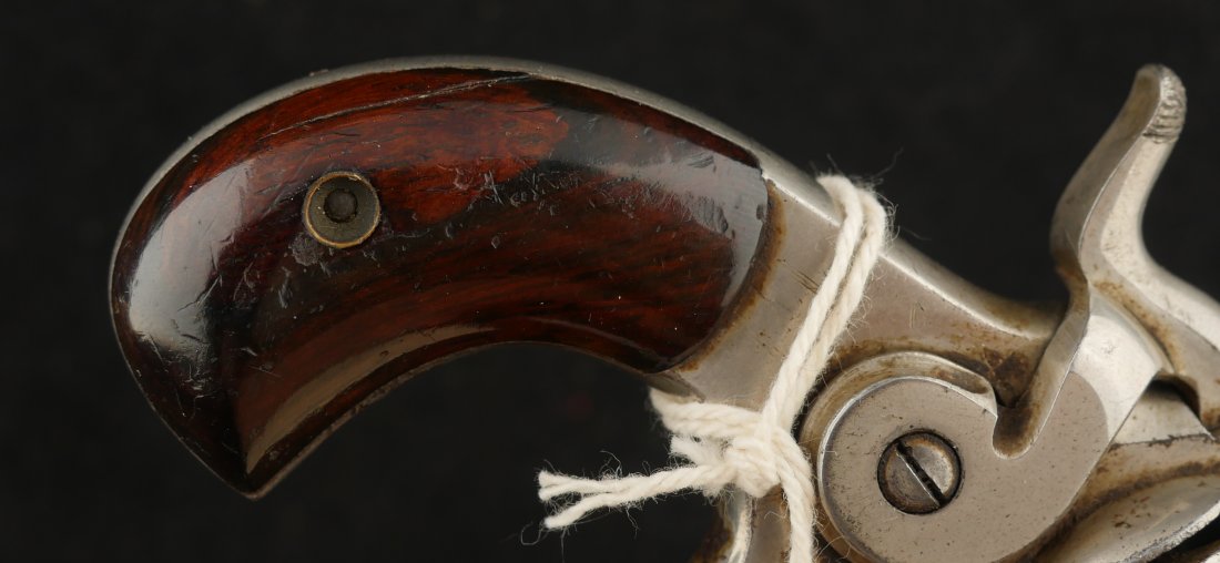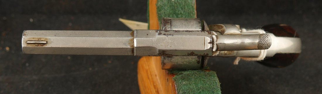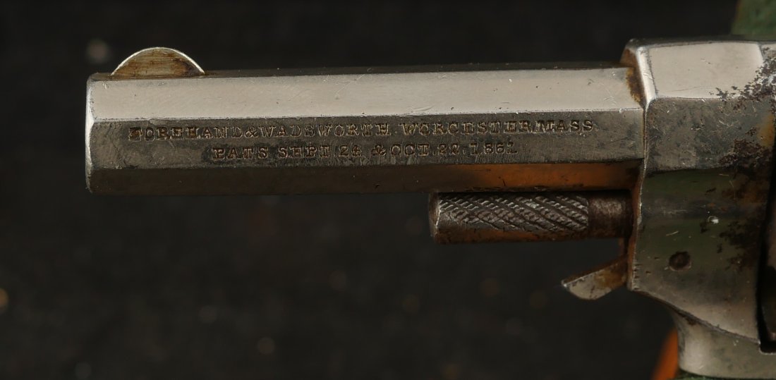 079-1025-P0349, Forehand and Wadsworth side hammer .22 RF cal, 7 shot. Functional action with weak cylinder stop. The gun has clear markings and 70% nickel with spots of staining. The bore is clearly rifled with scattered spots of surface residue. The grips retain about 80% original varnish. Fine overall.