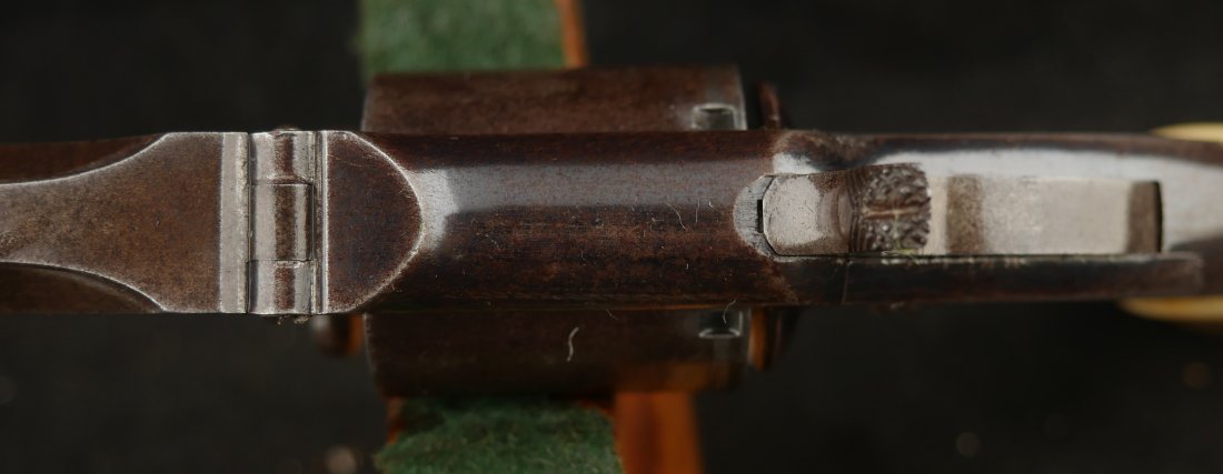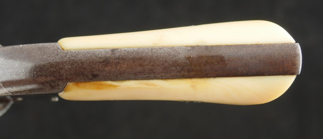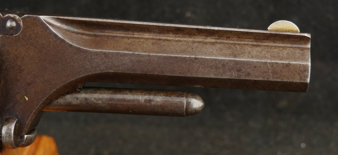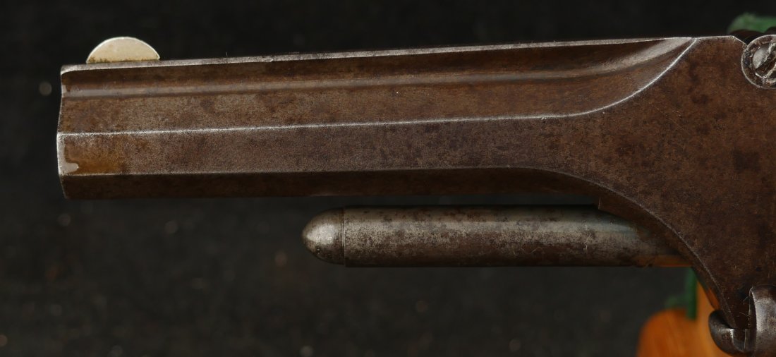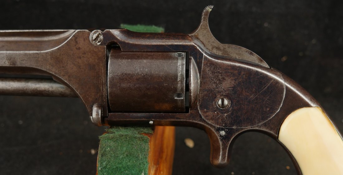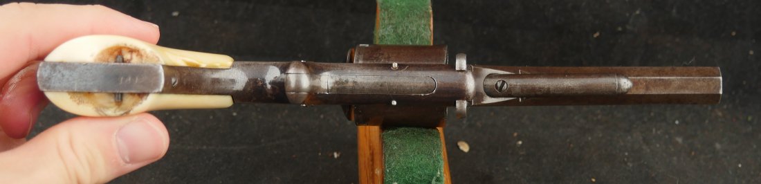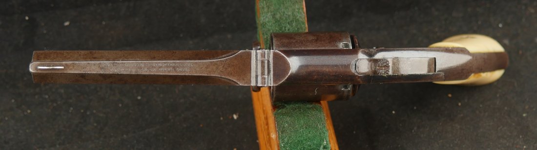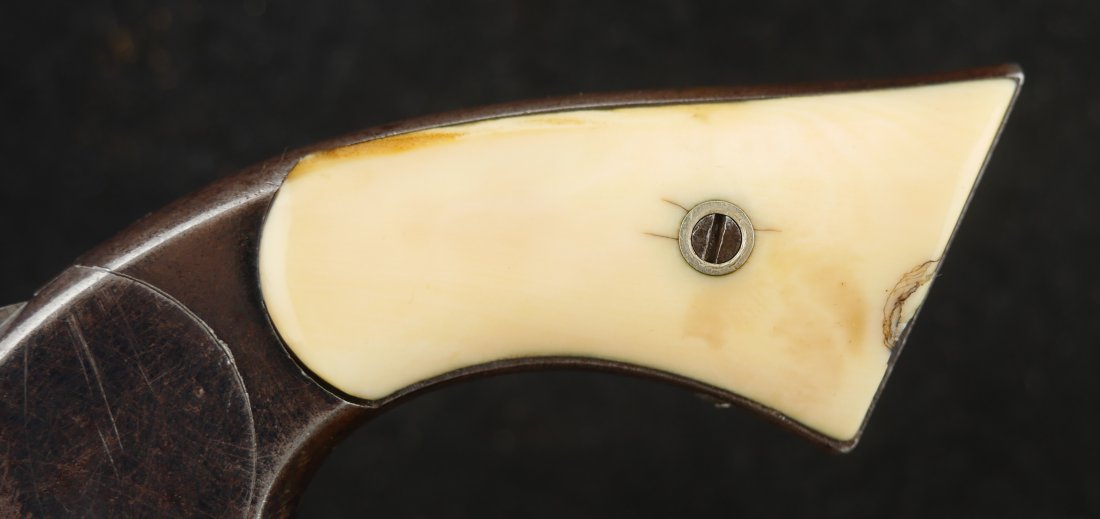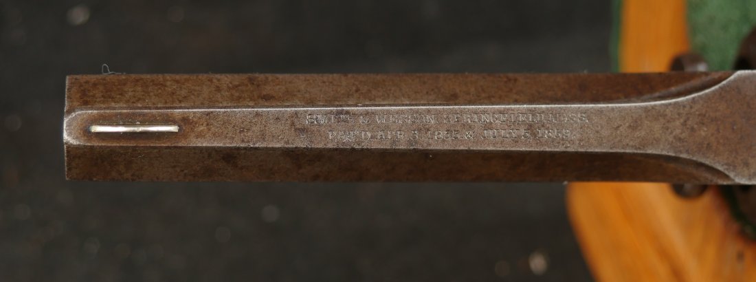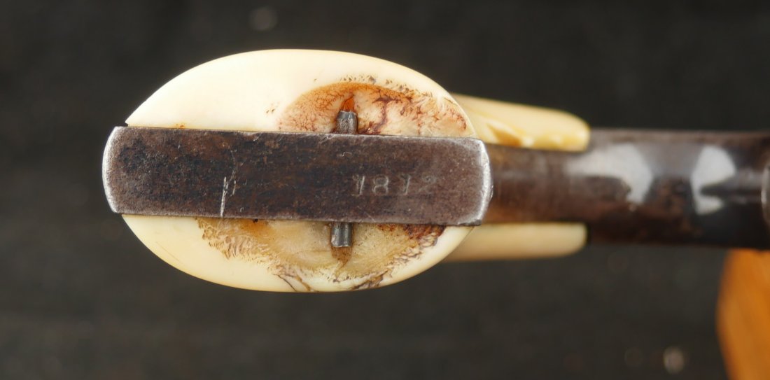 079-1025-P0356, Smith and Wesson M-1 1/2, 1st issue with ivory grips. The gun retains 50% deep blue that is mixing to brown patina. The hinge is tight. The action is functional, but the cylinder stop is not holding stop. The stop spring is slightly weak. The bore is rifled with shows shallow spotting the entire length. There is a chip on the bottom of the ivory grip. Very good to fine overall.