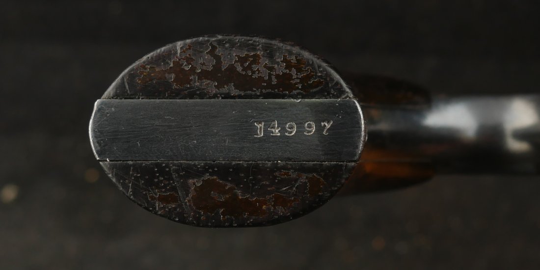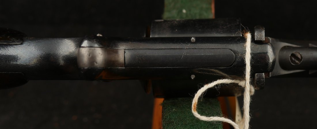079-1025-P0357, Smith and Wesson M-1 1/2 1st issue, 5 shot .32 RF. The gun shows a refinish with scattered very fine pinpricks under the blue. A smattering of fine bumps and dings. The action functions and the grips show minor bottom edge loss with 40% original varnish. The markings are clear. Very good overall. The bore shows scattered shallow spotting the entire length.