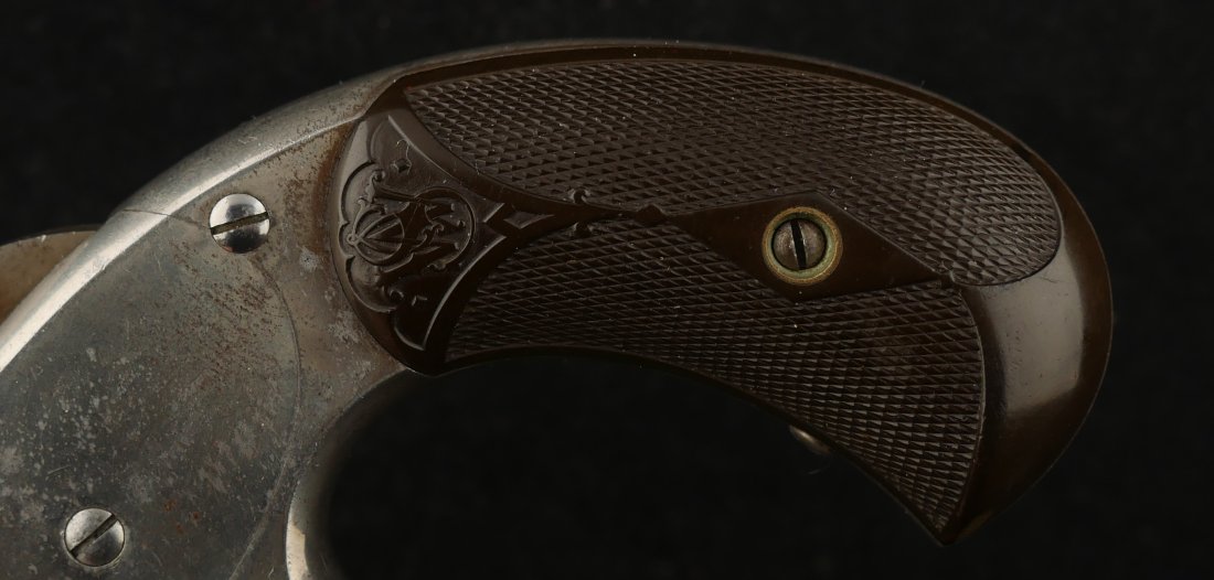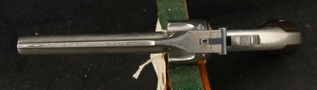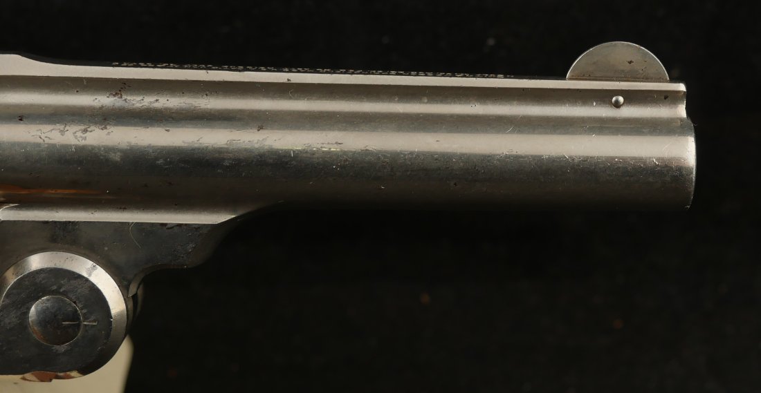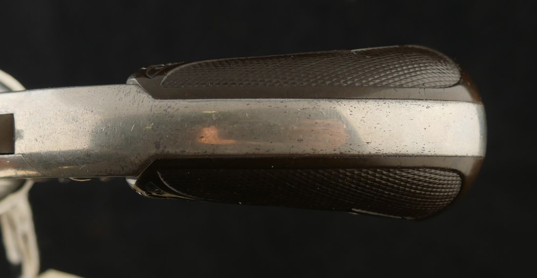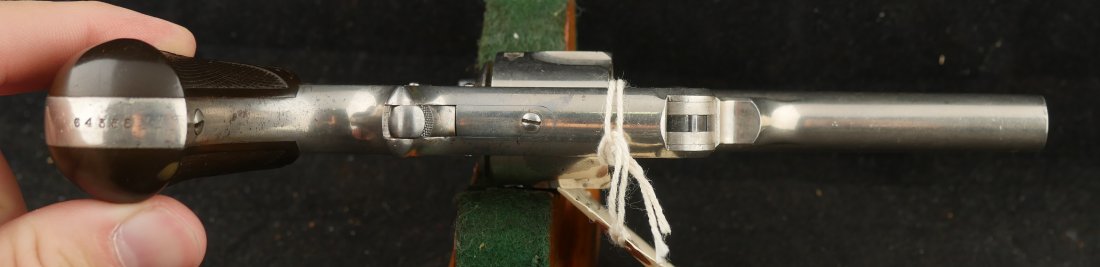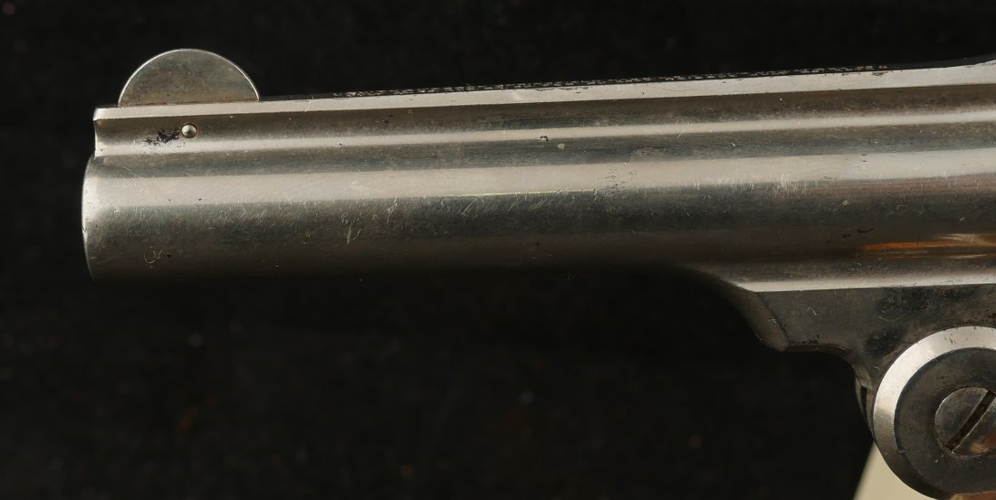 079-1025-P0358, Smith and Wesson Model 1 1/2 SA .32 CF, 90% bright original nickel with crisp action. The grips show light wear and crisp checking. The hammer retains 80% case colors with bright crisply rifled bore and crisp action that locks up tight. Excellent overall.