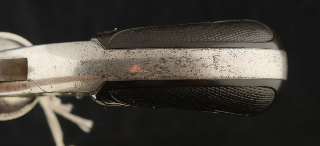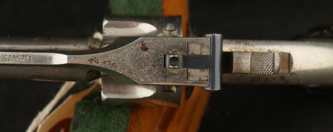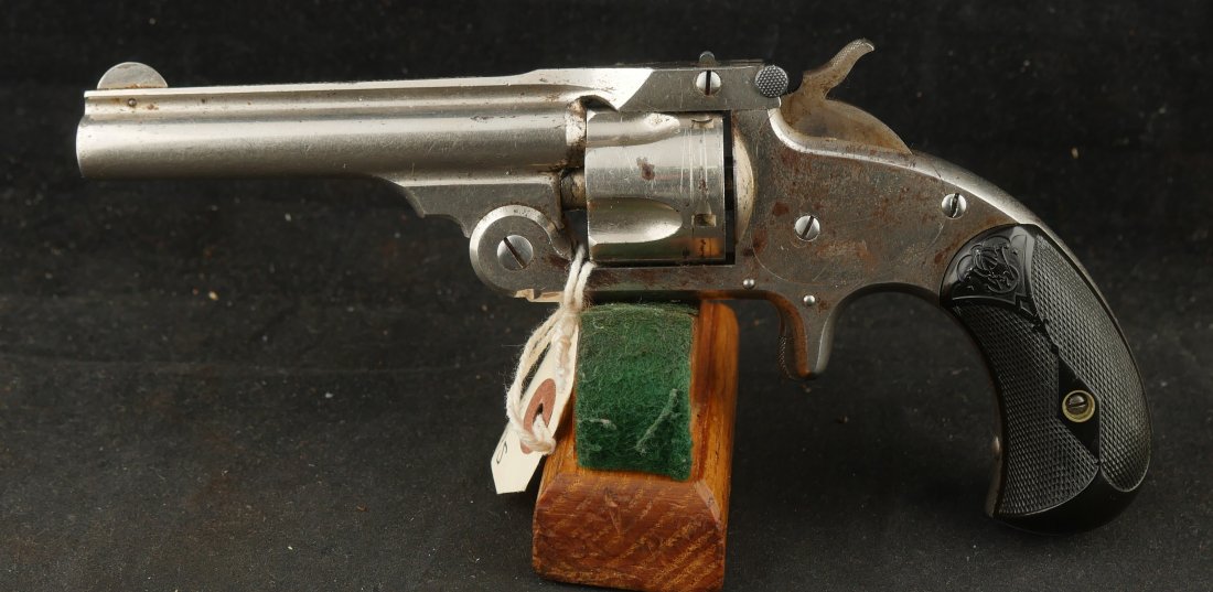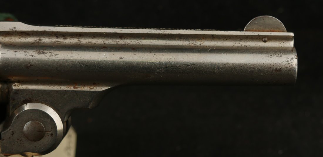 079-1025-P0359, Smith and Wesson M-1 1/2 SA .32 CF with crisp tight action. The gun retains about 50% nickel with scattered staining with crisp checkered grips. The bore shows strong rifling with scattered spotting and functional ejector spider. Clear markings, very good overall.