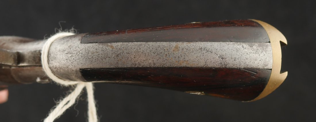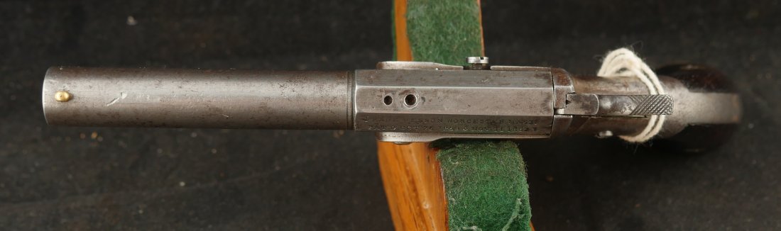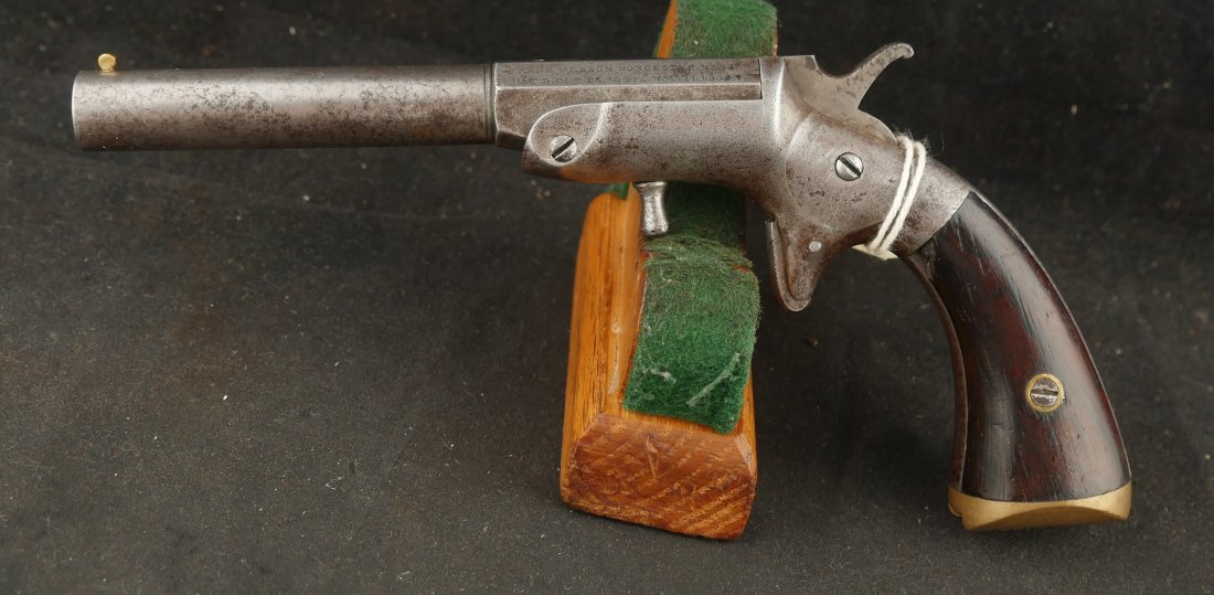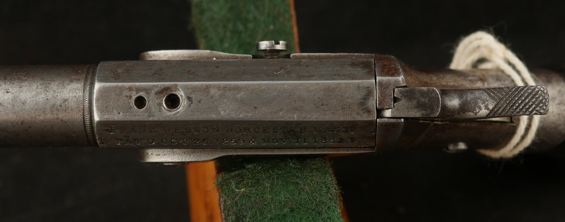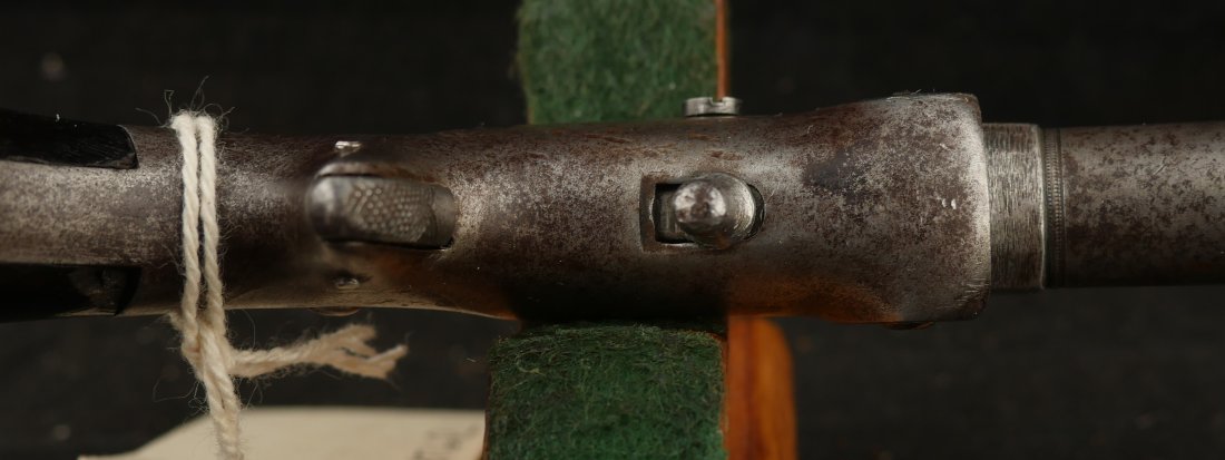 079-1025-P0360, Frank Wesson single shot .30 RF cut for stock. It has iron frame and iron barrel. The gun has had a rear sight and the muzzle has had some gun smithing. #4xx the butt bulb is brass. The action is functional, the bore is rifled with scattered fine spotting the length of the bore.