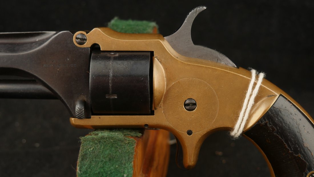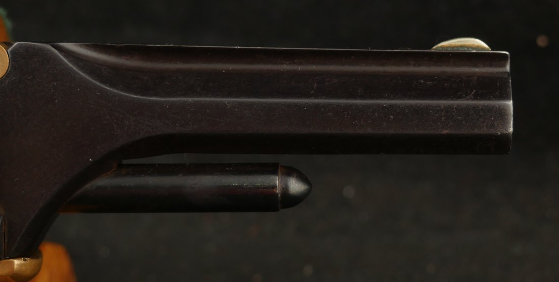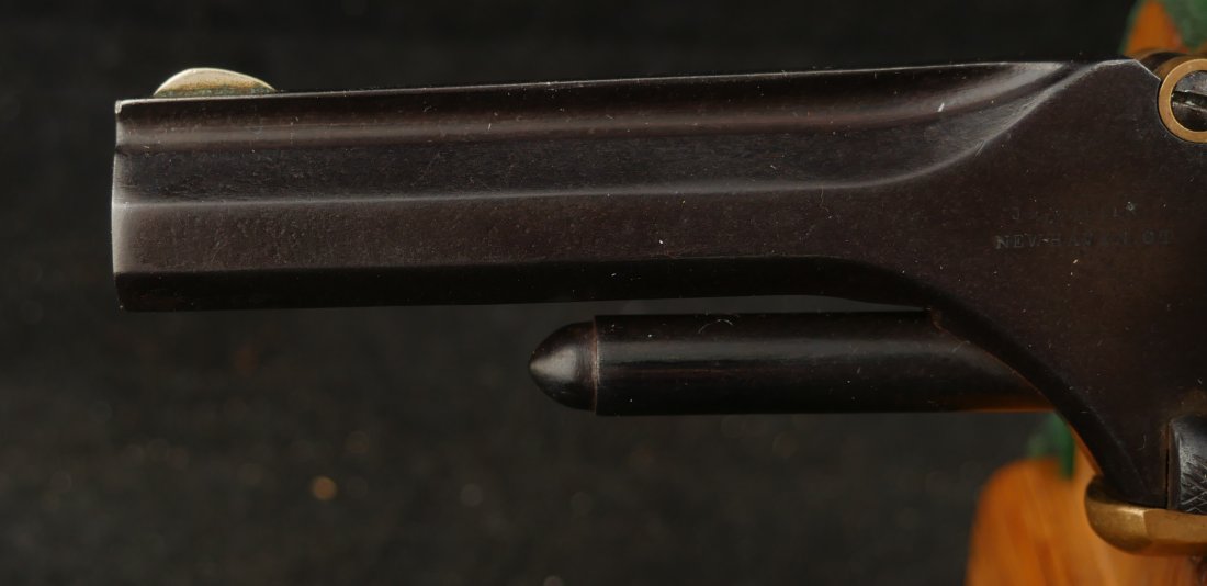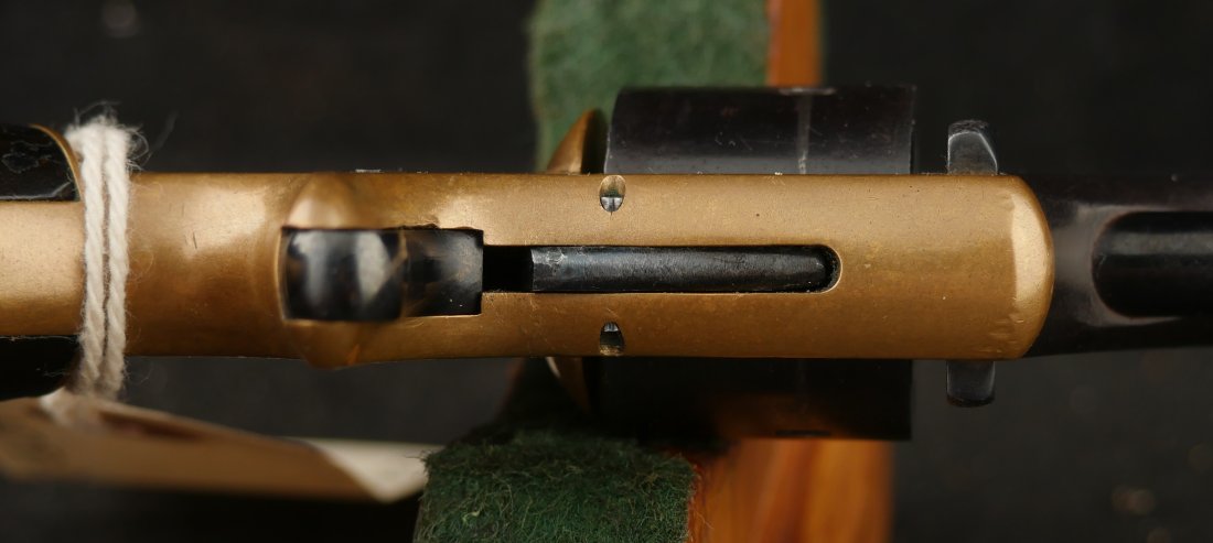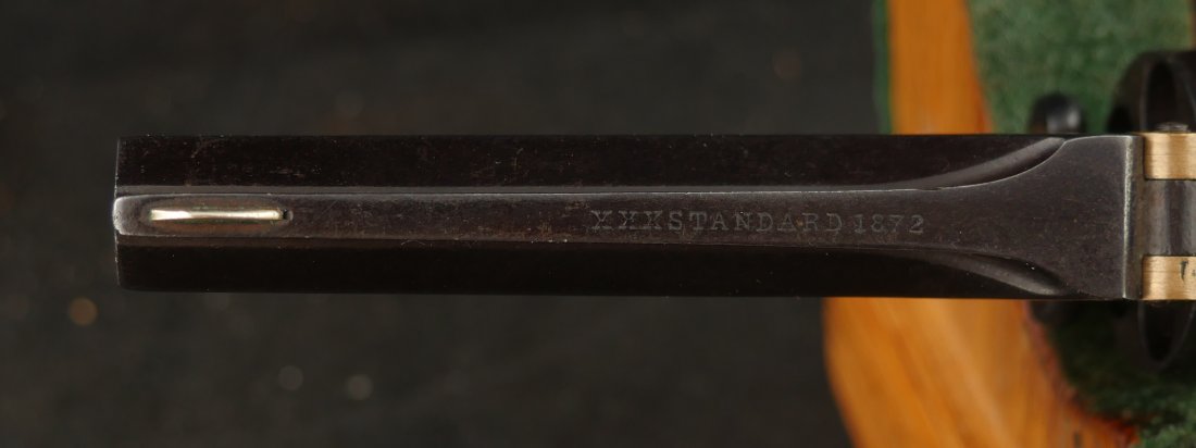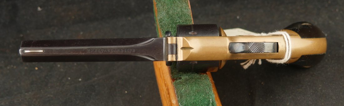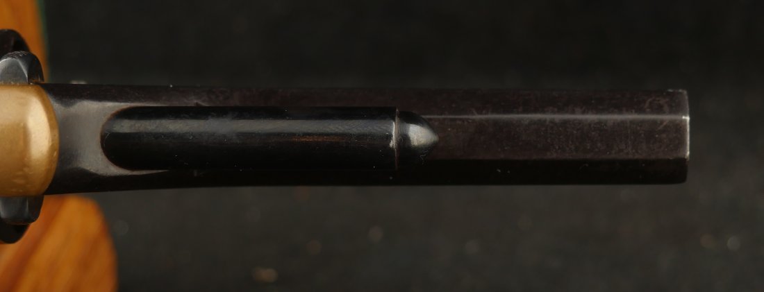 079-1025-P0374, Pre-1890, Marlin XXX Standard .30 RF, 5 shot with a reblue on the barrel and the cylinder. The markings on the side of the barrel are weak an partially obliterated. The markings on the top of the barrel are light but legible. The metal that was refinished was buffed prior to refnish. The hammer has a renitre blue with crisp action and the cylinder tightly locks up. The grips retain about 60% original varnish. The bore shows very good rifling with scattered shallow spots in patches. 26000 made from 1872-1887. Very good overall.