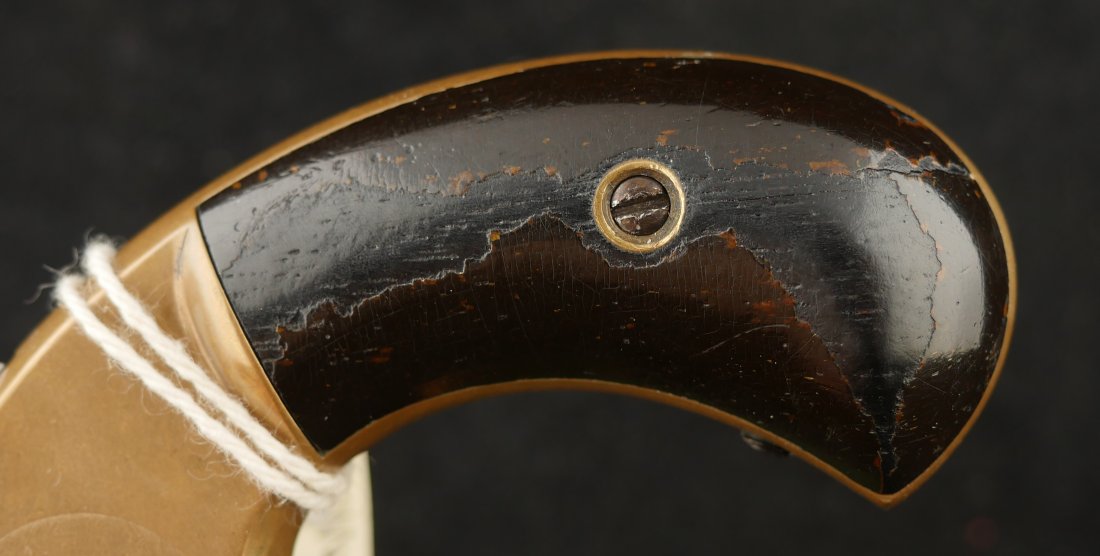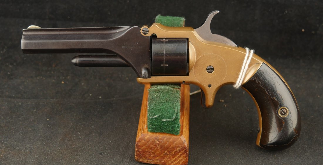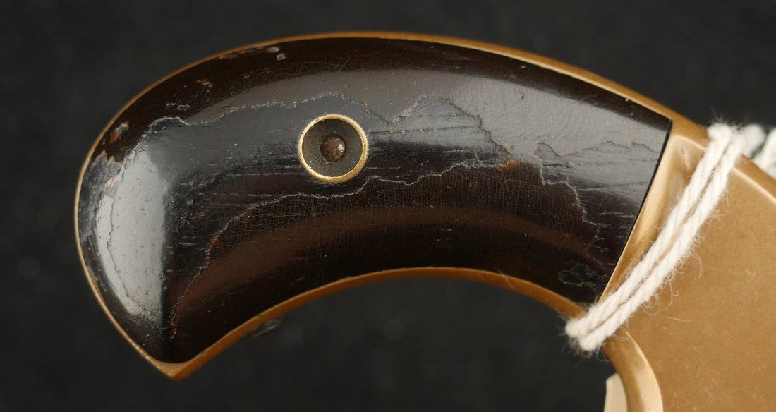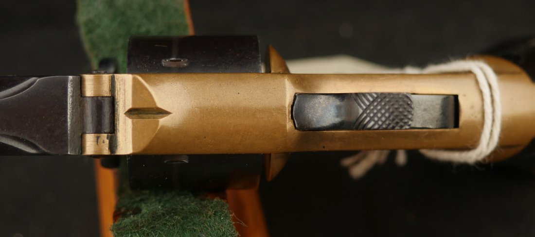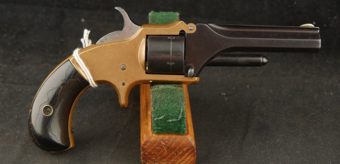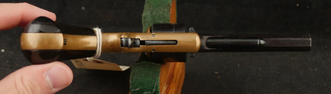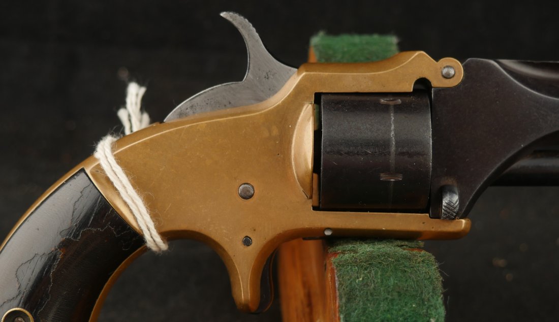 079-1025-P0374, Pre-1890, Marlin XXX Standard .30 RF, 5 shot with a reblue on the barrel and the cylinder. The markings on the side of the barrel are weak an partially obliterated. The markings on the top of the barrel are light but legible. The metal that was refinished was buffed prior to refnish. The hammer has a renitre blue with crisp action and the cylinder tightly locks up. The grips retain about 60% original varnish. The bore shows very good rifling with scattered shallow spots in patches. 26000 made from 1872-1887. Very good overall.