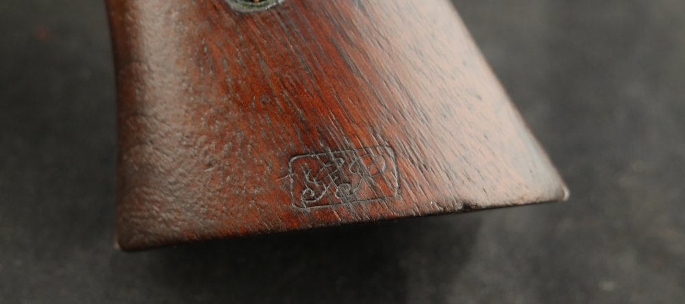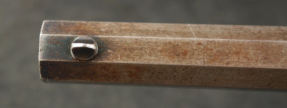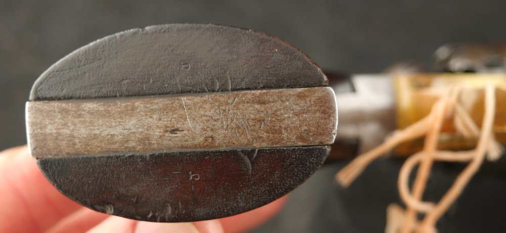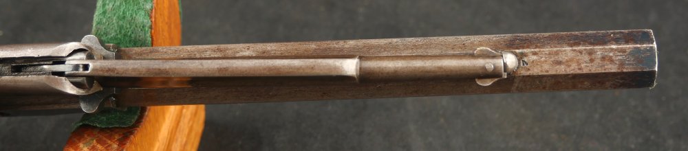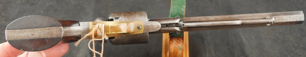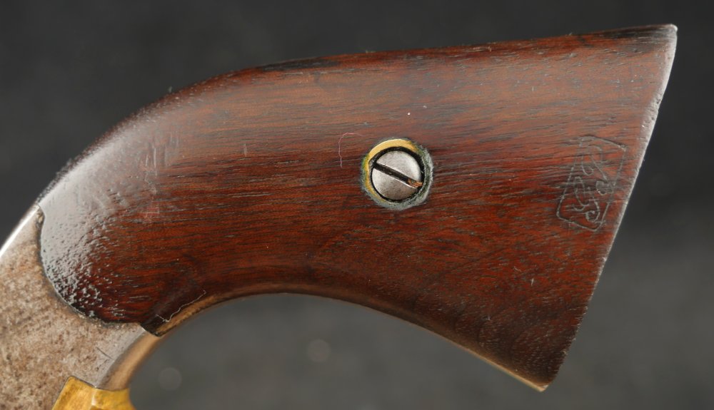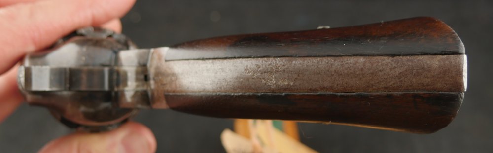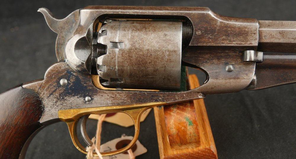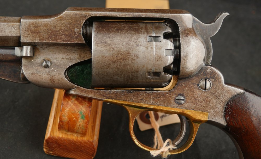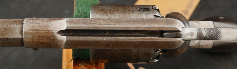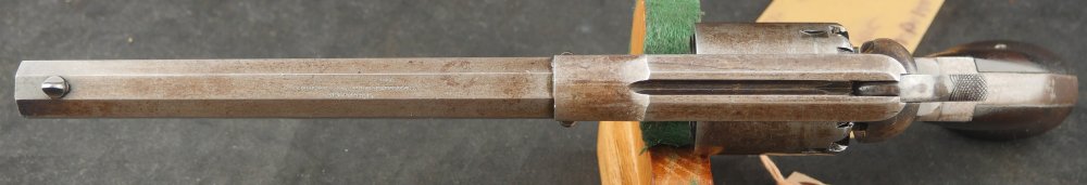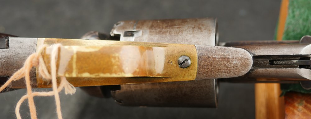 079-1121-7703, Remington NM Army .44, 6 shot. Excellent grips with vivid cartouche, sub inspector marks on bottom of grips. Strong flashes of blue on lever, protected places of barrel and frame. With strong flashes iof blue on side of frame, crisp edged rifling, bright fine bore. Vivid crisp address on barrel. Fine overall, the gun basically was an exceptional gun that has blue fake and fade, but no serious wear. Almost no wear to grips.