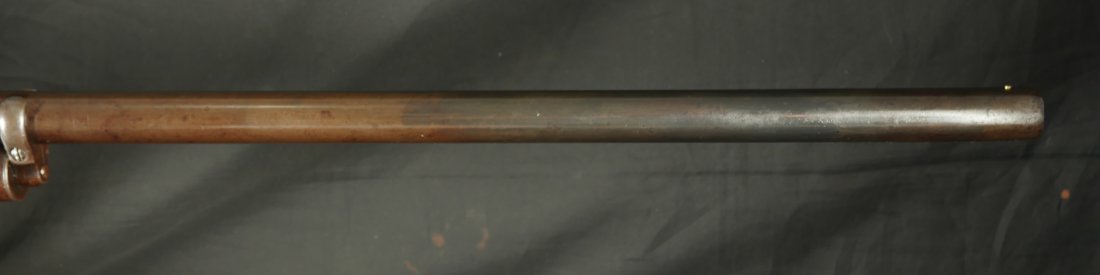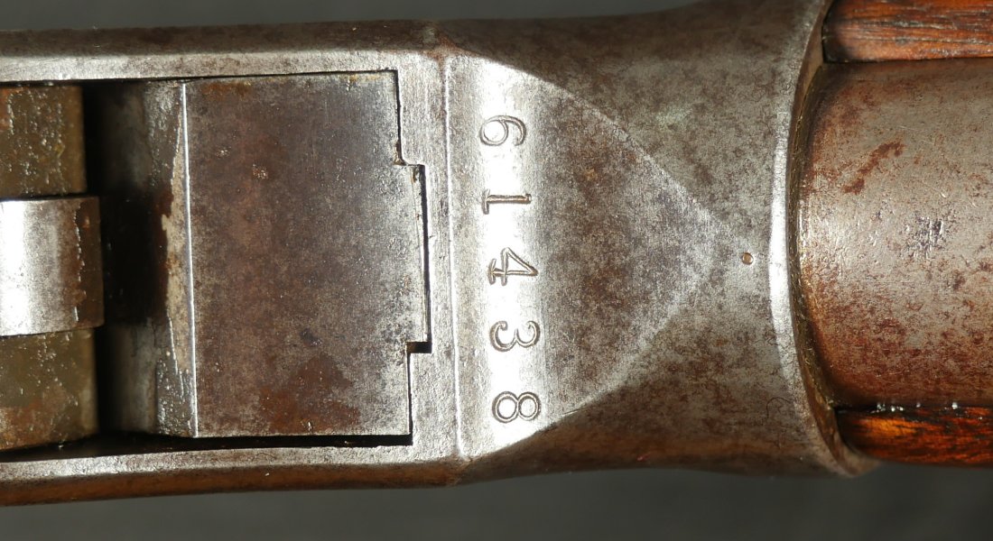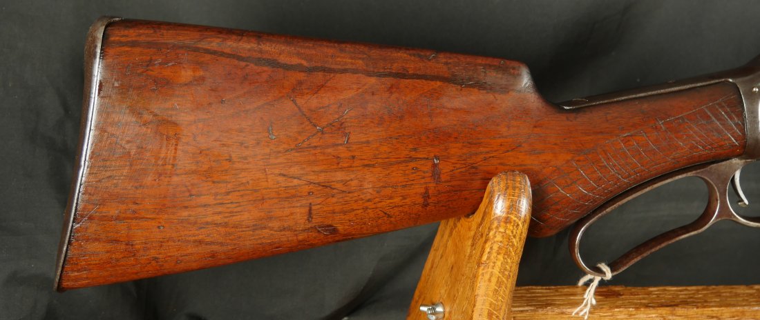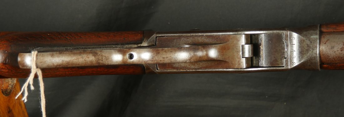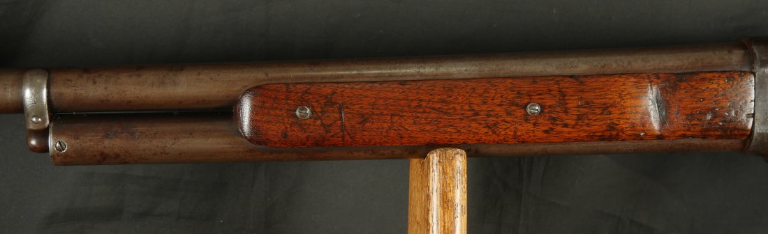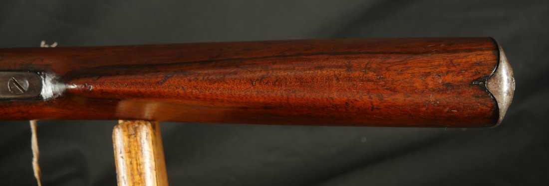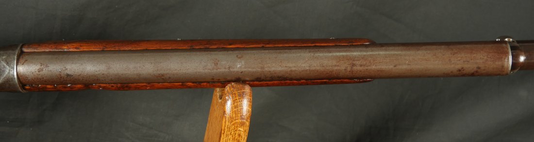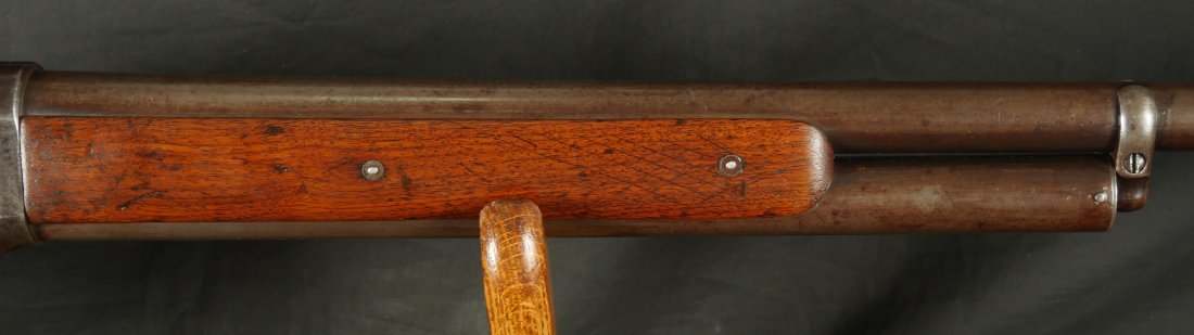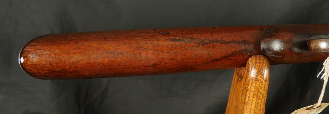 079-1125-9323, Winchester M-1887 lever action shotgun, the gun Terminator made famous. In 12 gauge 32 inch barrel. #61xxx. made 1898. (Flayderman’s Guide). Smooth mottled brown patina with thin traces of blue in protected places on the tubes and on the bottom of the frame. Light use marks to the metal, moderate bumps and dings to the stocks with slight undersizing on the tangs. Moderate wear to the checking on butt stock. Moderate patches of surface residue in the bore. Functional action. Good to very good overall. These have been impossible for me to offer recently, every time I buy one, it sells at a show, so I hid this one to be able to offer to my customers on the site.