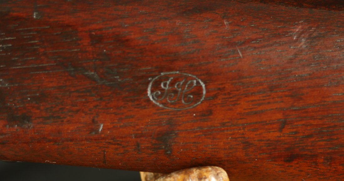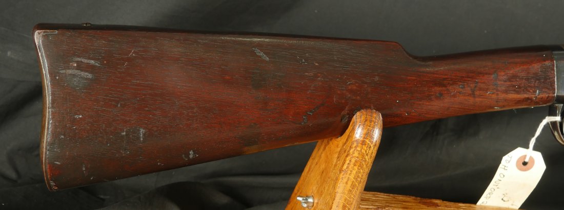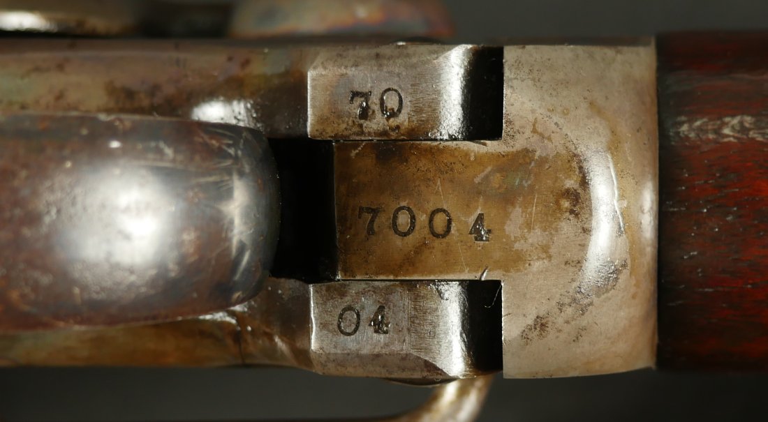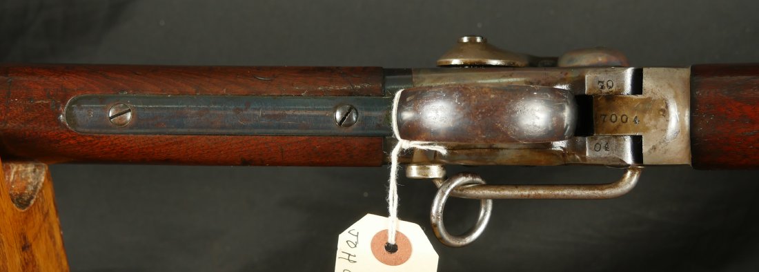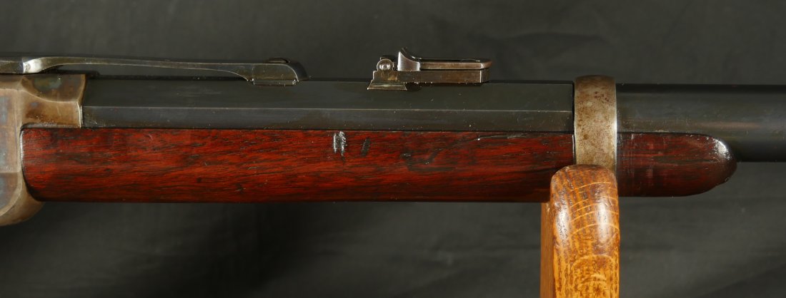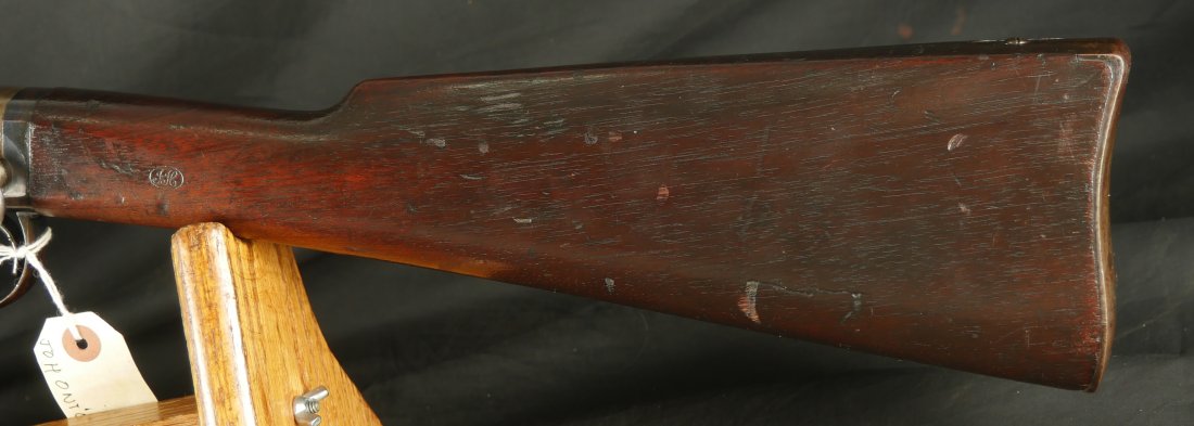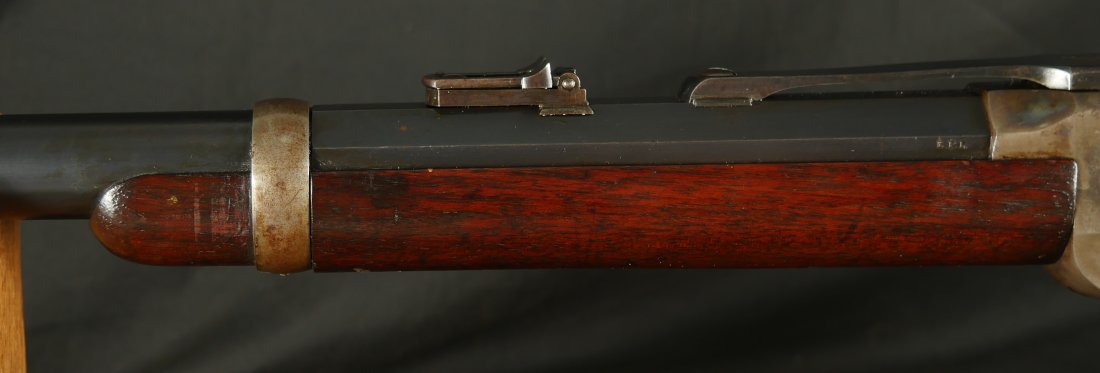 079-1125-9328, Smith .50 cal CW Carbine in unissued condition, just a smattering of light bumps and minor scratches mainly from gun shows over the years. 95% deep blue. 95% vivid rich case color on the frame and hammer. The stock shows a clear cartouche with a smattering of light bumps and dings to the wood. The bore is mirror bright, excellent plus barrel and frame, the stock is excellent, excellent plus bore.
