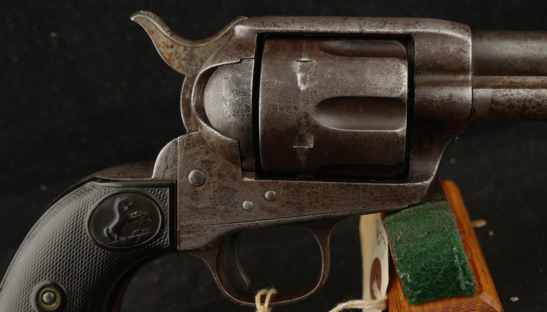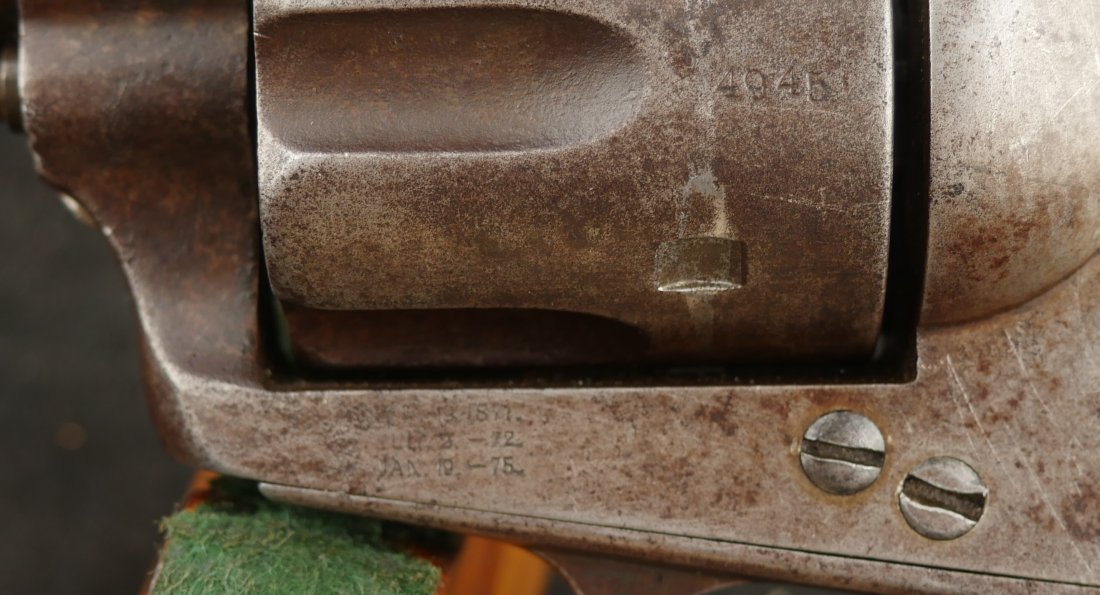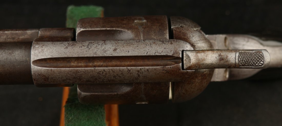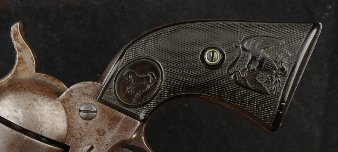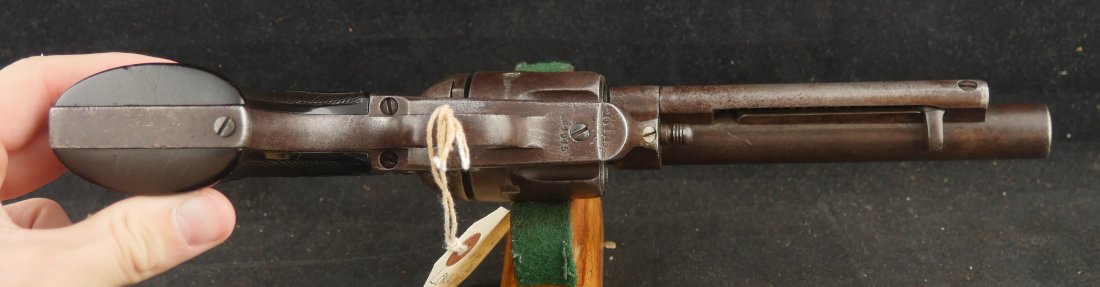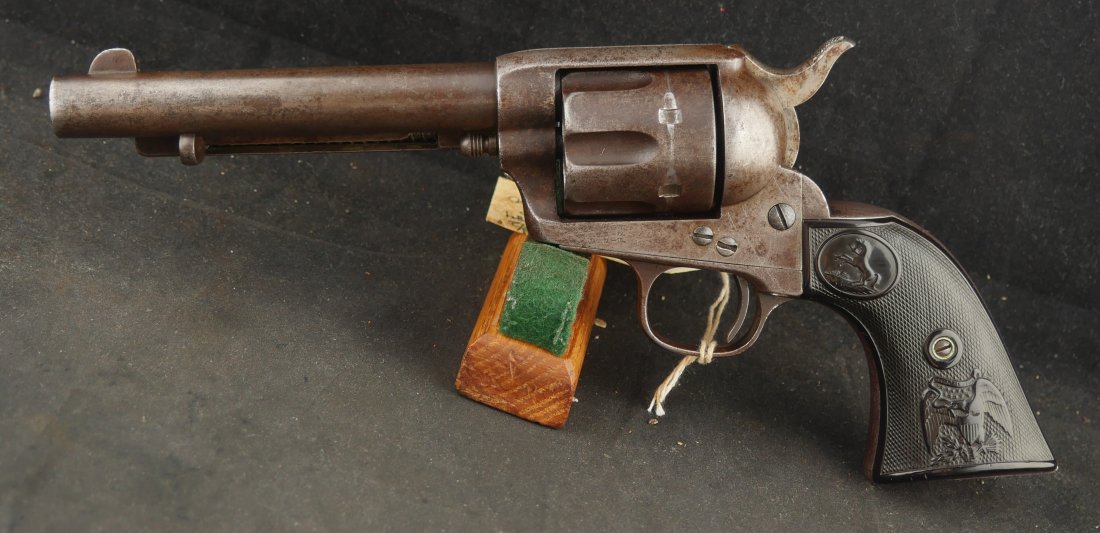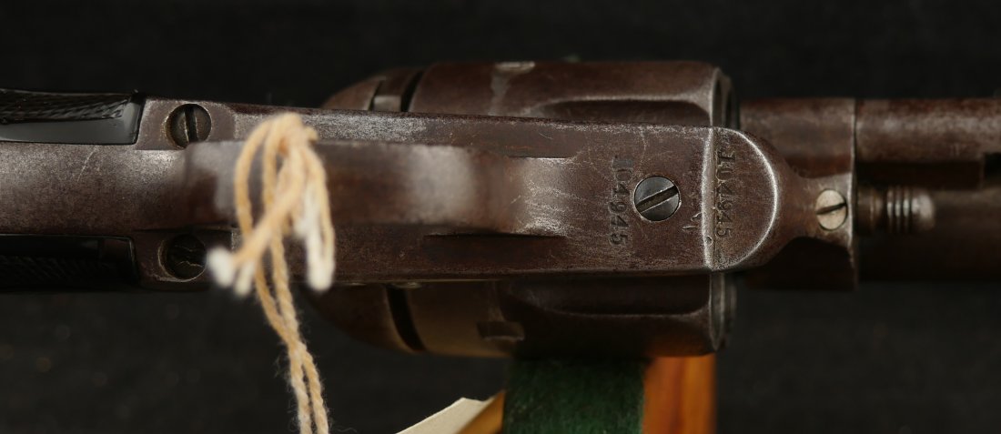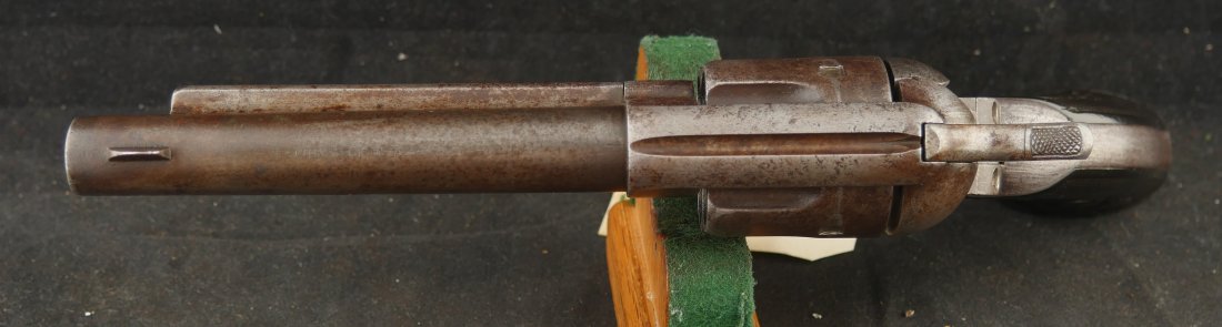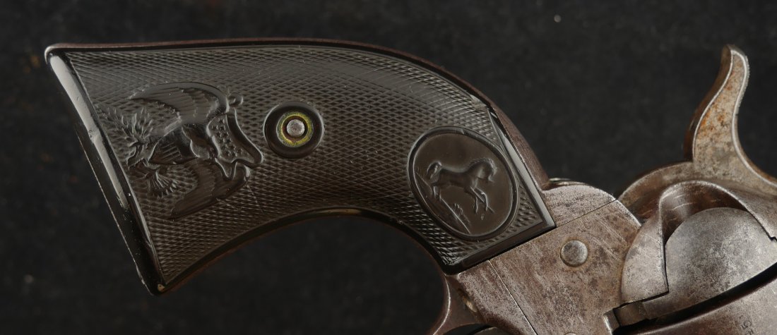 079-1225-9360, Colt SA .45 with 5 1/2 inch barrel and original gutt percha eagle grips. #104xxx made in 1884. All exterior numbers match including cylinder and barrel. The exterior is mottled dark gray patina with traces of nickel remaining. Under the ejector rod housing is strong flashes of original nickel, showing the gun was originally nickeled. The markings are clear, it is basically untouched with the only exception being 2 possible replaced screws. The action is crisp, the gun shows years of honest carry usage. The bore is fully rifled with fine surface residue and scattered very shallow spots. The barrel address is single line and fully legible, I have not gotten a letter for this gun at this time. It came from a Rancher out of Arizona who had this gun in his family since his grand father and was carried daily for over 50 years.