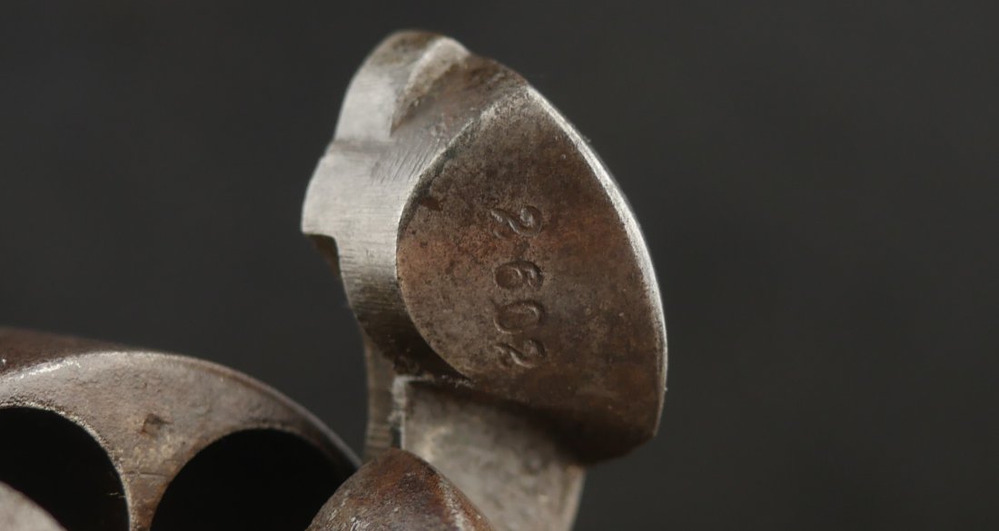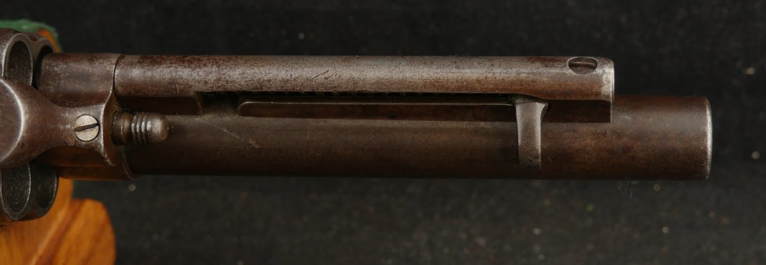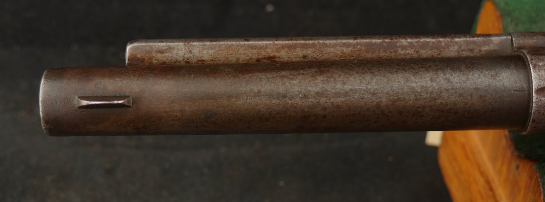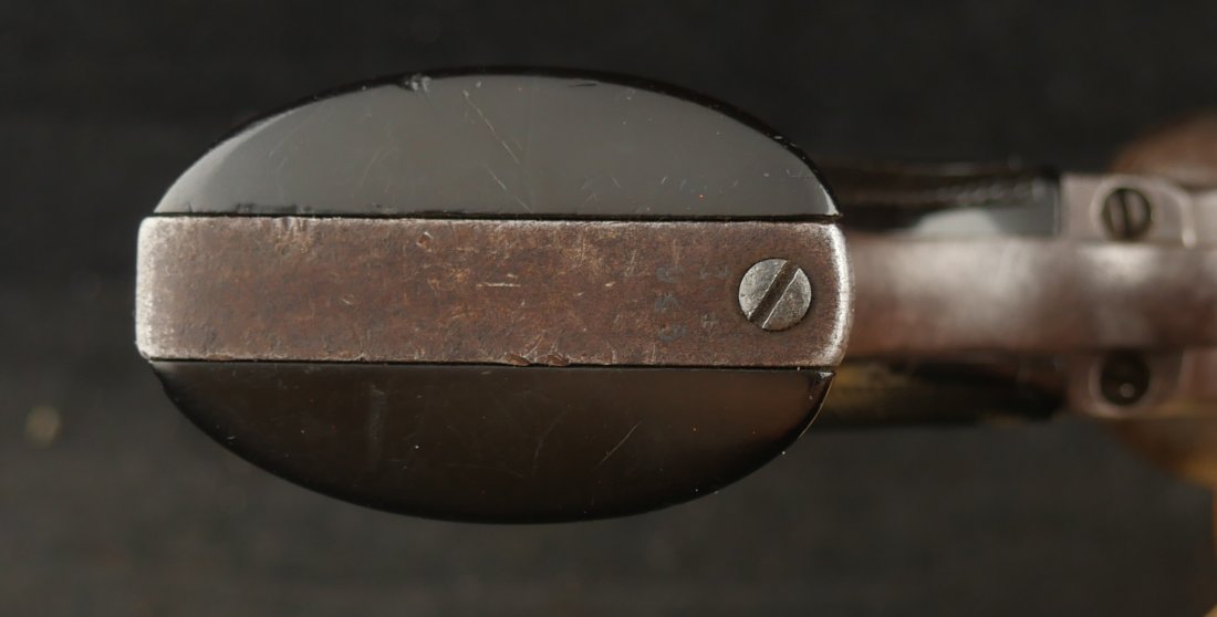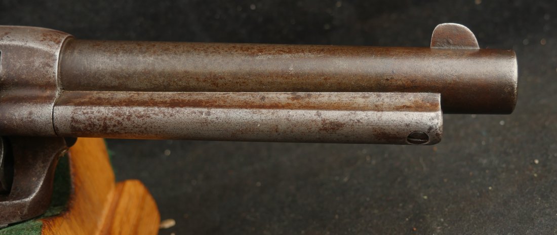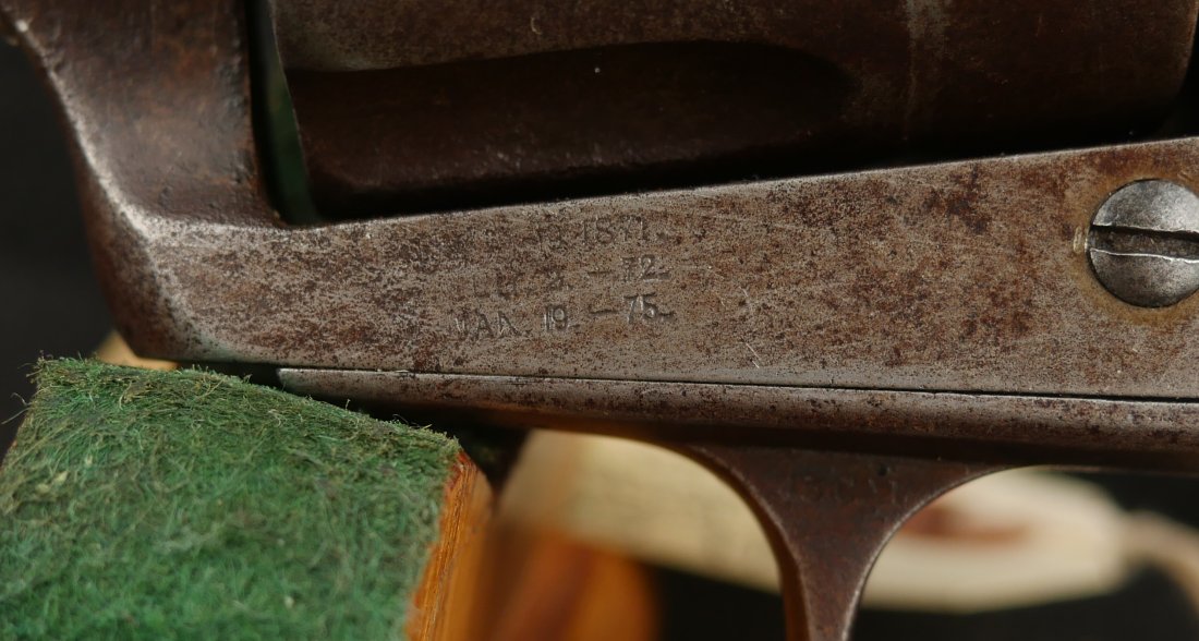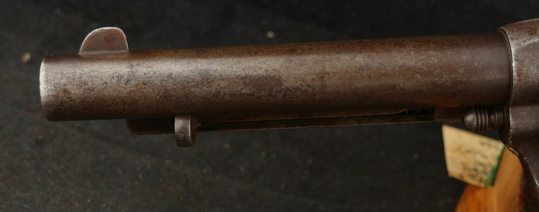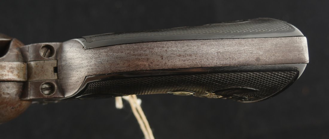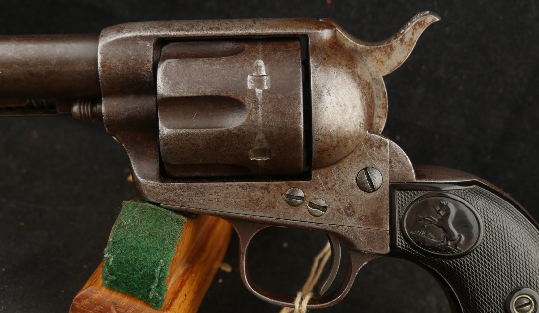 079-1225-9360, Colt SA .45 with 5 1/2 inch barrel and original gutt percha eagle grips. #104xxx made in 1884. All exterior numbers match including cylinder and barrel. The exterior is mottled dark gray patina with traces of nickel remaining. Under the ejector rod housing is strong flashes of original nickel, showing the gun was originally nickeled. The markings are clear, it is basically untouched with the only exception being 2 possible replaced screws. The action is crisp, the gun shows years of honest carry usage. The bore is fully rifled with fine surface residue and scattered very shallow spots. The barrel address is single line and fully legible, I have not gotten a letter for this gun at this time. It came from a Rancher out of Arizona who had this gun in his family since his grand father and was carried daily for over 50 years.