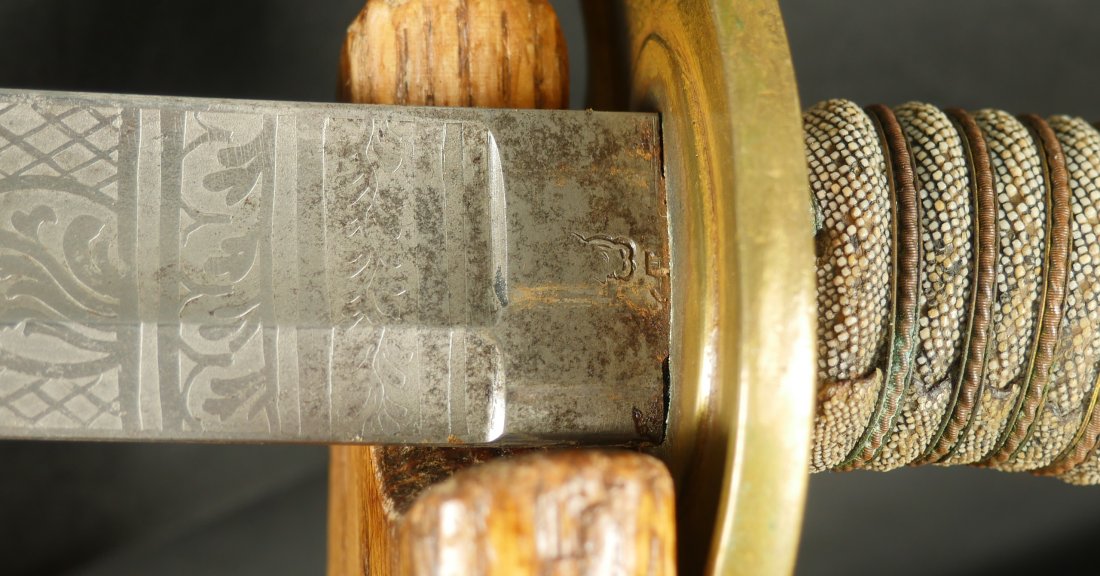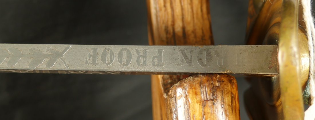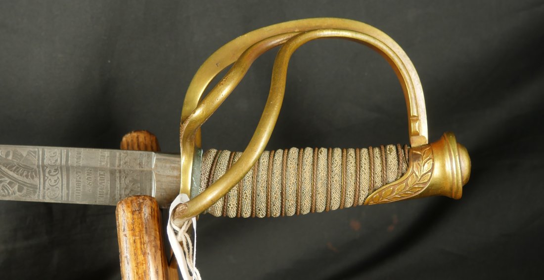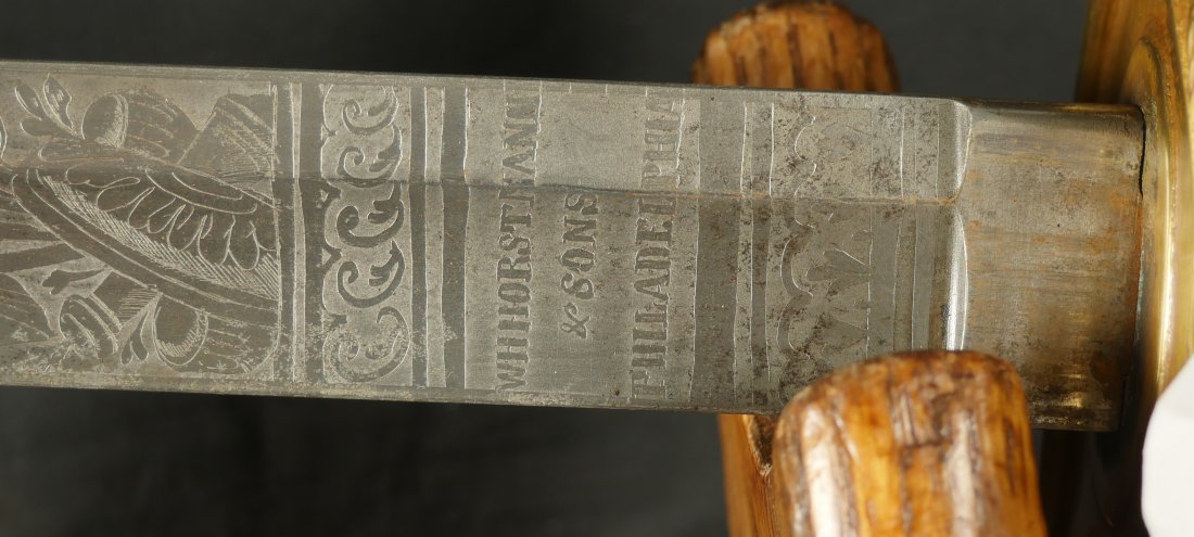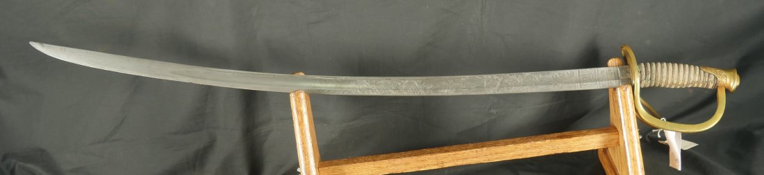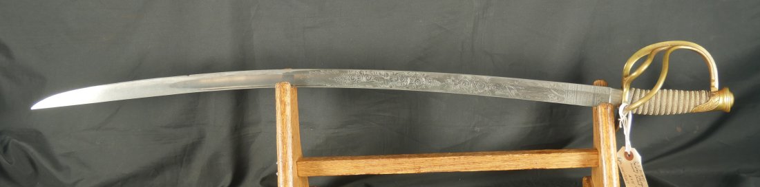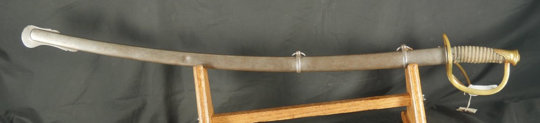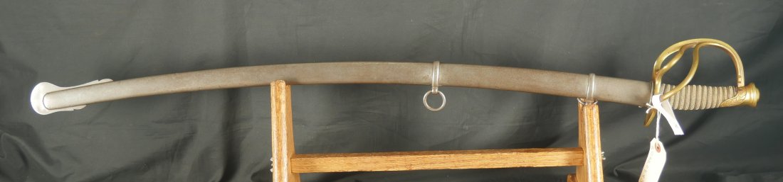 079-1225-9367, US M-1840 Heavy Cavalry Sword and Scabbard, by Horstmann & Sons of Philadelphia with fully visible maker name and fully visible etching on the blade and IRON PROOF marked on the blade edge. The blade has no chips along the blade edge. The blade has been lightly cleaned at some point. The brass knuckle guard is engraved and shows 98% original ray skin handle wrap along with 100% brass wire wrap on handle. Very good to fine overall. There is one dent in the blade scabbard. Soldiers did this on blades they carried into battle. This was done to prevent blades from rattling in the scabbards when on horseback. The scabbard slides off the blade when held upright. This is a sign of a blade that was carried into battle. The blade sword and scabbard is 40 inches from end of drag to end of handle. Very good overall.