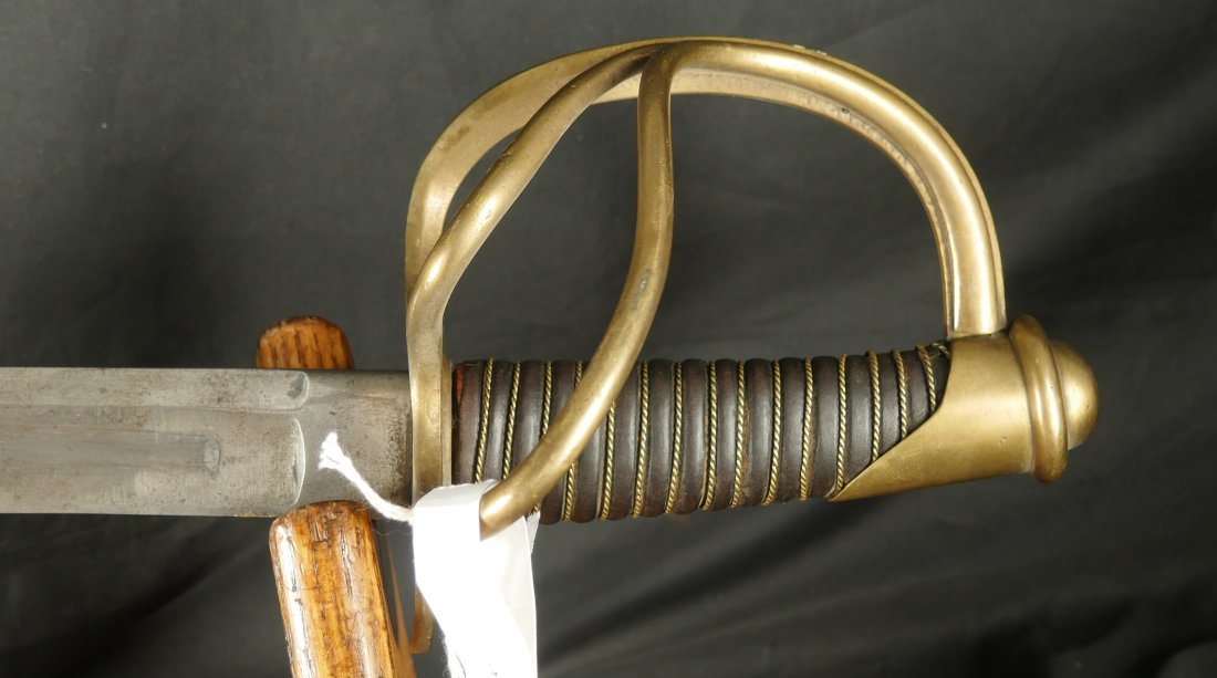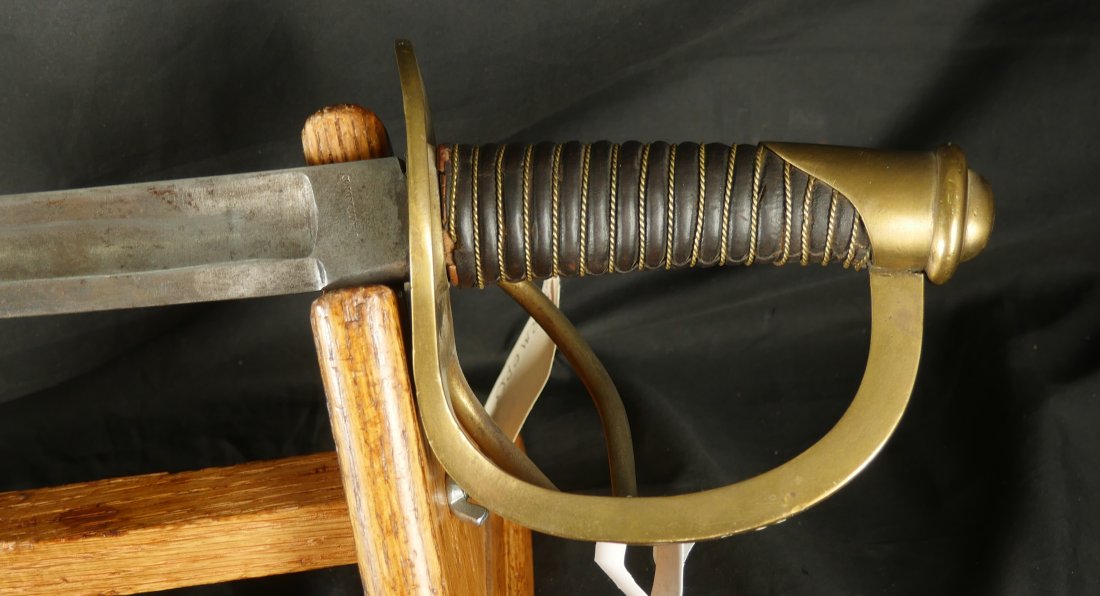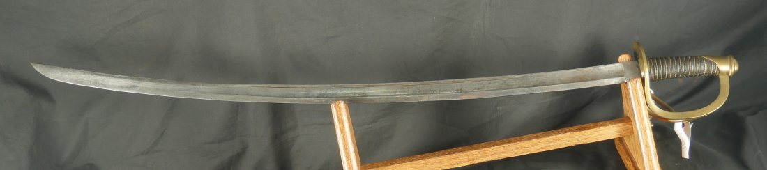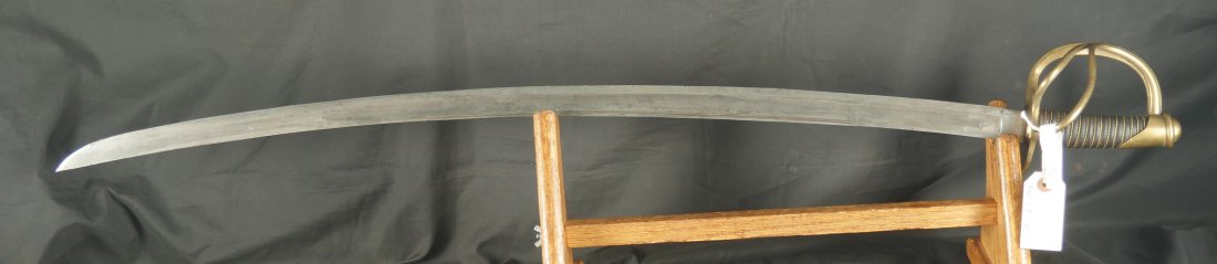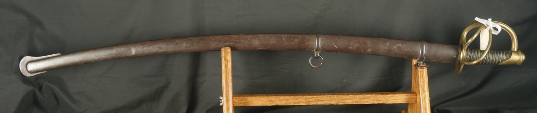 079-1225-9368, M-1840 Cavalry Sword and Scabbard with 98% leather wrap, 100% wire. The brass knuckle guard shows rich, never cleaned patina. It has a maker name on the ricasso. The visible numbers are deeply stamped, ?ANKON? The blade is mottled gray with a couple minor nicks along the knife edge. The scabbard has a rich dark patina with a few tiny patches of fine pinpricks at the drag. One minor dent in the scabbard. Very good overall. These were replaced with the lighter M-1860 swords during the Civil War.